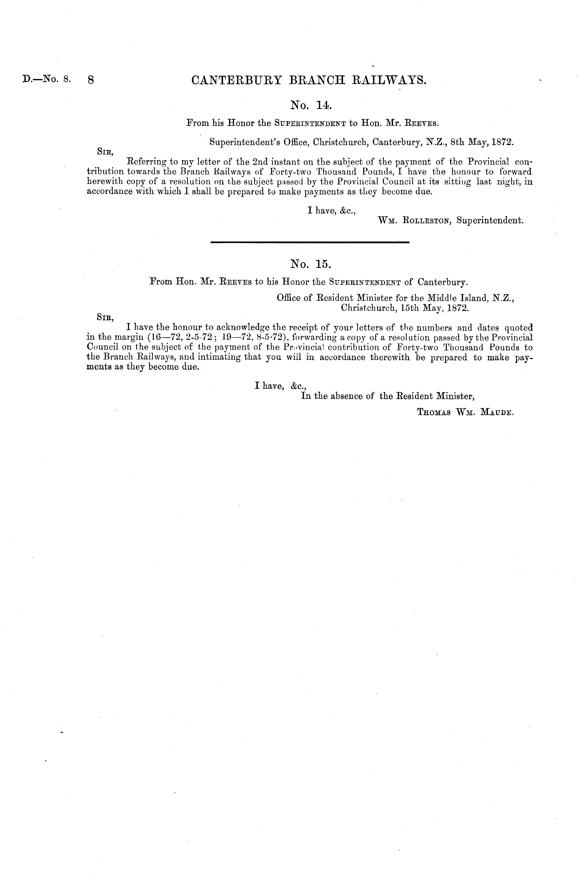 No. 14. From his Honor the Supeeintendent to Hon. Mr. Eeeyes. Superintendent's Office, Christchurch, Canterbury, N.Z., Bth May, 1872. Sic, Eeferring to my letter of the 2nd instant on the subject of the payment of the Provincial contribution towards the Branch Railways of Forty-two Thousand Pounds, I have the honour to forward herewith copy of a resolution on the subject passed by the Provincial Council at its sitting last night, in accordance with which I shall be prepared to make payments as they become due. I have, &c, Wm. Eolleston, Superintendent.