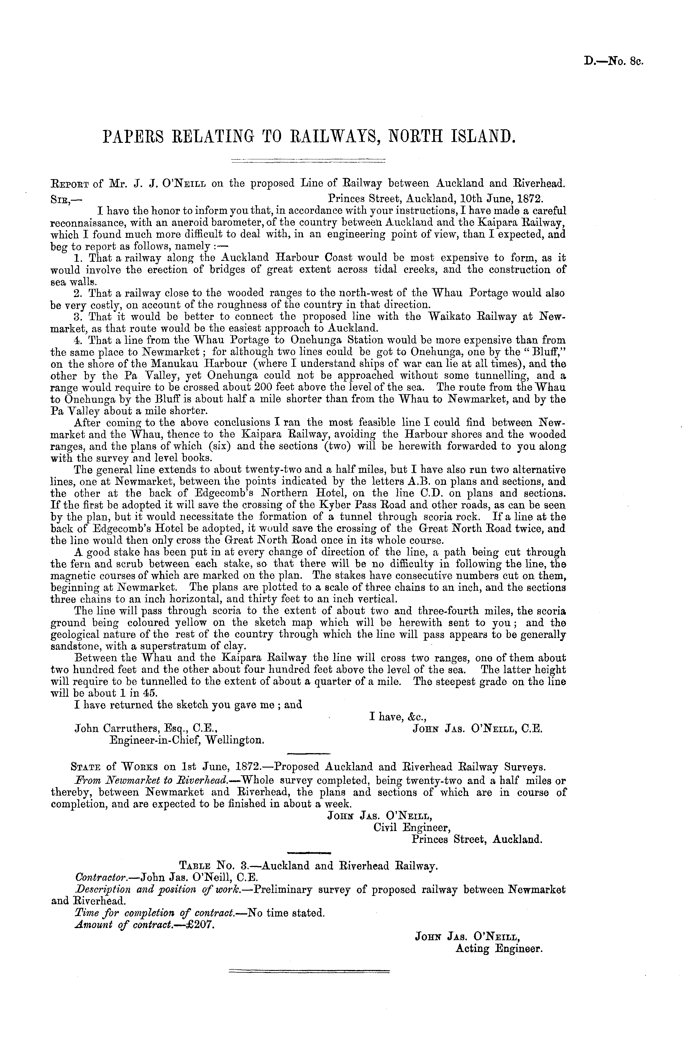 Report of Mr. J. J. O'Neill on the proposed Line of Railway between Auckland and Riverhead. Sic, — Princes Street, Auckland, 10th June, 1872. I have the honor to inform you that, in accordance with your instructions, I have made a careful reconnaissance, with an aneroid barometer, of the country between Auckland and the Kaipara Railway, which I found much more difficult to deal with, in an engineering point of view, than I expected, and beg to report as follows, namely : — 1. That a railway along the Auckland Harbour Coast would be most expensive to form, as it would involve tho erection of bridges of great extent across tidal creeks, and the construction of sea walls. 2. That a railway close to the wooded ranges to the north-west of the "Whau Portage would also be very costly, on account of the roughness of the country in that direction. 3. That it would be better to connect the proposed line with tho "Waikato Railway at Newmarket, as that route would be the easiest approach to Auckland. 4. That a line from the Whau Portage to Onehunga Station would be more expensive than from the same place to Newmarket; for although two lines could be got to Onehunga, one by the " Bluff," on the shore of the Manukau Harbour (where I understand ships of war can lie at all times), and the other by the Pa Valley, yet Onehunga could not be approached without some tunnelling, and a range would require to be crossed about 200 feet above the level of the sea. The route from the Whau to Onehunga by the Bluff is about half a mile shorter than from the Whau to Newmarket, and by the Pa Valley about a mile shorter. After coming to the above conclusions I ran the most feasible line I could find between Newmarket and the Whau, thence to the Kaipara Railway, avoiding the Harbour shores and the wooded ranges, and the plans of which (six) and the sections (two) will be herewith forwarded to you along with the survey and level books. The general line extends to about twenty-two and a half miles, but I have also run two alternative lines, one at Newmarket, between the points indicated by the letters A.B. on plans and sections, and the other at the back of Edgecomb's Northern Hotel, on the line CD. on plans and sections. If the first be adopted it will save the crossing of the Kyber Pass Road and other roads, as can be seen by the plan, but it would necessitate the formation of a tunnel through scoria rock. If a line at the back of Edgecomb's Hotel be adopted, it would save the crossing of the Great North Road twice, and the line would then only cross the Great North Road once in its whole course. A good stake has been put in at every change of direction of the line, a path being cut through the fern and scrub between each stake, so that there will be no difficulty in following the line, the magnetic courses of which are marked on the plan. The stakes have consecutive numbers cut on them, beginning at Newmarket. The plans are plotted to a scale of three chains to an inch, and the sections three chains to an inch horizontal, and thirty feet to an inch vertical. The line will pass through scoria to the extent of about two and three-fourth miles, the scoria ground being coloured yellow on the sketch map which will be herewith sent to you ; and the geological nature of the rest of the country through which the line will pass appears to be generally sandstone, with a superstratum of clay. Between the Whau and the Kaipara Railway the line will cross two ranges, one of them about two hundred feet and the other about four hundred feet above the level of the sea. The latter height will require to be tunnelled to the extent of about a quarter of a mile. The steepest grade on the line will be about 1 in 45. I have returned the sketch you gave me ; and I have, Ac, John Carruthers, Esq., C.E., John Jas. O'Neill, C.E. Engineer-in-Chief, Wellington.