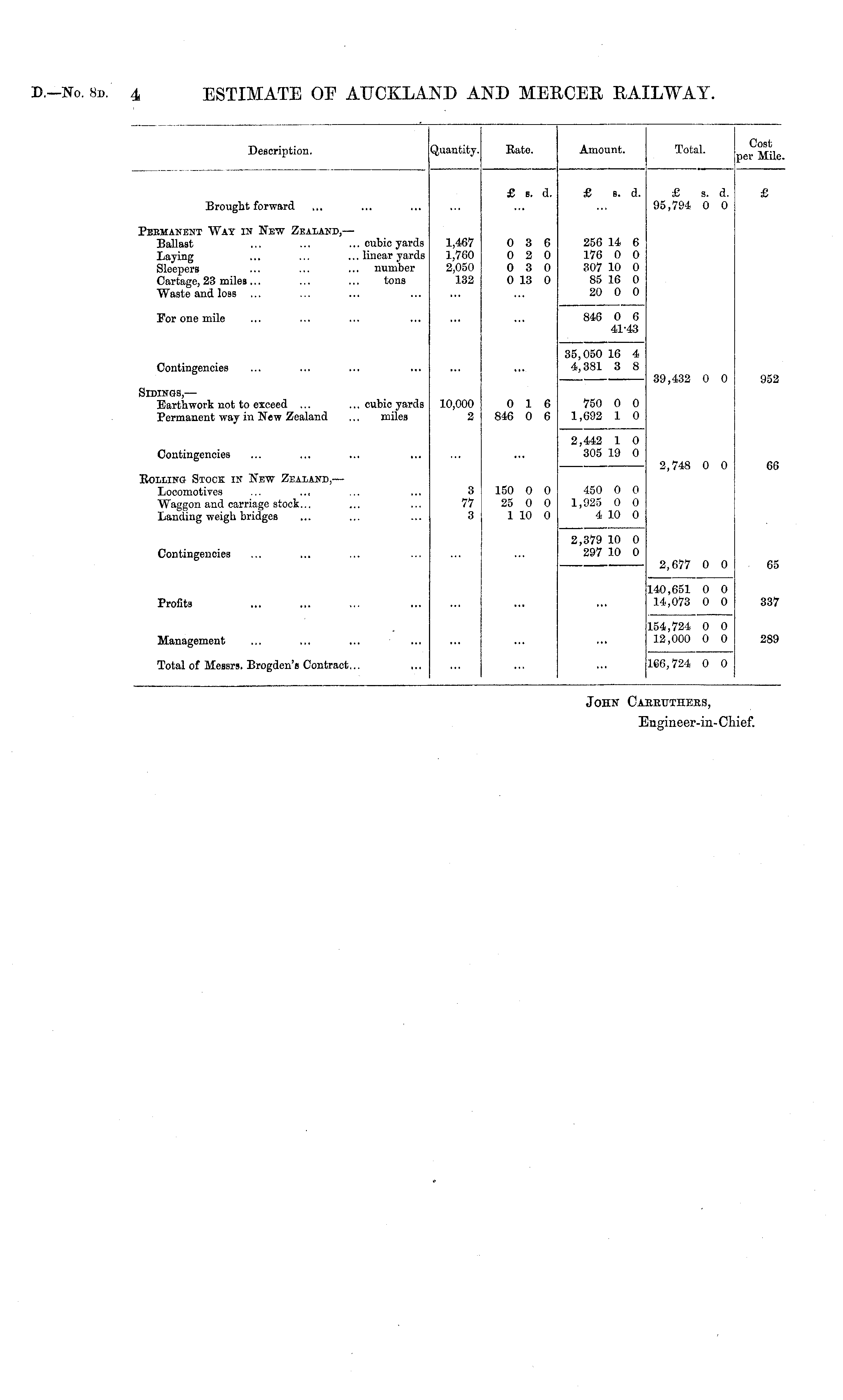 Description. QuantityJ Rate. Amount. Total. | Cost |per Mile. £ s. d. £ b. d. £ a. d. 95,794 0 0 Brought forward Permanent Way in New Zealand, — Ballast ... ... ... cubic yards Laying ... ... ... linear yards Sleepers ... ... ... number Cartage, 23 miles... ... ... tons Waste and Iobs ... 1,467 1,760 2,050 132 0 3 6 0 2 0 0 3 0 0 13 0 256 14 6 176 0 0 307 10 0 85 16 0 20 0 0 Eor one mile 846 0 6 41-43 Contingencies 35,050 16 4 4,381 3 8 39,432 0 0 952 Sidings,— Earthwork not to exceed ... ... cubic yards Permanent way in New Zealand ... miles 10,000 2 0 16 846 0 6 750 0 0 1,692 1 0 Contingencies 2,442 1 0 305 19 0 2,748 0 0 66 Rolling Stock in New Zealand, — Locomotives Waggon and carriage stock... Landing weigh bridges 3 77 3 150 0 0 25 0 0 1 10 0 450 0 0 1,925 0 0 4 10 0 Contingencies 2,379 10 0 297 10 0 2,677 0 0 140,651 0 0 14,073 0 0 65 Profits 337 154,724 0 0 12,000 0 0 289 Management Total of Messrs. Brogden's Contract... 166,724 0 0 John Ca; EEUTHERS, Ingineer-in- Chief.