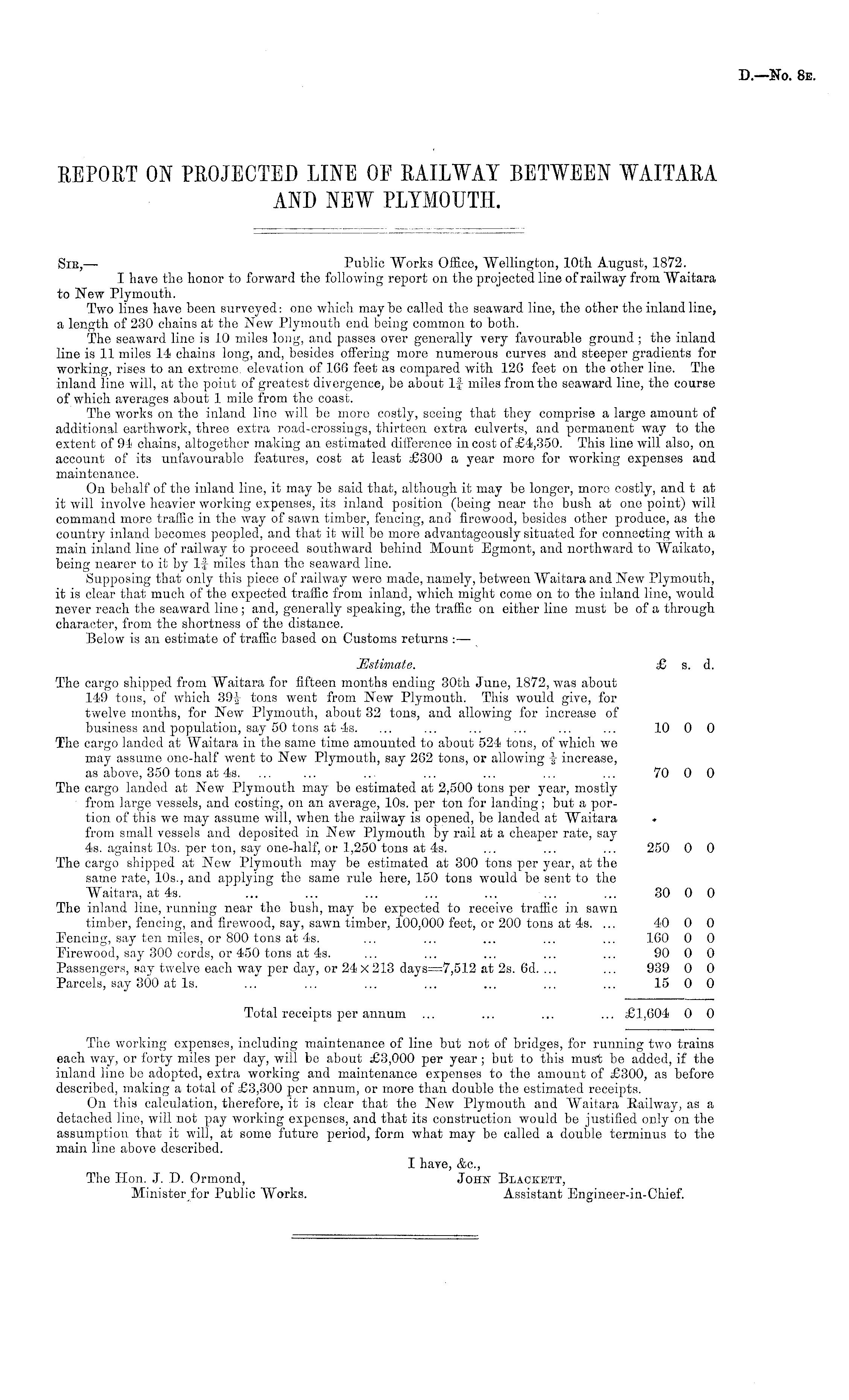 REPORT ON PROJECTED LINE OF RAILWAY BETWEEN WAITARA AND NEW PLYMOUTH.