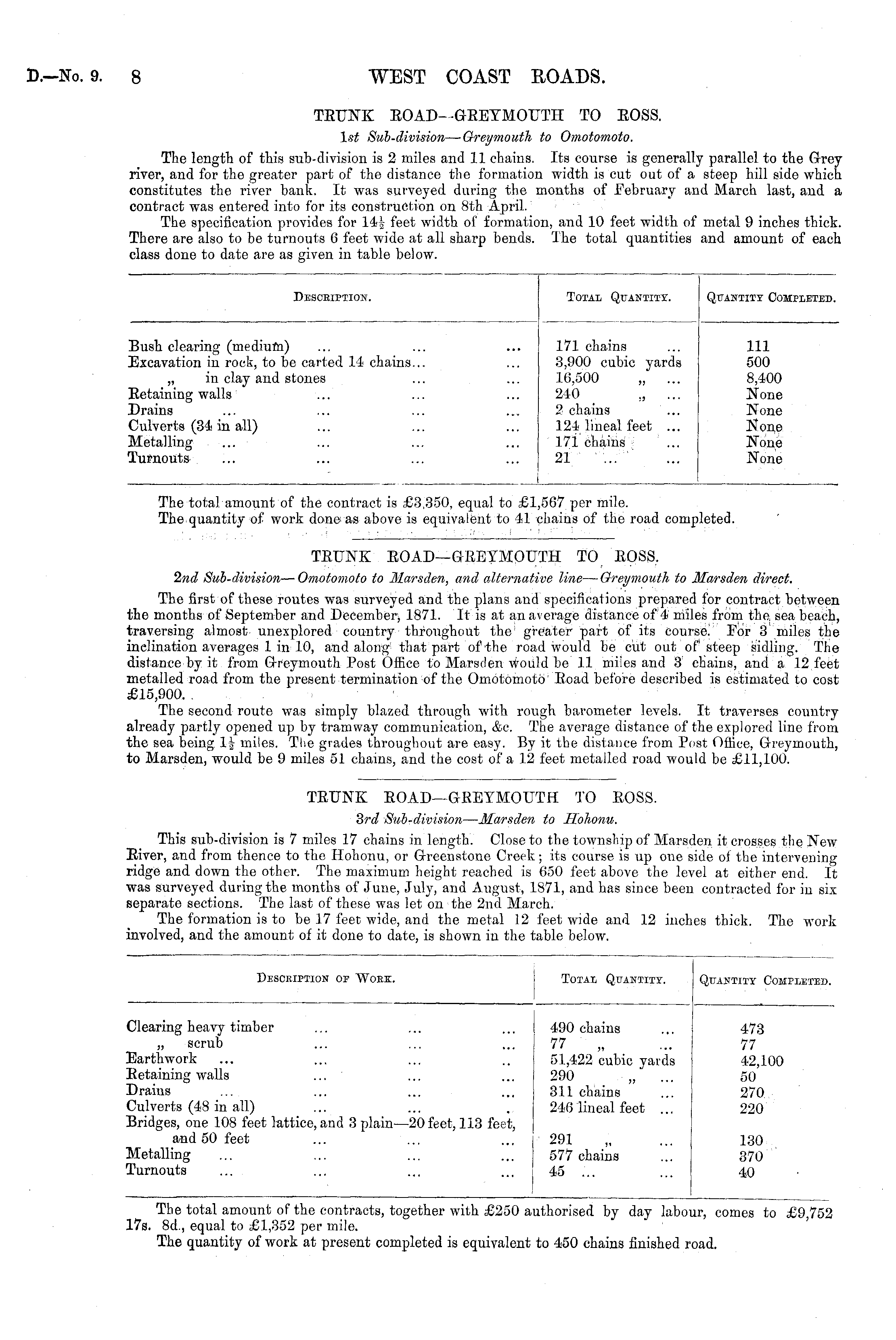 TRUNK ROAD—GREYMOUTH TO ROSS. 3rd Siib-division — Marsden to Uohonu. This sub-division is 7 miles 17 chains in length. Close to the township of Marsden it crosses the New River, and from thence to the Hohonu, or Greenstone Creek; its course is up one side of the intervening ridge and down the other. The maximum height reached is 650 feet above the level at either end. It was surveyed during the months of June, July, and August, 1871, and has since been contracted for in six separate sections. The last of these was let on the 2nd March. The formation is to be 17 feet wide, and the metal 12 feet wide and 12 inches thick. The work involved, and the amount of it done to date, is shown in the table below.