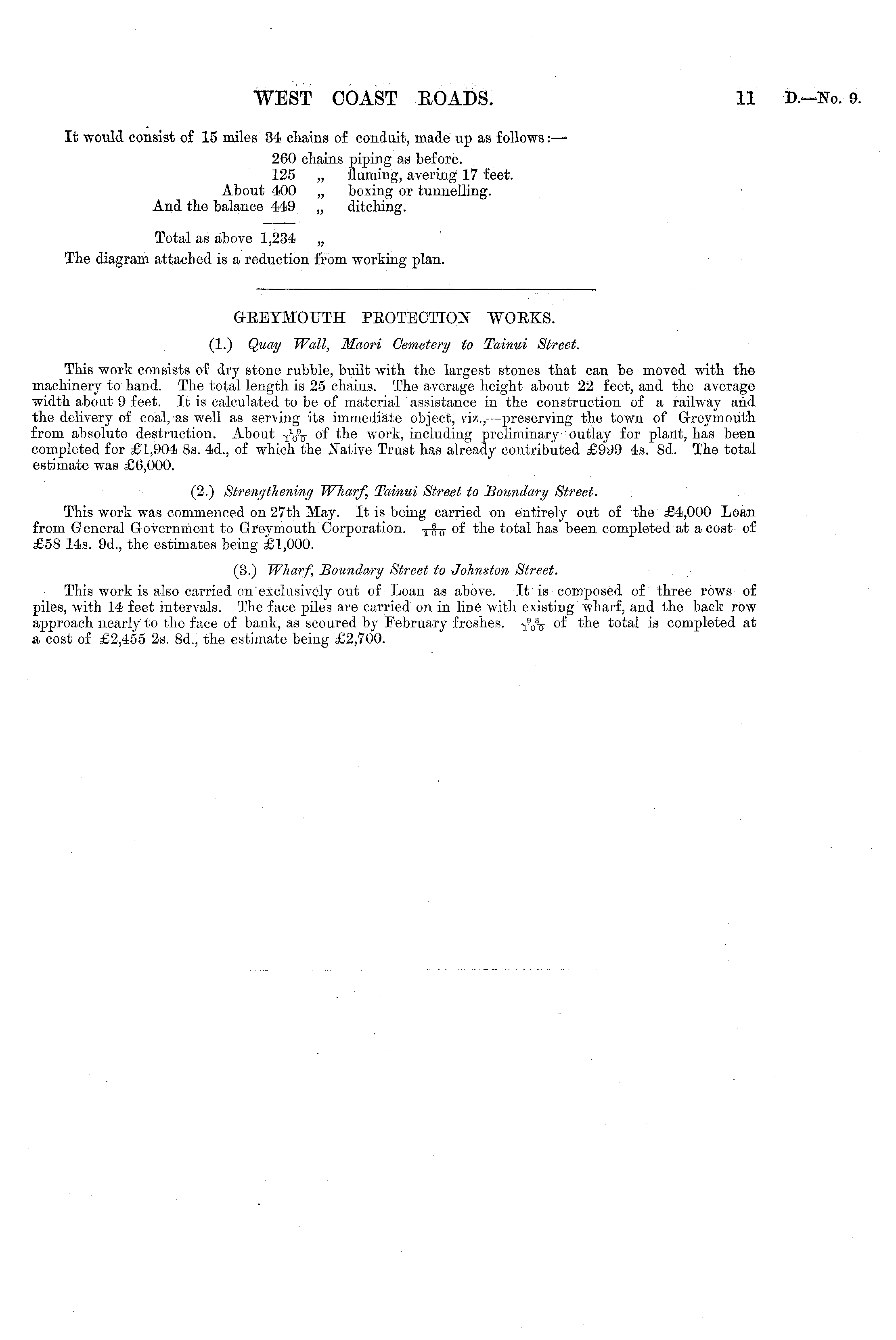 GEEYMOITTH PEOTECTION WORKS. (1.) Quay Wall, Maori Cemetery to Tainui Street. This work consists of dry stone rubble, built with the largest stones that can be moved with the machinery to hand. The total length is 25 chains. The average height about 22 feet, and the average width about 9 feet. It is calculated to be of material assistance in the construction of a railway and the delivery of coal, as well as serving its immediate object, viz., —preserving the town of Greymouth from absolute destruction. About y-jV of the work, including preliminary outlay for plant, has been completed for £1,904 8s. 4d., of which the Native Trust has already contributed £999 4s. 8d. The total estimate was £6,000. (2.) Strengthening Wharf, Tainui Street to Boundary Street. This work was commenced on 27th May. It is being carried on entirely out of the £4,000 Loan from General Government to Greymouth Corporation. y$^ of the total has been completed at a cost of £58 14s. 9d., the estimates being £1,000. (3.) Wharf, Boundary Street to Johnston Street. This work is also carried on exclusively out of Loan as above. It is composed of three rows of piles, with 14 feet intervals. The face piles are carried on in line with existing wharf, and the back row approach nearly to the face of bank, as scoured by February freshes. T 9 Ō % of the total is completed at a cost of £2,455 2s. 8d., the estimate being £2,700.