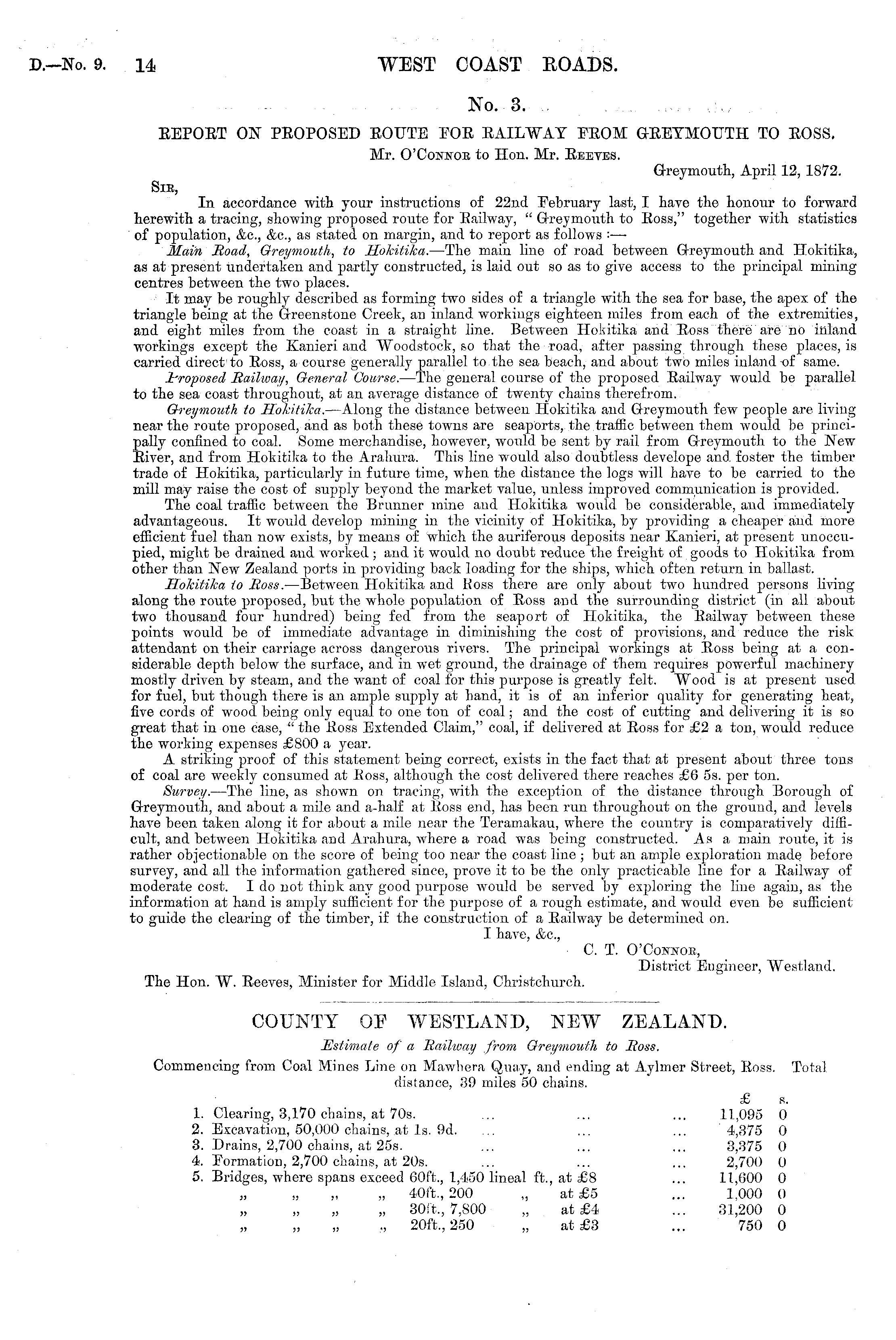No. 3. . EEPOET ON PEOPOSED EOTJTE FOE EAILWAY FEOM GEEYMOTJTH TO EOSS. Mr. O'Comob to Hon. Mr. Beeves. Greymouth, April 12, 1872. Sib, In accordance with your instructions of 22nd February last, I have the honour to forward herewith a tracing, showing proposed route for Eailway, " Greymouth to Boss," together with statistics of population, &c, &c, as stated on margin, and to report as follows : —• Main Road, Oreymouth, to Hokitika. —The main line of road between Greymouth and ITokitika, as at present undertaken and partly constructed, is laid out so as to give access to the principal mining centres between the two places. It may be roughly described as forming two sides of a triangle with the sea for base, the apex of the triangle being at the Greenstone Creek, an inland workings eighteen miles from each of the extremities, and eight miles from the coast in a straight line. Between Hokitika and Boss there are no inland workings except the Kanieri and Woodstock, so that the road, after passing through these places, is carried direct to Eoss, a course generally parallel to the sea beach, and about two miles inland of same. 2'roposed Railway, General Course. —The general course of the proposed Eailway would be parallel to the sea coast throughout, at an average distance of twenty chains therefrom. Oreymouth to Hokitika. —Along the distance between Hokitika and Greymouth few people are living near the route proposed, and as both these towns are seaports, the traffic between them would be principally confined to coal. Some merchandise, however, would be sent by rail from Greymouth to the New Eiver, and from Hokitika to the Arahura. This line would also doubtless develope and foster the timber trade of Hokitika, particularly in future time, when the distance the logs will have to be carried to the mill may raise the cost of supply beyond the market value, unless improved communication is provided. The coal traffic between the Brunner mine and Hokitika would be considerable, and immediately advantageous. It would develop mining in the vicinity of Hokitika, by providing a cheaper and more efficient fuel than now exists, by means of which the auriferous deposits near Kanieri, at present unoccupied, might be drained and worked ; and it would no doubt reduce the freight of goods to Hokitika from other than New Zealand ports in providing back loading for the ships, which often return in ballast. Hokitika to Ross. —Between Hokitika and Koss there are only about two hundred persons living along the route proposed, but the whole population of Eoss and the surrounding district (in all about two thousand four hundred) being fed from the seaport of Hokitika, the Eailway between these points would be of immediate advantage in diminishing the cost of provisions, and reduce the risk attendant on their carriage across dangerous rivers. The principal workings at Eoss being at a considerable depth below the surface, and in wet ground, the drainage of them requires powerful machinery mostly driven by steam, and the want of coal for this purpose is greatly felt. Wood is at present used for fuel, but though there is an ample supply at hand, it is of an inferior quality for generating heat, five cords of wood being only equal to one ton of coal; and the cost of cutting and delivering it is so great that in one case, " the lioss Extended Claim," coal, if delivered at Eoss for £2 a ton, would reduce the working expenses £800 a year. A striking proof of this statement being correct, exists in the fact that at present about three tons of coal are weekly consumed at Hoss, although the cost delivered there reaches £6 5s. per ton. Survey. —The line, as shown on tracing, with the exception of the distance through Borough of Greymouth, and about a mile and a-half at Boss end, has been run throughout on the ground, and levels have been taken along it for about a mile near the Teramakau, where the country is comparatively difficult, and between Hokitika and Arahura, where a road was being constructed. As a main route, it is rather objectionable on the score of being too near the coast line ; but an ample exploration made before survey, and all the information gathered since, prove it to be the only practicable line for a Eailway of moderate cost. I do not think any good purpose would be served by exploring the line again, as the information at hand is amply sufficient for the purpose of a rough estimate, and would even be sufficient to guide the clearing of the timber, if the construction of a Eailway be determined on. I have, &c, C. T. O'Connor, District Engineer, Westland. The Hon. W. Eeeves, Minister for Middle Island, Christchurch.