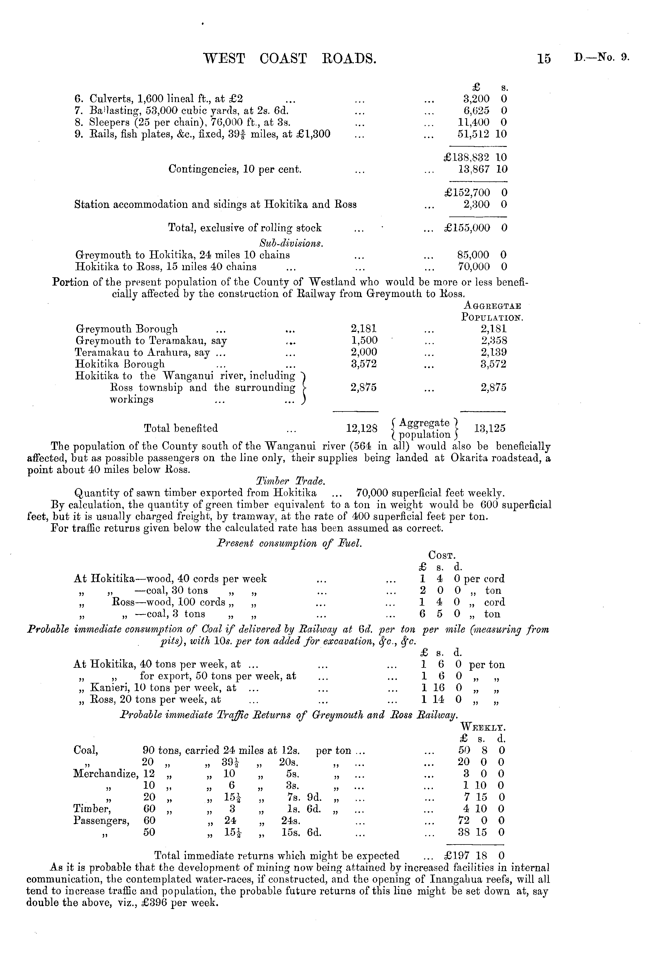 £ s. 6. Culverts, 1,600 lineal ft., at £2 ... ... ... 3,200 0 7. Ballasting, 53,000 cubic yards, at 2s. 6d. ... ... 6,625 0 8. Sleepers (25 per chain), 76,000 ft., at 3s. ... ... 11,400 0 9. Bails, fish plates, &c, fixed, 391 miles, at £1,300 ••• ... 51,51210 £138,832 10 Contingencies, 10 per cent. ... ... 13,867 10 £152,700 0 Station accommodation and sidings at Hokitika and Ross ... 2,300 0 Total, exclusive of rolling stock ... ' ... £155,000 0 Sub-divisions. Greymouth to Hokitika, 24 miles 10 chains ... ... 85,000 0 Hokitika to Ross, 15 miles 40 chains ... ... ... 70,000 0 Portion of the present population of the County of Westland who would be more or less beneficially affected by the construction of Railway from Greymouth to Ross. Aggbegtae Population. Greymouth Borough ... ... 2,181 ... 2,181 G-revmouth to Teramakau, say ... 1,500 ... 2,358 Teramakau to Arahura, say ... ... 2,000 ... 2,139 Hokitika Borough ... ... 3,572 ... 3,572 Hokitika to the Wanganui river, including ~) Ross township and the surrounding > 2,875 ... 2,875 workings ... ... ) Total benefited ... 12,128 \ Aggregate ) 13 125 (population) ' The population of the County south of the Wanganui river (564 in all) would also be beneficially affected, but as possible passengers on the line only, their supplies being landed at Okarita roadstead, a point about 40 miles below Ross. Timber Trade. Quantity of sawn timber exported from Hokitika ... 70,000 superficial feet weekly. By calculation, the quantity of green timber equivalent to a ton in weight would be 600 superficial feet, but it is usually charged freight, by tramway, at the rate of 400 superficial feet per ton. For traffic returns given below the calculated rate has been assumed as correct. Present consumption of Fuel. Cost. £ s. d. At Hokitika- —wood, 40 cords per week ... ... 14 0 per cord „ „ —coal, 30 tons „ „ ... ... 2 0 0,, ton „ Boss—wood, 100 cords „ „ ... ... 14 0,, cord „ „ ■ —coal, 3 tons „ „ ... ... 6 5 0,, ton Probable immediate consumption of Goal if delivered by Railioay at &d. per ton per mile (measuring from pits), with 10s. per ton added for excavation, Sfc, Sfc. £ s. d. At Hokitika, 40 tons per week, at ... ... ... 160 per ton „ „ for export, 50 tons per week, at ... ... 16 0,,,, „ Kanieri, 10 tons per week, at ... ... ... 1 16 0 „ „ „ Ross, 20 tons per week, at ... ... ... 1 14 0 „ „ Probable immediate Traffic Returns of Oreymouth and Ross Railway. Weekly. £ s. d. Coal, 90 tons, carried 24 miles at 12s. per ton... ... 50 8 0 20 „ „ 39J „ 20s. „ ... ... 20 0 0 Merchandize, 12 „ „10 „ 5s. „ ... ... 3 0 0 10 „ „ 6 „ 3s. „ ... ... 1 10 0 20 „ „ 15i „ 7s. 9d. „ ... ... 7 15 0 Timber, 60 „ „ 3 „ Is. 6d. „ ... ... 4 10 0 Passengers, 60 „ 24 „ 24s. ... ... 72 0 0 „ 50 „ 15|t „ 15s. 6d. ... ... 38 15 0 Total immediate returns which might be expected ... £197 18 0 As it is probable that the development of mining now being attained by increased facilities in internal communication, the contemplated water-races, if constructed, and the opening of Inangahua reefs, will all tend to increase traffic and population, the probable future returns of this line might be set down at, say double the above, viz., £396 per week.