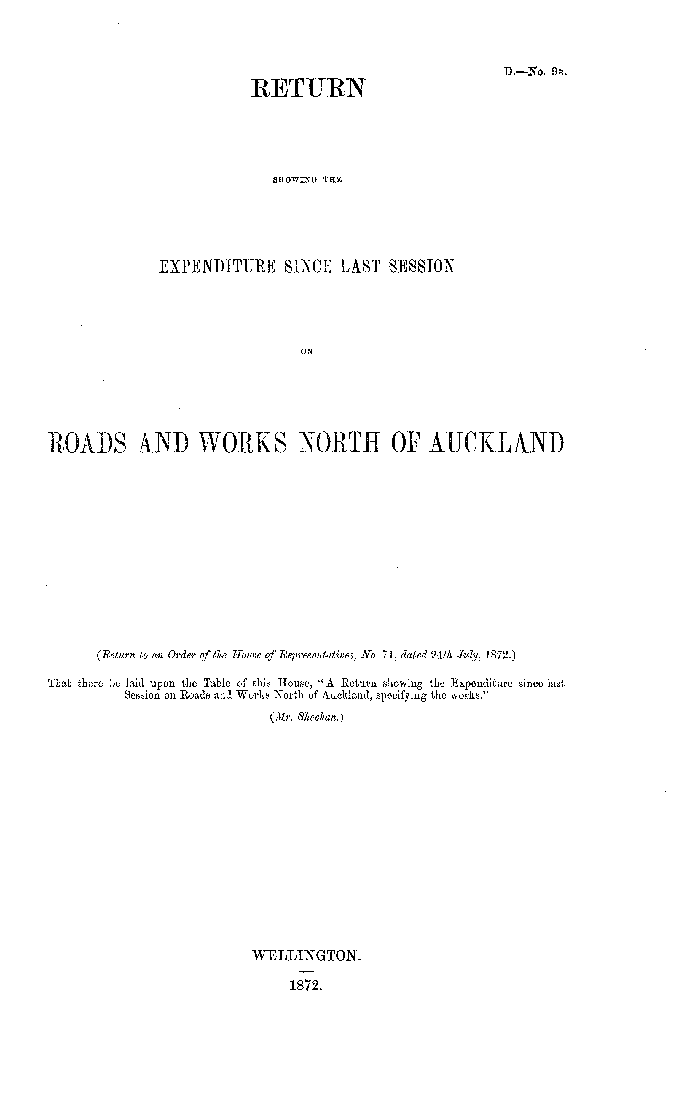 RETURN SHOWING THE EXPENDITURE SINCE LAST SESSION ON ROADS AND WORKS NORTH OF AUCKLAND (Return to an Order of the House of Representatives, No. 71, dated 24sth July, 1872.)