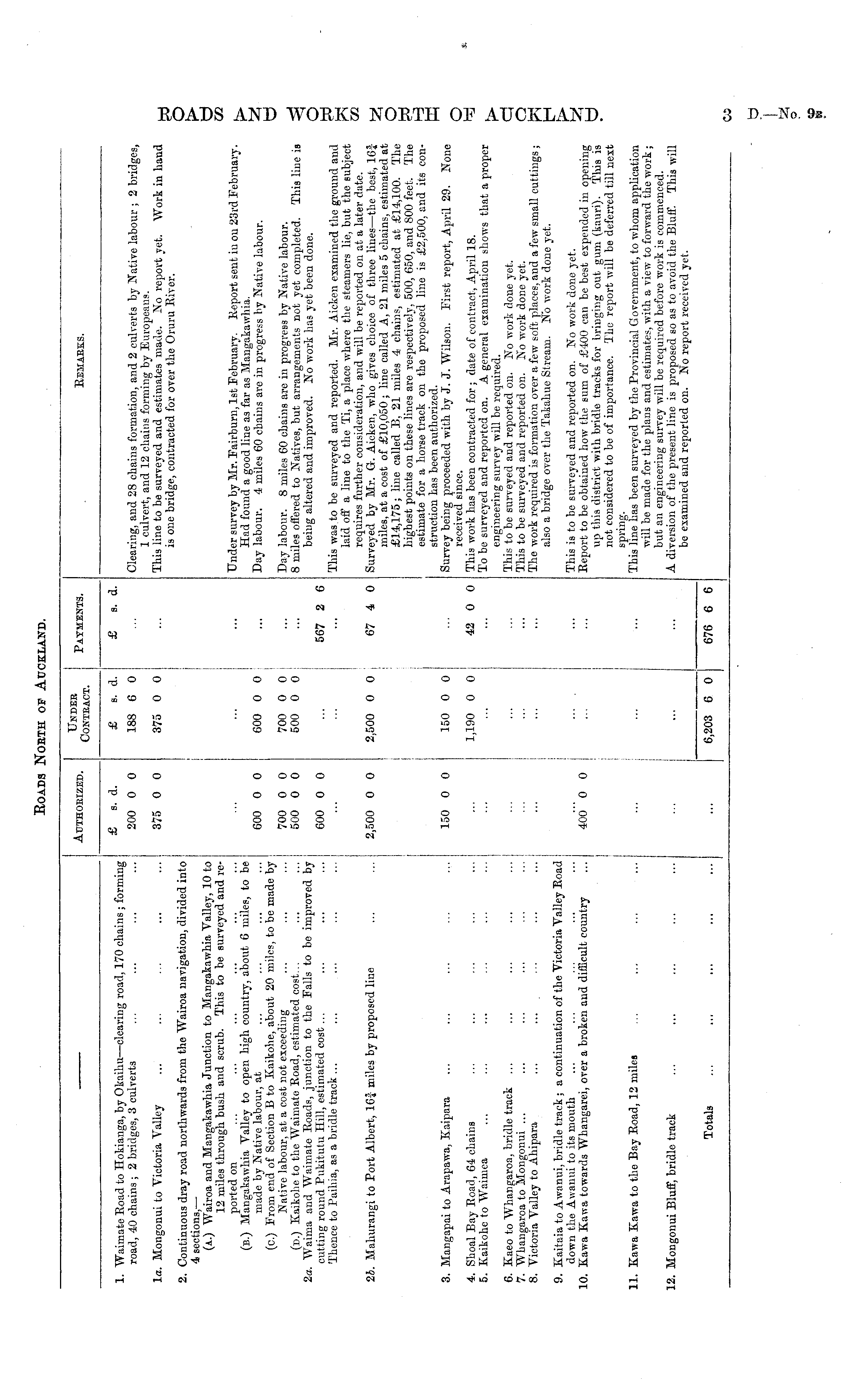 Authorized. Under Contract. i I I Payments. Remarks. 1. Waimate Road to Hokianga, by Okaihu —clearing road, 170 chains; forming road, 40 chains; 2 bridges, 3 culverts £ a. d. 200 0 0 £ a. d. I £ a. d. 188 6 0 375 0 0 600 0 0 la. Mongonui to Victoria Talley ... ... ... ... ... ! 375 0 0 Clearing, and 28 chains formation, and 2 culverts by Native labour ; 2 bridges, 1 culvert, and 12 chains forming by Europeans. This line to be surveyed and estimates made. IN To report yet. Work in hand is one bridge, contracted for over the Oruru River. 2. Continuous dray road northwards from the Wairoa navigation, divided into 4 sections, — (a.) Wairoa and Mangakawhia Junction to Mangakawhia Valley, 10 to 12 miles through bush and scrub. This to be surveyed and reported on (b.) Mangakawhia Valley to open high country, about 6 miles, to be made by Native labour, at (c.) From end of Section B to Kaikohe, about 20 miles, to be made by Native labour, at a cost not exceeding ... ... ... (d.) Kaikohe to the Waimate Road, estimated cost... la. Wainia and Waimate Roads, junction to the Falls to be improved by cutting round Pukitutu Hill, estimated cost... Thence to 1'aihia, as a bridle track ... 600 0 0 700 0 0 500 0 0 600 0 0 Under survey by Mr. Fairburn, 1st February. Report sent in on 23rd February. Had found a good line as far as Mangakawhia. Day labour. 4 miles 60 chains are in progress by Native labour. 700 0 0 500 0 0 Day labour. 8 miles 60 chains are in progress by Native labour. 8 miles offered to Natives, but arrangements not yet completed. This line is being altered and improved. No work has yet been done. 567 2 6 This was to be surveyed and reported. Mr. Aicken examined the ground and laid off a line to the Ti, a place where the steamers lie, but the subject requires further consideration, and will be reported on at a later date. Surveyed by Mr. G. Aicken, who gives choice of three lines —the best, 16J miles, at a cost of £10,050 ; line called A, 21 miles 5 chains, estimated at £14,175; line called B, 21 miles 4 chains, estimated at £14,100. The highest points on these lines are respectively, 500, 650, and 800 feet. The estimate for a horse track on the proposed line is £2,500, and its construction has been authorized. Survey being proceeded with by J. J. Wilson. First report, April 29. None received since. This work has been contracted for; date of contract, April 18. To be surveyed and reported on. A general examination shows that a proper engineering survey will be required. This to be surveyed and reported on. No work done yet. This to be surveyed and reported on. No work done yet. The work required is formation over a few soft places, and a few small cuttings; also a bridge over the Takahue Stream. No work done yet. 2b. Mahurangi to Port Albert, 16 J miles by proposed line 2,500 0 0 2,500 0 0 i 67 4 0 3. Mangapai to Arapawa, Kaipara 150 0 0 150 0 0 I 4. Shoal Bay Eoad, 64 chains 5. Kaikohe to AVaimca 1,190 0 0 | 42 0 0 6. Kaeo to Whangaroa. bridle track ... ... ... ... ... | 7. Whangaroa to Mongonui ... ... ... ... ... ... | 8. Victoria Valley to Ahipara ... ... ... ... ... ... I i 9. Kaitaia to Awanui, bridle track ; a continuation of the Victoria Valley Road down the Awanui to its mouth 10. Kawa Kawa towards Whangarei, over a broken and difficult country 4o6"o 0 i This is to be surveyed and reported on. No work done yet. Report to be obtained how the sum of £400 can be best expended in opening up this district with bridle tracks for bringing out gum (kauri). This is not considered to bo of importance. The report will be deferred till next spring. This line has been surveyed by the Provincial Government, to whom application will be made for the plans and estimates, with a view to forward the work; but an engineering survey will be required before work is commenced. A diversion of the present lino is proposed so as to avoid the Bluff. This wiil bo examined and reported on. No report received yet. i 11. Kawa Kawa to the Bay Road, 12 miles .2. Mongonui Bluff, bridle track Totals | 6,203 6 0 676 6 6