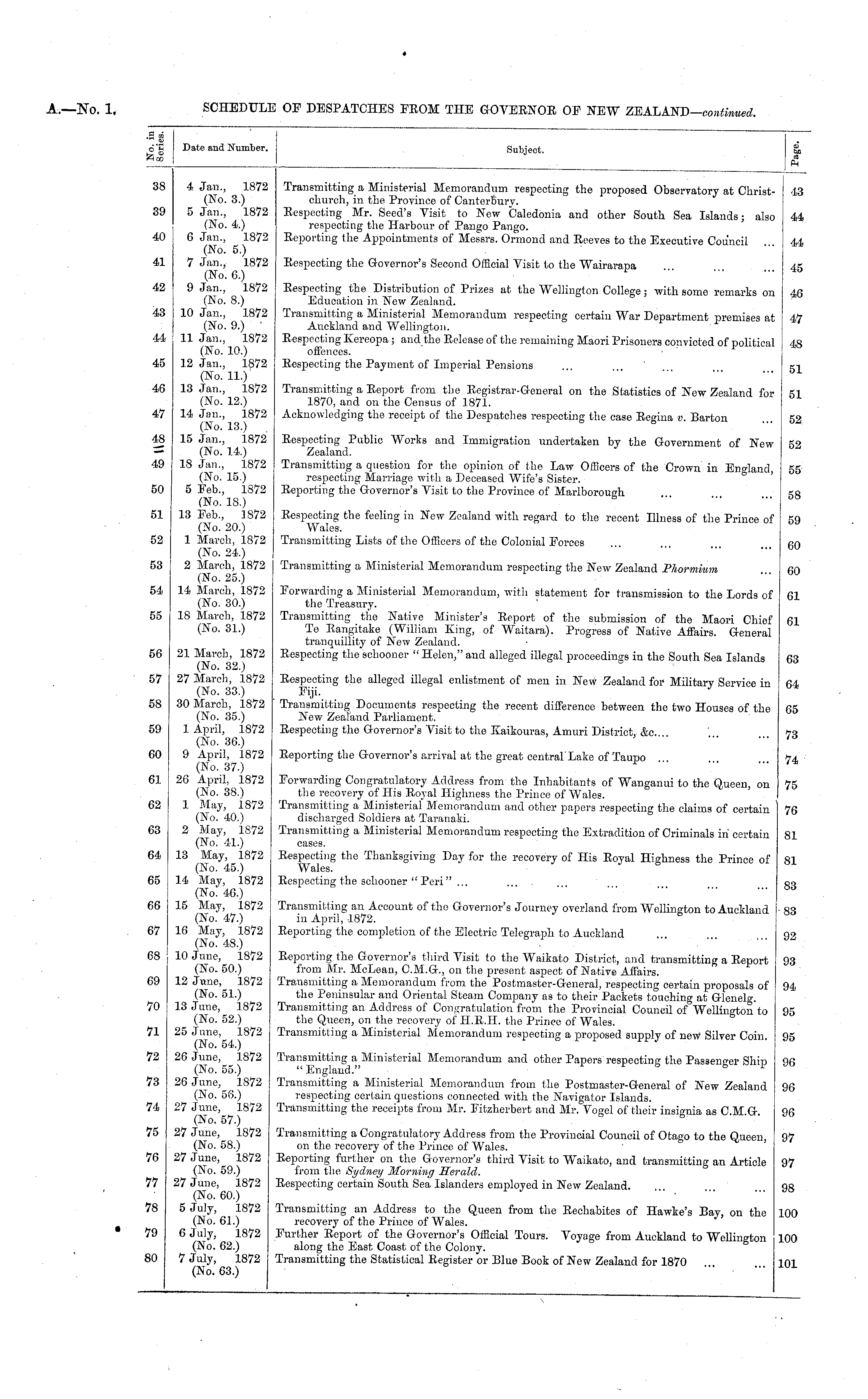 iPATCHES FROM THE GOVERNOR OF NEW ZEALAND— continued. ■SJ 6'£ Bate and Number. Aw Subject. 38 39 4 Jan., 1872 (No. 3.) 5 Jan., 1872 (No. 4.) 6 Jan., 1872 (No. 5.) 7 Jan., 1872 (No. 6.) 9 Jan., 1872 (No. 8.) 10 Jan., 1872 (No. 9.) 11 Jan., 1872 (No. 10.) 12 Jan., 1872 (No. 11.) 13 Jan., 1872 (No. 12.) 14 Jan., 1872 (No. 13.) 15 Jan., 1872 (No. 14.) 18 Jan., 1872 (No. 15.) 5 Feb., 1872 (No. 18.) 13 Feb., 1872 (No. 20.) 1 March, 1872 (No. 24.) 2 March, 1872 (No. 25.) 14 March, 1872 (No. 30.) 18 March, 1872 (No. 31.) Transmitting a Ministerial Memorandum respecting the proposed Observatory at Christclmroh, in the Province of Canterbury. Respecting _ Mr. Seed's Visit to Sew Caledonia and other South Sea Islands; also respecting the Harbour of Pango Pango. Reporting the Appointments of Messrs. Ormond and Reeves to the Executive Council ■13 44 40 44 41 Respecting the Governor's Second Official Visit to the Wairarapa 45 42 43 44 Respecting the Distribution of Prizes at the Wellington College; with some remarks on Education in New Zealand. Transmitting a Ministerial Memorandum respecting certain War Department premises at Auckland and Wellington. Respecting Kereopa; and the Release of the remaining Maori Prisoners convicted of political offences. Respecting the Payment of Imperial Pensions 46 47 48 45 51 46 Transmitting a Report from the Registrar-General on the Statistics of New Zealand for 1870, and on the Census of 1871. Acknowledging the receipt of the Despatches respecting the case Regina o. Barton I 51 47 52 48 49 Respecting Public Works and Immigration undertaken by the Government of New Zealand. Transmitting a question for the opinion of the Law Officers of the Crown in England, respecting Marriage with a Deceased Wife's Sister. Reporting the Governor's Visit to the Province of Marlborough 52 55 50 58 51 Respecting the feeling in New Zealand with regard to the recent Illness of the Prince of Wales. Transmitting Lists of the Officers of the Colonial Forces 59 52 60 53 Transmitting a Ministerial Memorandum respecting the New Zealand Phormwm 60 54 Forwarding a Ministerial Memorandum, with statement for transmission to the Lords of the Treasury. Transmitting the Native Minister's Report of the submission of the Maori Chief Te Rangitake (William King, of Waitara). Progress of Native Affairs. General tranquillity of New Zealand. Respecting the schooner " Helen," and alleged illegal proceedings in the South Sea Islands 61 55 61 56 21 March, 1872 (No. 32.) 27 March, 1872 (No. 33.) 30 March, 1872 (No. 35.) 1 April, 1872 (No. 36.) 9 April, 1872 (No. 37.) 26 April, 1872 (No. 38.) 1 May, 1872 (No. 40.) 2 May, 1872 (No. 41.) 13 May, 1872 (No. 45.) 14 May, 1872 (No!" 40.) 15 May, 1872 (No." 47.) 16 May, 1872 (No. 48.) 10 June, 1872 (No. 50.) 12 June, 1872 (No. 51.) 13 June, 1872 (No. 52.) 25 June, 1872 (No. 54.) 26 June, 1872 (No. 55.) 26 June, 1872 (No. 50.) 27 June, 1872 (No. 57.) 27 June, 1872 (No. 58.) 27 June, 1872 (No. 59.) 27 June, 1872 (No. 60.) 5 July, 1872 (No. 61.) 6 July, 1872 (No. 62.) 7 July, 1872 (No. 63.) 63 57 Respecting the alleged illegal enlistment of men in Sew Zealand for Military Service in Fiji. Transmitting Documents respecting the recent difference between the two Houses of the New Zealand Parliament. Respecting the Governor's Visit to the Kaikouras, Amuri District, &c... 64 58 05 59 73 60 Reporting the Governor's arrival at the great central'Lake of Taupo 74 61 Forwarding Congratulatory Address from the Inhabitants of Wanganui to the Queen, on the recovery of His Royal Highness the Prince of Wales. Transmitting a Ministerial Memorandum and other papers respecting the claims of certain discharged Soldiers at Taranaki. Transmitting a Ministerial Memorandum respecting the Extradition of Criminals in certain 75 62 76 63 81 64 65 cases. Respecting the Thanksgiving Day for the recovery of His Royal Highness the Prince of Wales. Respecting the schooner " Peri" ... 81 83 66 67 68 69 Transmitting an Account of the Governor's Journey overland from Wellington to Auckland in April, 1872. Reporting the completion of the Electric Telegraph to Auckland Reporting the Governor's third Visit to the Waikato District, and transmitting a Report from Mr. McLean, C.M.G., on the present aspect of Native Affairs. Transmitting a Memorandum from the Postmaster-General, respecting certain proposals of the Peninsular and Oriental Steam Company as to their Packets touching at, Glenelc. Transmitting an Address of Congratulation from the Provincial Council of Wellington' to the Queen, on the recovery of H.R.H. the Prince of Wales. Transmitting a Ministerial Memorandum respecting a proposed supply of new Silver Coin. 83 92 93 94 70 95 VI 95 72 73 Transmitting a Ministerial Memorandum and other Papers respecting the Passenger Ship " England." Transmitting a Ministerial Memorandum from the Postmaster-General of New Zealand respecting certain questions connected with the Navigator Islands. Transmitting the receipts from Mr. Fitzherbert and Mr. Vogel of their insignia as C.M.G. 96 96 74 96 75 Transmitting a Congratulatory Address from the Provincial Council of Otago to the Queen, on the recovery of the Prince of Wales. Reporting further on the Governor's third Visit to Waikato, and transmitting an Article from the Sydney Morning Herald. Respecting certain South Sea Islanders employed in New Zealand. 97 76 97 77 98 78 79 Transmitting an Address to the Queen from the Rechabitcs of Hawkc's Bay, on the recovery of the Prince of Wales. Further Report of the Governor's Official Tours. Voyage from Auckland to Wellington along the East Coast of the Colony. Transmitting the Statistical Register or Blue Book of New Zealand for 1870 100 100 80 101