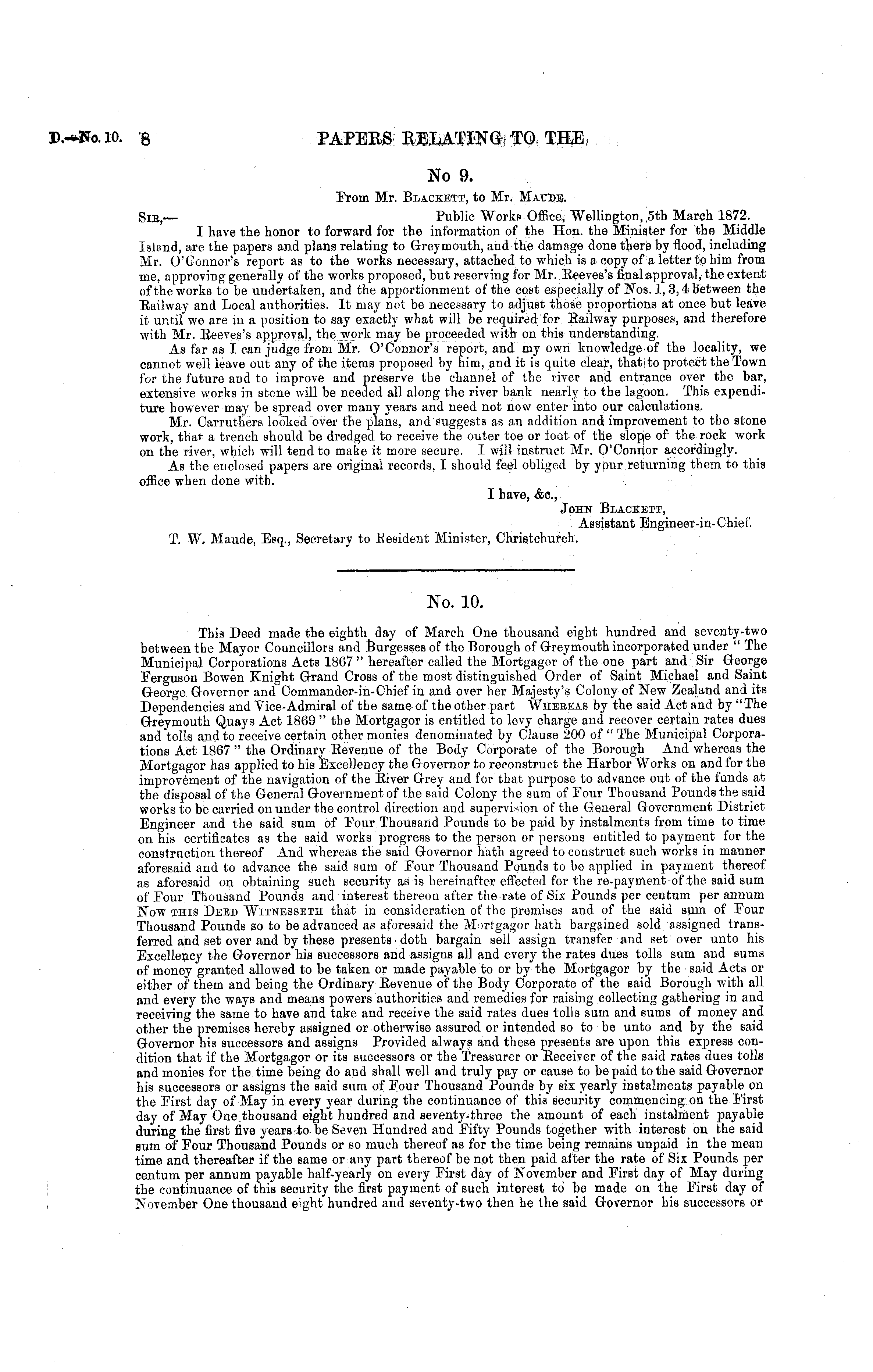 No. 10. This Deed made the eighth day of March One thousand eight hundred and seventy-two between the Mayor Councillors and Burgesses of the Borough of Greymouth incorporated under " The Municipal Corporations Acts 1867 " hereafter called the Mortgagor of the one part and Sir George Ferguson Bowen Knight Grand Cross of the most distinguished Order of Saint Michael and Saint George Governor and Commander-in-Chief in and over her Majesty's Colony of New Zealand and its Dependencies and Vice-Admiral of the same of the other part Wheeeas by the said Act and by "The Greymouth Quays Act 1869 " the Mortgagor is entitled to levy charge and recover certain rates dues and tolls and to receive certain other monies denominated by Clause 200 of " The Municipal Corporations Act 1867 " the Ordinary Eevenue of the Body Corporate of the Borough And whereas the Mortgagor has applied to his Excellency the Governor to reconstruct the Harbor Works on and for the improvement of the navigation of the Eiver Grey and for that purpose to advance out of the funds at the disposal of the General Government of the said Colony the sum of Pour Thousand Pounds the said works to be carried on under the control direction and supervision of the General Government District Engineer and the said sum of Pour Thousand Pounds to be paid by instalments from time to time on his certificates as the said works progress to the person or persons entitled to payment for the construction thereof And whereas the said Governor hath agreed to construct such works in manner aforesaid and to advance the said sum of Four Thousand Pounds to be applied in payment thereof as aforesaid on obtaining such security as is hereinafter effected for the re-payment of the said sum of Four Thousand Pounds and interest thereon after the rate of Six Pounds per centum per annum Now this Deed Witnesseth that in consideration of the premises and of the said sum of Pour Thousand Pounds so to be advanced as aforesaid the Mortgagor hath bargained sold assigned transferred and set over and by these presents doth bargain sell assign transfer and set over unto his Excellency the Governor his successors and assigns all and every the rates dues tolls sum and sums of money granted allowed to be taken or made payable to or by the Mortgagor by the said Acts or either of them and being the Ordinary Eevenue of the Body Corporate of the said Borough with all and every the ways and means powers authorities and remedies for raising collecting gathering in and receiving the same to have and take and receive the said rates dues tolls sum and sums of money and other the premises hereby assigned or otherwise assured or intended so to be unto and by the said Governor his successors and assigns Provided always and these presents are upon this express condition that if the Mortgagor or its successors or the Treasurer or Eeceiver of the said rates dues tolls and monies for the time being do and shall well and truly pay or cause to be paid to the said Governor his successors or assigns the said sum of Pour Thousand Pounds by six yearly instalments payable on the First day of May in every year during the continuance of this security commencing on the First day of May One thousand eight hundred and seventy-three the amount of each instalment payable during the first five years to be Seven Hundred and Fifty Pounds together with interest on the said sum of Four Thousand Pounds or so much thereof as for the time being remains unpaid in the mean time and thereafter if the same or any part thereof be not then paid after the rate of Six Pounds per centum per annum payable half-yearly on every First day of November and First day of May during the continuance of this security the first payment of such interest to bo made on the First day of November One thousand eight hundred and seventy-two then he the said Governor his successors or