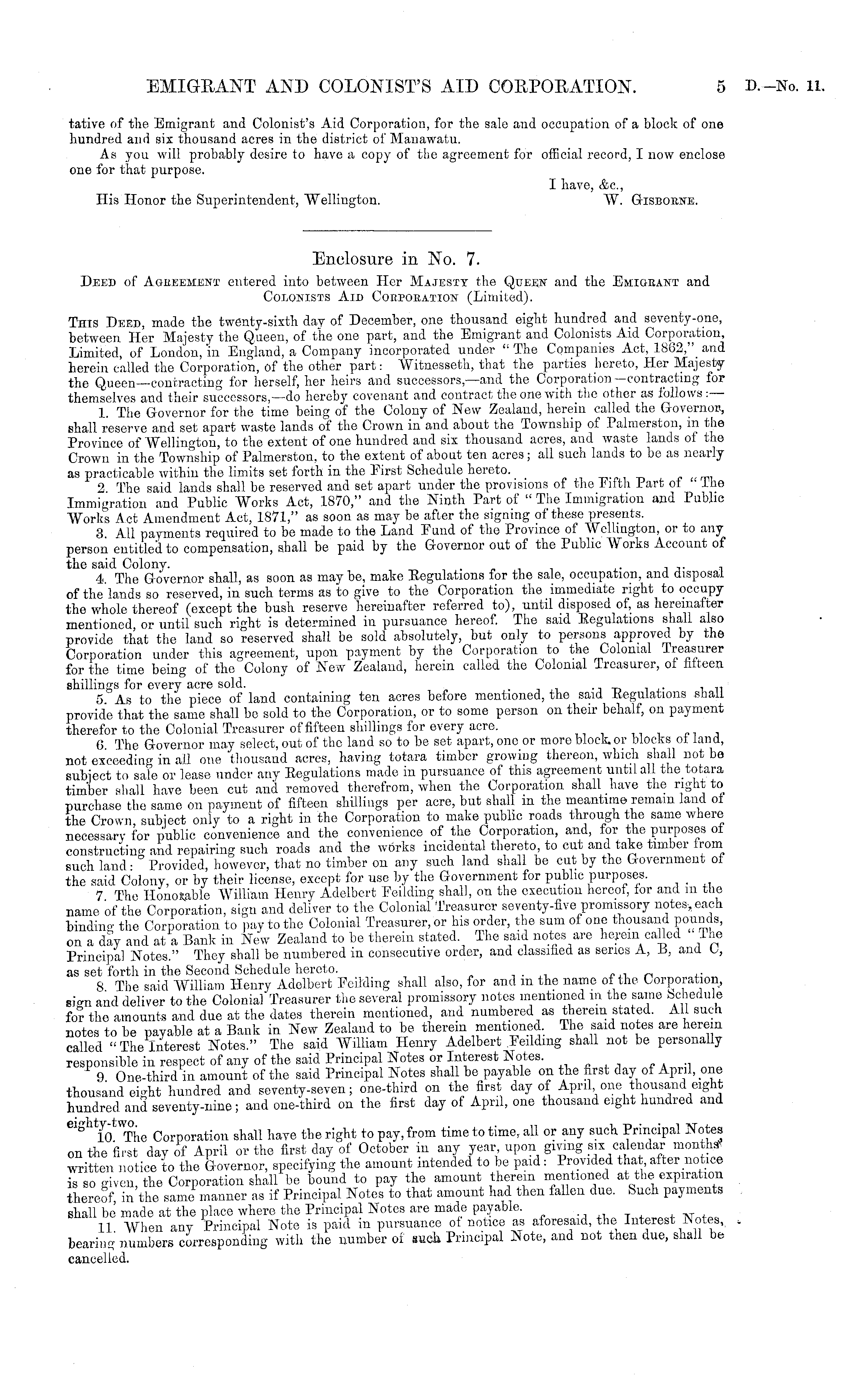 Enclosure in No. 7. Deed of Ageeement entered into between Her Majesty the Queen and the Emigeant and Colonists Aid Coepoeation (Limited). This Deed, made the twenty-sixth day of December, one thousand eight hundred and seventy-one, between Her Majesty the Queen, of the one part, and the Emigrant and Colonists Aid Corporation, Limited, of London, in England, a Company incorporated under " The Companies Act, 1882,"^ and herein tailed the Corporation, of the other part: Witnesseth, that the parties hereto, Her Majesty the Queen—contracting for herself, her heirs and successors,—and the Corporation—contracting for themselves and their successors,—do hereby covenant and contract the one with the other as follows: — 1. The Governor for the time being of the Colony of New Zealand, herein called the Governor, snail reserve and set apart waste lands of the Crown in and about the Township of Palmerston, in the Province of Wellington, to the extent of one hundred and six thousand acres, and waste lands of the Crown in the Township of Palmerston, to the extent of about ten acres; all such lands to be as nearly as practicable within the limits set forth in the First Schedule hereto. 2 The said lands shall be reserved and set apart under the provisions of the Fifth Part of " The Immigration and Public Works Act, 1870," and the Ninth Part of " The Immigration and Public Works Act Amendment Act, 1871," as soon as may be after the signing of these presents. 3. All payments required to be made to the Land Fund of the Province of Wellington, or to any person entitled to compensation, shall be paid by the Governor out of the Public Works Account of the said Colony. , ~ , 4. The Governor shall, as soon as may be, make Regulations for the sale, occupation, and disposaf of the lands so reserved, in such terms as to give to the Corporation the immediate right to occupy the whole thereof (except the bush reserve hereinafter referred to), until disposed of, as hereinafter mentioned or until such right is determined in pursuance hereof. The said Regulations shall also provide that the land so reserved shall be sold absolutely, but only to persons approved by the Corporation under this agreement, upon payment by the Corporation to the Colonial Treasurer for the time being of the Colony of New Zealand, herein called the Colonial Treasurer, of fifteen shillings for every acre sold. _ . .. 5. As to the piece of land containing ten acres before mentioned, the said Regulations shall provide that the same shall be sold to the Corporation, or to some person on their behalf, on payment therefor to the Colonial Treasurer of fifteen shillings for every acre. 0 The Governor may select, out of the land so to be set apart, one or more block or blocks of land, not exceeding in all one thousand acres, having totara timber growing thereon, which shall not be subject to sale or lease under any Regulations made in pursuance of this agreement until all the totara timber shall have been cut and removed therefrom, when the Corporation shall have the right to purchase the same on payment of fifteen shillings per acre, but shall in the meantime remain land of the Crown, subject only to a right in the Corporation to make public roads through the same where necessary for public convenience and the convenience of the Corporation, and, for the purposes of constructing and repairing such roads and the works incidental thereto, to cut and take timber from such land • Provided, however, that no timber on any such land shall be cut by the Government of the said Colony, or by their license, except for use by the Government for public purposes. _ 7 The Honorable William Henry Adelbert Feilding shall, on the execution hereof, for and m the name of the Corporation, sign and deliver to the Colonial Treasurer seventy-five promissory notes, each binding the Corporation to pay to the Colonial Treasurer, or his order, the sum of one thousand pounds, on a day and at a Bank in New Zealand to bo therein stated. The said notes are herein called The Principal Notes." They shall bo numbered in consecutive order, and classified as series A, £S, and b, as set forth in the Second Schedule hereto. 8 The said William Henry Adelbert Feilding shall also, for and m the name of the Corporation, sio-n and deliver to the Colonial Treasurer the several promissory notes mentioned in the same Schedule for the amounts and due at the dates therein mentioned, and numbered as therein stated. All such notes to be payable at a Bank in New Zealand to be therein mentioned. The said notes are herein called "The Interest Notes." The said William Henry Adelbert Feilding shall not be personally responsible in respect of any of the said Principal Notes or Interest Notes. 9 One-third in amount of the said Principal Notes shall be payable on the first day of April, one thousand eight hundred and seventy-seven; one-third on the first day of April one thousand eight hundred and seventy-nine; and one-third on the first day of April, one thousand eight hundred and eig ltr Uv° he Co ation sliall have the r ;ght to pay, from time to time, all or any such Principal Notes on the first day of April or the first day of October in any year upon giving six calendar months written notice to the Governor, specifying the amount intended to be paid : Provided that, after notice is so given, the Corporation shall be bound to pay the amount therein mentioned at the expiration thereof in the same manner as if Principal Notes to that amount had then fallen due. Such payments shall bo made at the place where the Principal Notes are made payable. _ 11 When any Principal Note is paid in pursuance of notice as aforesaid, the Interest Notes,, bearing numbers corresponding with the number of reck Principal Note, and not tnen due, shall be cancelled.