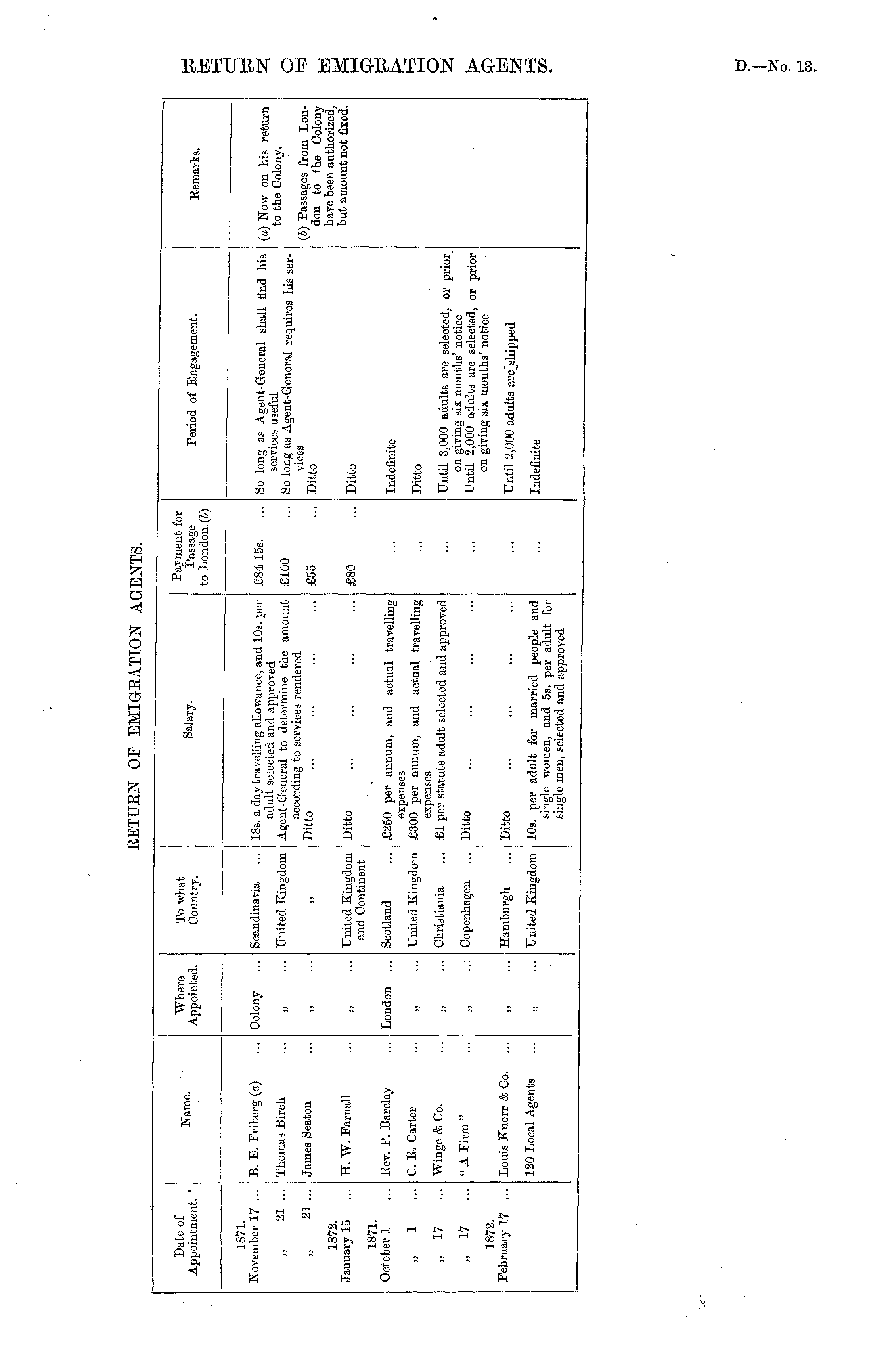 Date of Appointment. " Name. Where Appointed. To what Country. Salary. Payment for Passage to London. (S) Period of Engagement. Remarks. 1871. November 17 ... B. E. Friberg (a) Colony Scandinavia 18s. a day travelling allowance, and 10s. per adult selected and approved Agent-General to determine the amount according to services rendered Ditto £84 15s. So long as Agent-General shall find his services useful So long as Agent-General requires his services (a) Now on his return to the Colony. 21 ... Thomas Birch United Kingdom £100 21 ... James Seaton j? j) £55 Ditto (.) Passages from London to the Colony have been authorized, but amount not fixed. 1872. January 15 H. W. Farnall j) United Kingdom and Continent Ditto £80 Ditto 1871. October 1 Rev. P. Barclay London Scotland £250 per annum, and actual travelling expenses £300 per annum, and actual travelling expenses £1 per statute adult selected and approved Indefinite „ 1 ... C. E. Carter >j United Kingdom Ditto „ 17 ... Winge & Co. Christiania Until 3,000 adults are selected, or prior on giving six months' notice Until 2,000 adults are selected, or prior on giving six months' notice „ 17 ... " A Firm " Copenhagen Ditto 1872. February 17 ... Louis Knorr & Co. a Hamburgh Ditto L Tntil 2,000 adults are_shipped 120 Local Agents a United Kingdom 10s. per adult for married people and single women, and 5s. per adult for single men, selected and approved Indefinite