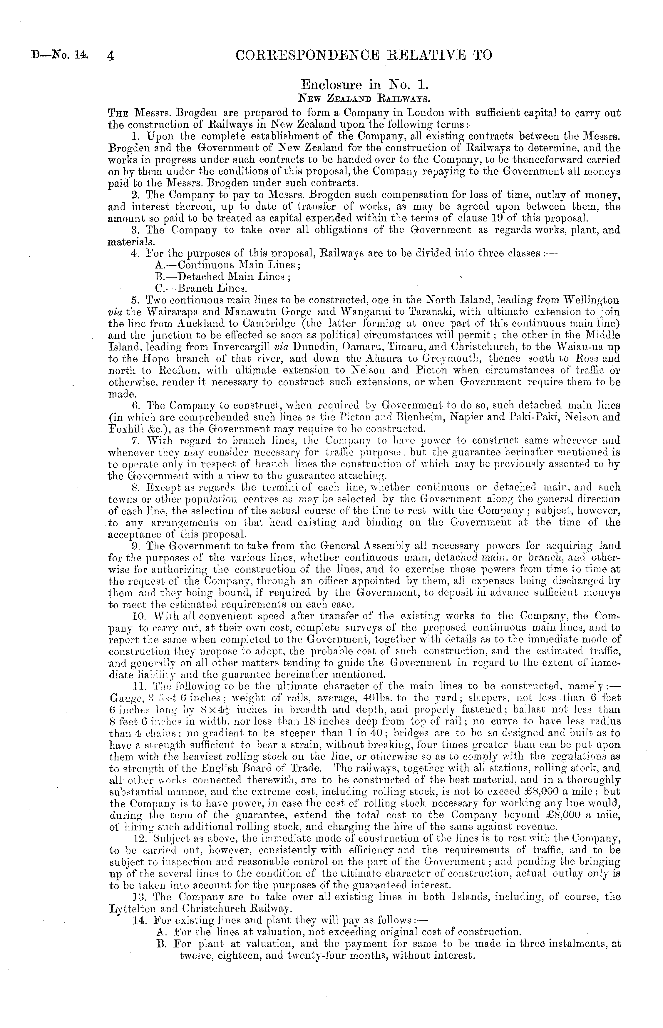 Enclosure in No. 1. New Zealand Railways. The Messrs. Brogden are prepared to form a Company in London with sufficient capital to carry out the construction of Railways in New Zealand upon the following terms: — 1. Upon the complete establishment of the Company, all existing contracts between the Messrs. Brogden and the Government of New Zealand for the construction of Railways to determine, and the works in progress under such contracts to be handed over to the Company, to be thenceforward carried on by them under the conditions of this proposal, the Company repaying to the Government all moneys paid to the Messrs. Brogden under such contracts. 2. The Company to pay to Messrs. Brogden such compensation for loss of time, outlay of money, and interest thereon, up to date of transfer of works, as may be agreed upon between them, the amount so paid to be treated as capital expended within the terms of clause 19 of this proposal. 3. The Company to take over all obligations of the Government as regards works, plant, and materials. 4. For the purposes of this proposal, Railways are to be divided into three classes: — A.—Continuous Main Lines; B. —Detached Main Lines ; C. —Branch Lines. 5. Two continuous main lines to be constructed, one in the North Island, leading from Wellington via the Wairarapa and Manawatu Gorge and Wanganui to Taranaki, with ultimate extension to join the line from Auckland to Cambridge (the latter forming at once part of this continuous main line) and the junction to be effected so soon as political circumstances will permit; the other in the Middle Island, leading from Invercargill via Dunedin, Oamaru, Timaru, and Christchurch, to the Waiau-ua up to the Hope branch of that river, and down the Ahaura to Greymouth, thence south to Ross and north to Recfton, with ultimate extension to Nelson and Picton when circumstances of traffic or otherwise, render it necessary to construct such extensions, or when Government require them to be made. 6. The Company to construct, when required by Government to do so, such detached main lines (in which are comprehended such lines as the Picton and Blenheim, Napier and Paki-Paki, Nelson and Foxhill &c), as the Government may require to be constructed. 7. With regard to branch lines, the Company to have power to construct same wherever and whenever they may consider necessary for traffic purposes, but the guarantee herinafter mentioned is to operate only in respect of branch lines the construction of which may be previously assented to by the Government with a view to the guarantee attaching. 8. Except as regards the termini of each line, whether continuous or detached main, and such towns or other population centres as may be selected by the Government along the general direction of each line, the selection of the actual course of the line to rest with the Company ; subject, however, to any arrangements on that head existing and binding on the Government at the time of the acceptance of this proposal. 9. The Government to take from the General Assembly all necessary powers for acquiring land for the purposes of the various lines, whether continuous main, detached main, or branch, and otherwise for authorizing the construction of the lines, and to exercise those powers from time to time at the request of the Company, through an officer appointed by them, all expenses being discharged by them and they being bound, if required b}^ the Government, to deposit ill advance sufficient moneys to meet the estimated requirements on each case. 10. With all convenient speed after transfer of the existing works to the Company, tho Company to carry out, at their own cost, complete surveys of the proposed continuous main lines, and to report the same when completed to the Government, together with details as to the immediate mode of construction they propose to adopt, the probable cost of such construction, and the estimated traffic, and generally on all other matters tending to guide the Government in regard to the extent of immediate liability and the guarantee hereinafter mentioned. 11. The following to be the ultimate character of the main linos to be constructed, namely:— Gauge, 3 feet 6 inches; weight of rails, average, 40lbs. to the yard; sleepers, not less than 6 feet 6 inches long by Bx4-|- inches in breadth and depth, and properly fastened; ballast not less than 8 feet 6 inches in width, nor less than 18 inches deep from top of rail; no curve to have less radius than 4 chains ; no gradient to be steeper than 1 in 40; bridges are to be so designed and built as to have a strength sufficient to bear a strain, without breaking, four times greater than can be put upon them with the heaviest rolling stock on the line, or otherwise so as to comply with the regulations as to strength of the English Board of Trade. The railways, together with all stations, rolling stock, and all other works connected therewith, are to be constructed of the best material, and in a thoroughly substantial manner, and the extreme cost, including rolling stock, is not to exceed £8,000 a mile; but the Company is to have power, in case the cost of rolling stock necessary for working any line would, during the term of the guarantee, extend the total cost to the Company beyond £8,000 a mile, of hiring such additional rolling stock, and charging the hire of the same against revenue. 12. Subject as above, the immediate mode of construction of the lines is to rest with the Company, to be carried out, however, consistently with efficiency and the requirements of traffic, and to be subject to inspection and reasonable control on the part of the Government; and pending the bringing up of the several lines to the condition of the ultimate character of construction, actual outlay only is to be taken into account for the purposes of the guaranteed interest. 13. The Company are to take over all existing lines in both Islands, including, of course, the Lyttelton and Christch