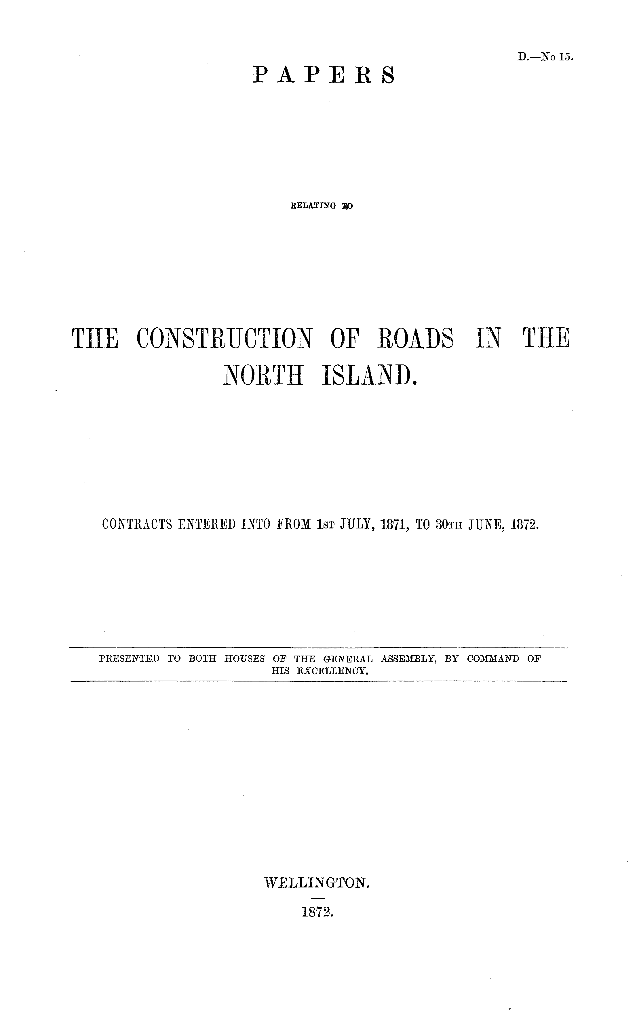 PAPERS RELATING TO THE CONSTRUCTION OF ROADS IN THE NORTH ISLAND. CONTRACTS ENTERED INTO FROM 1st JULY, 1871, TO 30TH JUNE, 1872.