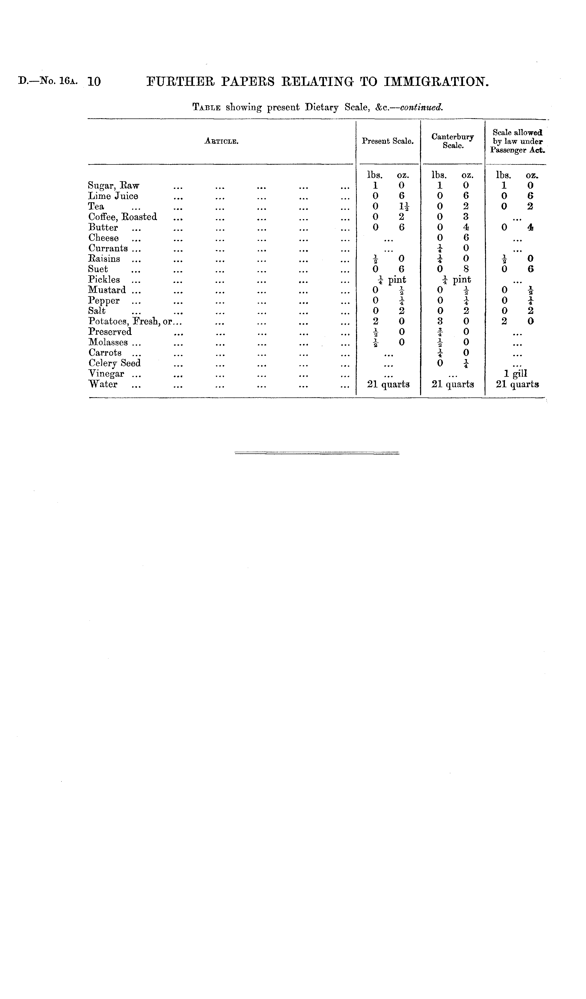 Article. Present Scale. Canterbury Scale. Scale allowed by law under Passenger Act. Sugar, Raw Lime Juice Tea Coffee, Boasted Butter Cheese Currants ... Baisins Suet Pickles Mustard ... Pepper Salt Potatoes, Presh, or... Preserved Molasses ... Carrots ... Celery Seed Vinegar ... Water lbs. OZ. 1 0 0 6 0 If 0 2 0 6 * 0 0 6 i pint 0 i 0 i 0 2 2 0 * 0 * 0 lbs. oz. 1 0 0 6 0 2 0 3 0 4 0 6 i o i o 0 8 i pint 0 } 0 i 0 2 3 0 f 0 * 0 i o o i lbs. oz. 1 0 0 6 0 2 0 4 0 6 0 i 0 i 0 2 2 0 Igill 21 quarts 21 quarts 21 quarts