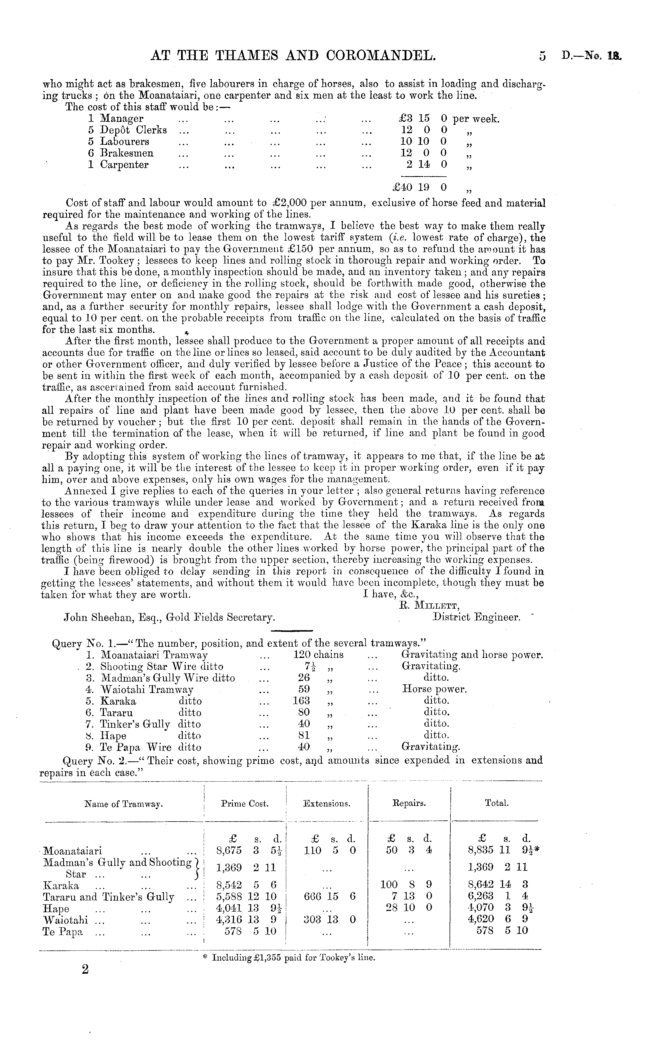who might act as brakesmen, five labourers in charge of horses, also to assist in loading and discharging trucks ; on the Moanataiari, one carpenter and six men at the least to work the line. The cost of this staff would be : — 1 Manager ... ... ... ..': ... £3 15 0 per week. 5 Depot Clerks ... ... ... ... ... 12 0 0 5 Labourers ... ... ... ... ... 10 10 0 „ 6 Brakesmen ... ... ... ... ... 12 0 0 „ 1 Carpenter ... ... ... ... ... 2 14 0 £40 19 0 Cost of staff and labour would amount to £2,000 per annum, exclusive of horse feed and material required for the maintenance and working of the lines. As regards the best mode of working the tramways, I believe the best way to make them really useful to the field will be to lease them on the lowest tariff system (i.e. lowest rate of charge), the lessee of the Moanataiari to pay the Government £150 per annum, so as to refund the amount it has to pay Mr. Tookey ; lessees to keep lines and rolling stock in. thorough repair and working order. To insure that this be done, a monthly inspection should be made, and an inventory taken ; and any repairs required to the line, or deficiency in the rolling stock, should be forthwith made good, otherwise the Government may enter on and make good the repairs at the risk and cost of lessee and his sureties ; and, as a further security for monthly repairs, lessee shall lodge with the Government a cash deposit, equal to 10 per cent, on the probable receipts from traffic on the line, calculated on the basis of traffic for the last six months. t After the first month, lessee shall produce to the Government a proper amount of all receipts and accounts due for traffic on the line or lines so leased, said account to be duly audited by the Accountant or other Government officer, and duly verified by lessee before a Justice of the Peace; this account to be sent in within the first week of each month, accompanied by a cash deposit of 10 per cent, on the traffic, as ascertained from said account furnished. After the monthly inspection of the lines and rolling stock has been made, and it be found that all repairs of line and plant have been made good by lessee, then the above 10 per cent, shall be be returned by voucher ; but the first 10 per cent, deposit shall remain in the hands of the Government till the termination of the lease, when it will be returned, if line and plant be found in good repair and working order. By adopting this system of working the lines of tramway, it appears to me that, if the line be at all a paying one, it will be the interest of the lessee to keep it in proper working order, even if it pay him, over and above expenses, only his own wages for the management. Annexed I give replies to each of the queries in your letter ; also general returns having reference to the various tramways while under lease and worked by Government; and a return received from lessees of their income and expenditure during the time they held the tramways. As regards this return, I beg to draw your attention to the fact that the lessee of the Karaka line is the only one who shows that his income exceeds the expenditure. At the same time you will observe that the length of this line is nearly double the other lines worked by horse power, tho principal part of the traffic (being firewood) is brought from the upper section, thereby increasing the working expenses. I have been obliged to delay sending in this report in consequence of the difficulty I found in getting the lessees' statements, and without them it would have been incomplete, though they must be taken for what they are worth. I have, &c, R. Millett, John Sheehan, Esq., Gold Fields Secretary. District Engineer.