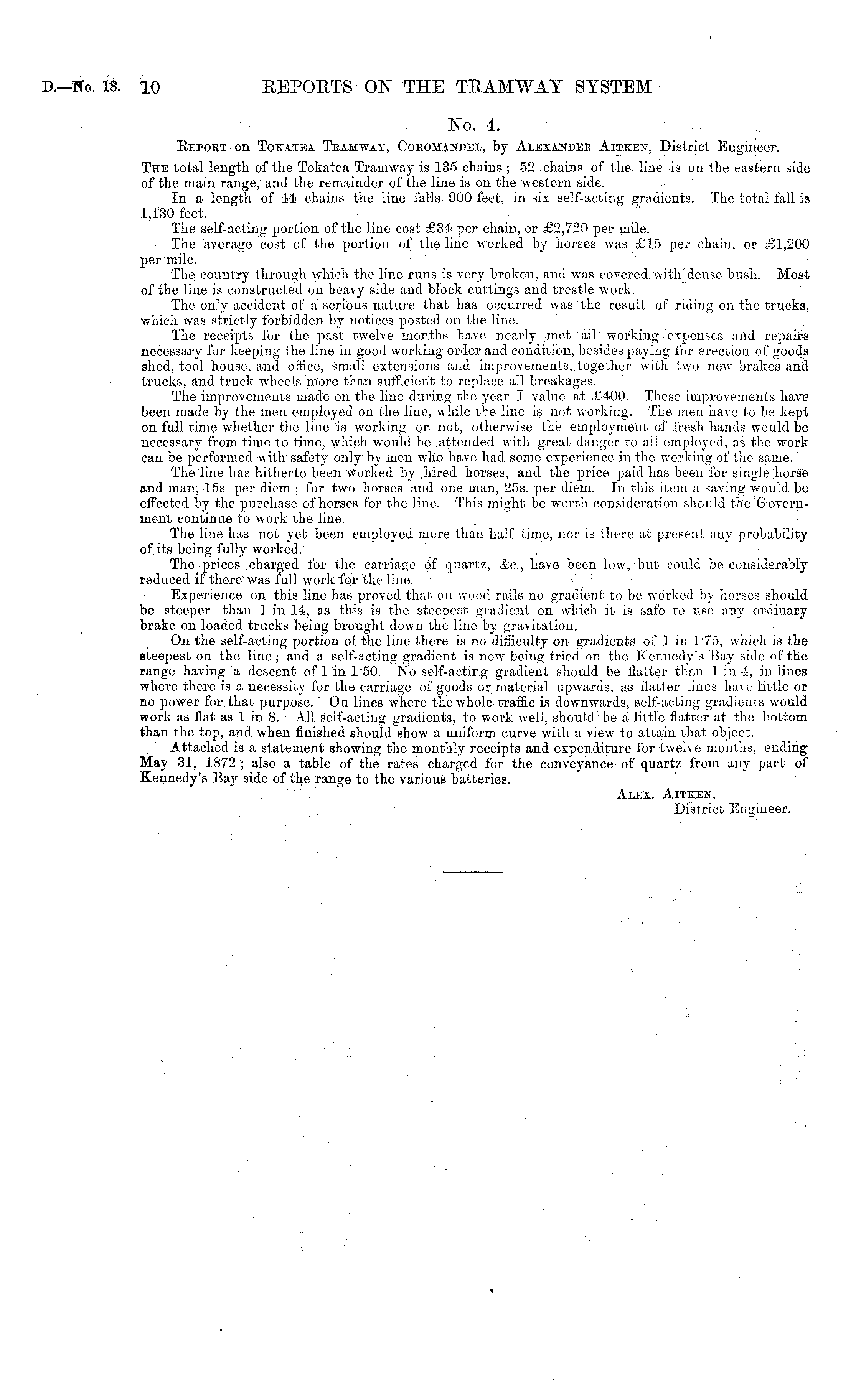 No. _. Repoet on Tokatea Teamway, Coeomandel, by Alexandee Aitken, District Engineer. The total length of the Tokatea Tramway is 135 chains ; 52 chains of the. line is on the eastern side of the main range, and the remainder of the line is on the western side. In a length of 44 chains the line falls 900 feet, in six self-acting gradients. The total fall is 1,130 feet. The self-acting portion of the lino cost £34 per chain, or £2,720 per mile. The average cost of the portion of the line worked by horses was £15 per chain, or £1,200 per mile. The country through which the line runs is very broken, and was covered witVdense bush. Most of the line is constructed on heavy side and block cuttings and trestle work. The only accident of a serious nature that has occurred was the result of riding on the trucks, which was strictly forbidden by notices posted on the line. The receipts for the past twelve months have nearly met all working expenses and repairs necessary for keeping the line in good working order and condition, besides paying for erection of goods shed, tool house, and office, small extensions and improvements, together with two new brakes and trucks, and truck wheels more than sufficient to replace all breakages. The improvements made on the line during the year I value at £400. These improvements have been made by the men employed on the line, while the line is not working. The men have to be kept on full time whether the line is working or not, otherwise the employment of fresh hands would be necessary from time to time, which would be attended with great danger to all employed, as the work can be performed with safety only by men who have had some experience in the working of the same. The line has hitherto been worked by hired horses, and the price paid has been for single horse and man, 15s, per diem ; for two horses and one man, 255. per diem. In this item a saving would be effected by the purchase of horses for the line. This might be worth consideration should the Government continue to work the line. The line has not yet been employed more than half time, nor is there at present any probability of its being fully worked. The prices charged for the carriage of quartz, &c, have been low, but could be considerably reduced if there was full work for the line. Experience on this line has proved that on wood rails no gradient to be worked by horses should be steeper than 1 in 14, as this is the steepest gradient on which it is safe to use any ordinary brake on loaded trucks being brought down the line by gravitation. On the self-acting portion of the line there is no difficulty on gradients of 1 in 175, which is the steepest on the line ; and a self-acting gradient is now being tried on the Kennedy's Bay side of the range having a descent of lin I*so. No self-acting gradient should be flatter than lin 4, in lines where there is a necessity for the carriage of goods or material upwards, as flatter lines have little or no power for that purpose. On lines where the whole traffic is downwards, self-acting gradients would work as flat as lin 8. All self-acting gradients, to work well, should be a little flatter at the bottom than the top, and when finished should show a uniform curve with a view to attain that object. Attached is a statement showing the monthly receipts and expenditure for twelve months, ending May 31, 1872 ; also a table of the rates charged for the conveyance of quartz from any part of Kennedy's Bay side of the range to the various batteries. Alex. Aitken, District Engineer.