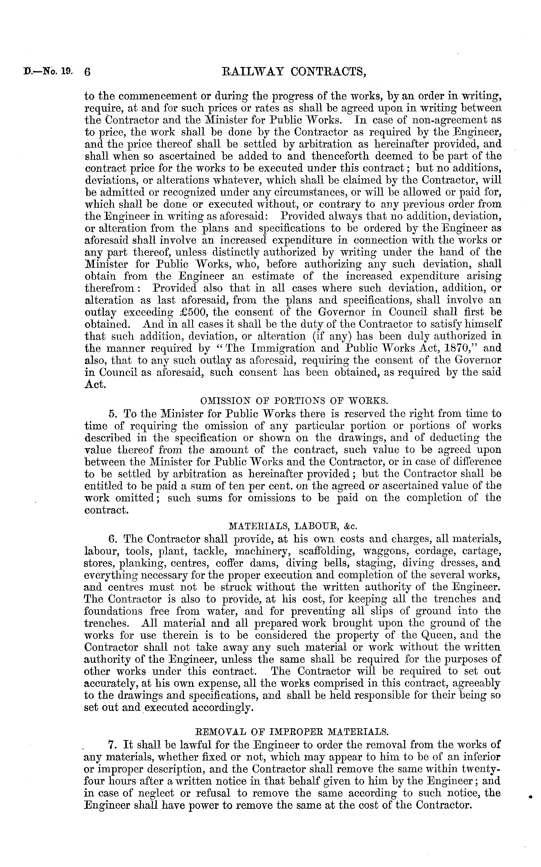 to the commencement or during the progress of the works, by an order in writing, require, at and for such prices or rates as shall be agreed upon in writing between the Contractor and the Minister for Public Works. In case of non-agreement as to price, the work shall be done by the Contractor as required by the Engineer, and the price thereof shall be settled by arbitration as hereinafter provided, and shall when so ascertained be added to and thenceforth deemed to be part of the contract price for the works to be executed under this contract; but no additions, deviations, or alterations whatever, which shall be claimed by the Contractor, will be admitted or recognized under any circumstances, or will be allowed or paid for, which shall be done or executed without, or contrary to any previous order from the Engineer in writing as aforesaid: Provided always that no addition, deviation, or alteration from the plans and specifications to be ordered by the Engineer as aforesaid shall involve an increased expenditure in connection with the works or any part thereof, unless distinctly authorized by writing under the hand of the Minister for Public Works, who, before authorizing any such deviation, shall obtain from the Engineer an estimate of the increased expenditure arising therefrom: Provided also that in all cases where such deviation, addition, or alteration as last aforesaid, from the plans and specifications, shall involve an outlay exceeding £500, the consent of the Governor in Council shall first be obtained. And in all cases it shall be the duty of the Contractor to satisfy himself that such addition, deviation, or alteration (if any) has been duly authorized in the manner required by " The Immigration and Public Works Act, 1870," and also, that to any such outlay as aforesaid, requiring the consent of the Governor in Council as aforesaid, such consent has been obtained, as required by the said Act. OMISSION OF POETIONS OF WOEKS. 5. To the Minister for Public Works there is reserved the right from time to time of requiring the omission of any particular portion or portions of works described in the specification or shown on the drawings, and of deducting the value thereof from the amount of the contract, such value to be agreed upon between the Minister for Public Works and the Contractor, or in case of difference to be settled by arbitration as hereinafter provided; but the Contractor shall be entitled to be paid a sum of ten per cent, on the agreed or ascertained value of the work omitted; such sums for omissions to be paid on the completion of the contract. MATEEIALS, LABOTJE, &c. 6. The Contractor shall provide, at his own costs and charges, all materials, labour, tools, plant, tackle, machinery, scaffolding, waggons, cordage, cartage, stores, planking, centres, coffer dams, diving bells, staging, diving dresses, and everything necessary for the proper execution and completion of the several works, and centres must not be struck without the written authority of the Engineer. The Contractor is also to provide, at his cost, for keeping all the trenches and foundations free from water, and for preventing all slips of ground into the trenches. All material and all prepared work brought upon the ground of the works for use therein is to be considered the property of the Queen, and the Contractor shall not take away any such material or work without the written authority of the Engineer, unless the same shall be required for the purposes of other works under this contract. The Contractor will be required to set out accurately, at his own expense, all the works comprised in this contract, agreeably to the drawings and specifications, and shall be held responsible for their being so set out and executed accordingly. EEMOVAL OF IMPEOPEE MATEEIALS. 7. It shall be lawful for the Engineer to order the removal from the works of any materials, whether fixed or not, which may appear to him to be of an inferior or improper description, and the Contractor shall remove the same within twentyfour hours after a written notice in that behalf given to him by the Engineer; and in case of neglect or refusal to remove the same according to such notice, the Engineer shall have power to remove the same at the cost of the Contractor.