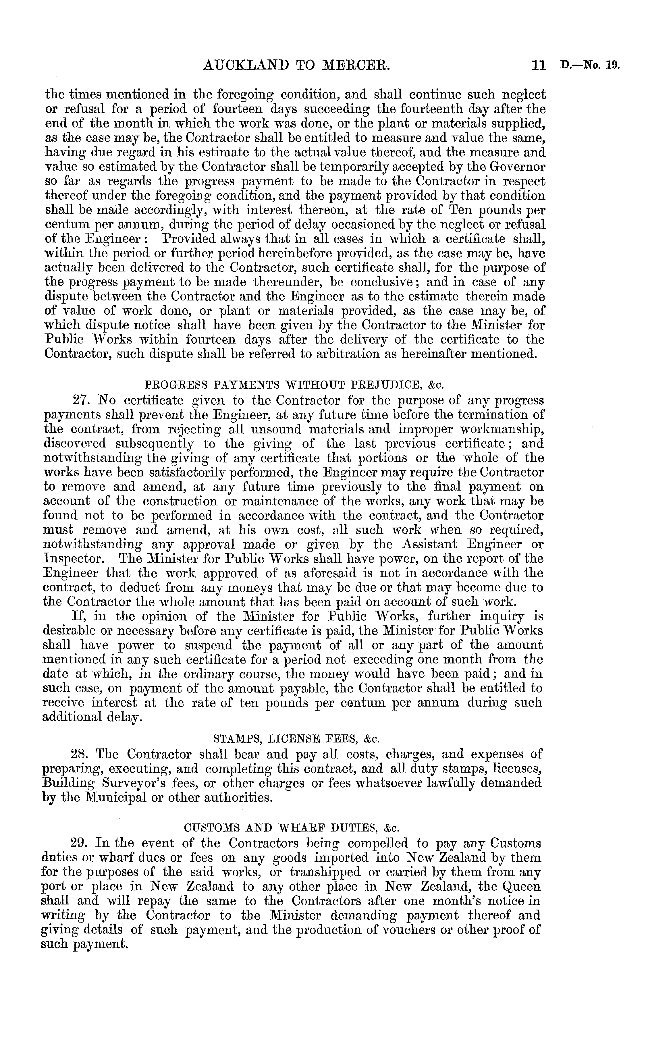 the times mentioned in the foregoing condition, and shall continue such neglect or refusal for a period of fourteen days succeeding the fourteenth day after the end of the month in which the work was done, or the plant or materials supplied, as the case may be, the Contractor shall be entitled to measure and value the same, having due regard in his estimate to the actual value thereof, and the measure and value so estimated by the Contractor shall be temporarily accepted by the Governor so far as regards the progress payment to be made to the Contractor in respect thereof under the foregoing condition, and the payment provided by that condition shall be made accordingly, with interest thereon, at the rate of Ten pounds per centum per annum, during the period of delay occasioned by the neglect or refusal of the Engineer : Provided always that in all cases in which a certificate shall, within the period or further period hereinbefore provided, as the case may be, have actually been delivered to the Contractor, such certificate shall, for the purpose of the progress payment to be made thereunder, be conclusive; and in case of any dispute between the Contractor and the Engineer as to the estimate therein made of value of work done, or plant or materials provided, as the case may be, of which dispute notice shall have been given by the Contractor to the Minister for Public Works within fourteen days after the delivery of the certificate to the Contractor, such dispute shall be referred to arbitration as hereinafter mentioned. PEOGEESS PAYMENTS WITHOUT PEEJUDICE, &c. 27. No certificate given to the Contractor for the purpose of any progress payments shall prevent the Engineer, at any future time before the termination of the contract, from rejecting all unsound materials and improper workmanship, discovered subsequently to the giving of the last previous certificate; and notwithstanding the giving of any certificate that portions or the whole of the works have been satisfactorily performed, the Engineer may require the Contractor to remove and amend, at any future time previously to the final payment on account of the construction or maintenance of the works, any work that may be found not to be performed in accordance with the contract, and the Contractor must remove and amend, at his own cost, all such work when so required, notwithstanding any approval made or given by the Assistant Engineer or Inspector. The Minister for Public Works shall have power, on the report of the Engineer that the work approved of as aforesaid is not in accordance with the contract, to deduct from any moneys that may be due or that may become due to the Contractor the whole amount that has been paid on account of such work. If, in the opinion of the Minister for Public Works, further inquiry is desirable or necessary before any certificate is paid, the Minister for Public Works shall have power to suspend the payment of all or any part of the amount mentioned in any such certificate for a period not exceeding one month from the date at which, in the ordinary course, the money would have been paid; and in such case, on payment of the amount payable, the Contractor shall be entitled to receive interest at the rate of ten pounds per centum per annum during such additional delay. STAMPS, LICENSE FEES, &c. 28. The Contractor shall bear and pay all costs, charges, and expenses of preparing, executing, and completing this contract, and all duty stamps, licenses, Building Surveyor's fees, or other charges or fees whatsoever lawfully demanded by the Municipal or other authorities. CUSTOMS AND WHAEF DUTIES, &c. 29. In the event of the Contractors being compelled to pay any Customs duties or wharf dues or fees on any goods imported into New Zealand by them for the purposes of the said works, or transhipped or carried by them from any port or place in New Zealand to any other place in New Zealand, the Queen shall and will repay the same to the Contractors after one month's notice in writing by the Contractor to the Minister demanding payment thereof and giving details of such payment, and the production of vouchers or other proof of such payment.