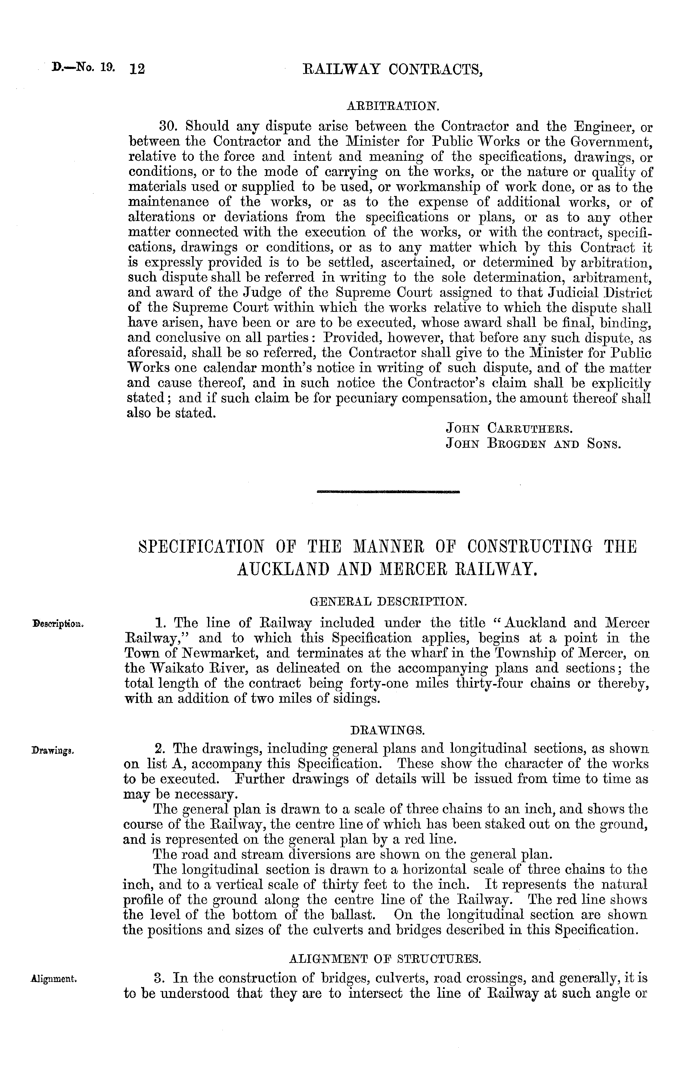 SPECIFICATION OF THE MANNER OF CONSTRUCTING THE AUCKLAND AND MERCER RAILWAY. GENEEAL DESCEIPTION. 1. The line of Railway included under the title " Auckland and Mercer Railway," and to which this Specification applies, begins at a point in the Town of Newmarket, and terminates at the wharf in the Township of Mercer, on the Waikato River, as delineated on the accompanying plans and sections; the total length of the contract being forty-one miles thirty-four chains or thereby, with an addition of two miles of sidings. DEAWINGS. 2. The drawings, including general plans and longitudinal sections, as shown on list A, accompany this Specification. These show the character of the works to be executed. Eurther drawings of details will be issued from time to time as may be necessary. The general plan is drawn to a scale of three chains to an inch, and shows the course of the Railway, the centre line of which has been staked out on the ground, and is represented on the general plan by a red line. The road and stream diversions are shown on the general plan. The longitudinal section is drawn to a horizontal scale of three chains to the inch, and to a vertical scale of thirty feet to the inch. It represents the natural profile of the ground along the centre line of the Railway. The red line shows the level of the bottom of the ballast. On the longitudinal section are shown the positions and sizes of the culverts and bridges described in this Specification. ALIGNMENT OF STEUCTUEES. 3. In the construction of bridges, culverts, road crossings, and generally, it is to be understood that they are to intersect the line of Railway at such angle or