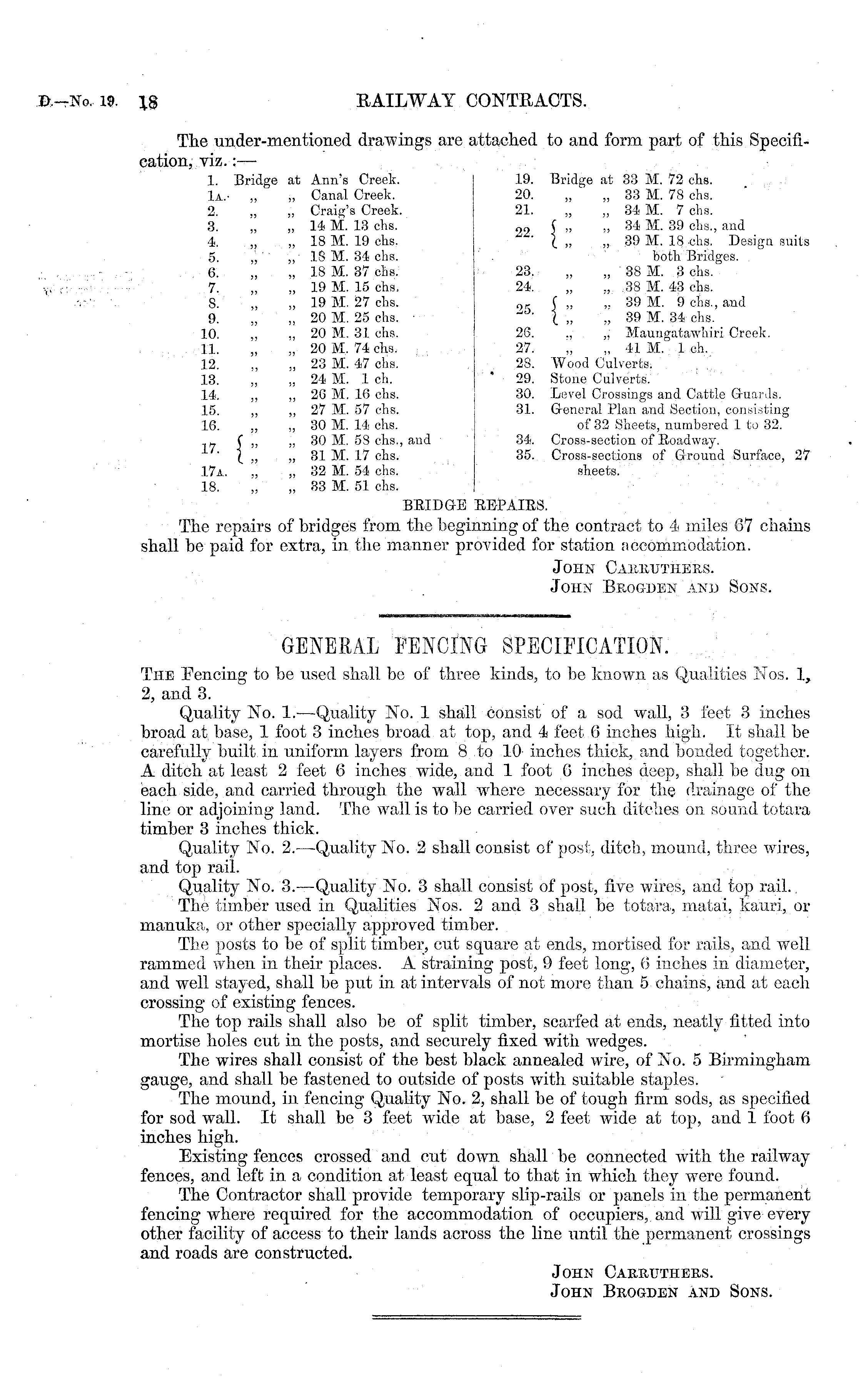 GENERAL FENCING SPECIFICATION. The Eencing to be used shall be of three kinds, to be known as Qualities Nos. 1, 2, and 3. Quality No. 1. —Quality No. 1 shall consist of a sod wall, 3 feet 3 inches broad at base, 1 foot 3 inches broad at top, and 4 feet 6 inches high. It shall be carefully built in uniform layers from 8 to 10- inches thick, and bonded together. A ditch at least 2 feet 6 inches wide, and 1 foot 6 inches deep, shall be dug on each side, and carried through the wall where necessary for the drainage of the line or adjoining land. The wall is to be carried over such ditches on sound totara timber 3 inches thick. Quality No. 2.- —Quality No. 2 shall consist of post, ditch, mound, three wires, and top rail. Quality No. 3. —Quality No. 3 shall consist of post, five wires, and top rail. ; The timber used in Qualities Nos. 2 and 3 shall be totara, matai, kauri, or manuka, or other specially approved timber. The posts to be of split timber, cut square at ends, mortised for rails, and well rammed when in their places. A straining post, 9 feet long, 6 inches in diameter, and well stayed, shall be put in at intervals of not more than 5 chains, and at each crossing of existing fences. The top rails shall also be of split timber, scarfed at ends, neatly fitted into mortise holes cut in the posts, and securely fixed with w redges. The wires shall consist of the best black annealed wire, of No. 5 Birmingham gauge, and shall be fastened to outside of posts with suitable staples. The mound, in fencing Quality No. 2, shall be of tough firm sods, as specified for sod wall. It shall be 3 feet wide at base, 2 feet wide at ton, and 1 foot 6 inches high. Existing fences crossed and cut down, shall be connected with the railway fences, and left in a condition at least equal to that in. which they were found. The Contractor shall provide temporary slip-rails or panels in the permanent fencing where required for the accommodation of occupiers, and will give every other facility of access to their lands across the line until the permanent crossings and roads are constructed. John Carruthers. John Brogden and Sons.