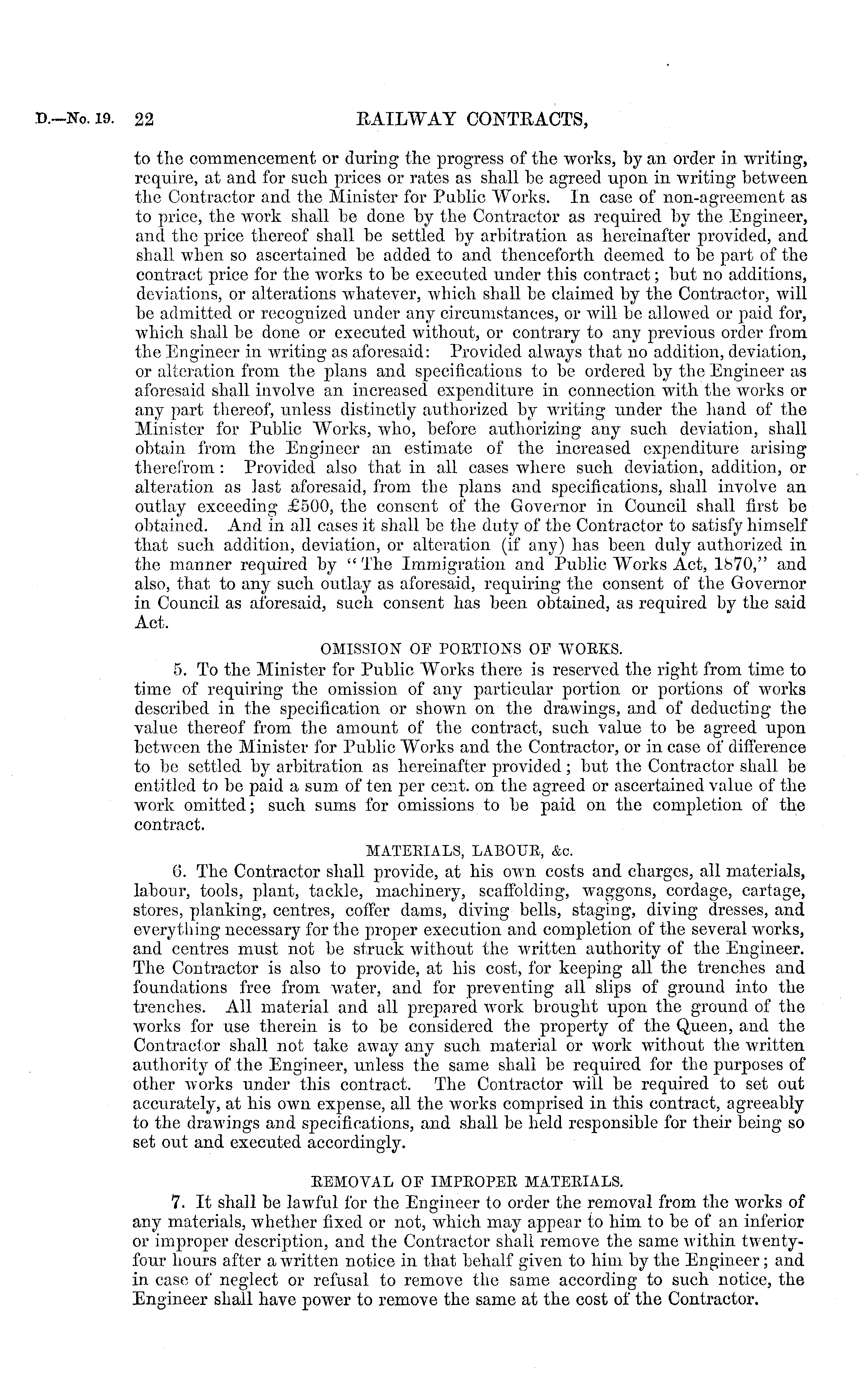 to the commencement or during the progress of the works, by an order in writing, require, at and for such prices or rates as shall be agreed upon in writing between the Contractor and the Minister for Public Works. In case of non-agreement as to price, the work shall be done by the Contractor as required by the Engineer, and the price thereof shall be settled by arbitration as hereinafter provided, and shall when so ascertained be added to and thenceforth deemed to be part of the contract price for the works to be executed under this contract; but no additions, deviations, or alterations whatever, which shall be claimed by the Contractor, will be admitted or recognized under any circumstances, or will be allowed or paid for, which shall be done or executed without, or contrary to any previous order from the Engineer in writing as aforesaid: Provided always that no addition, deviation, or alteration from the plans and specifications to be ordered by the Engineer as aforesaid shall involve an increased expenditure in connection with the works or any part thereof, unless distinctly authorized by writing under the hand of the Minister for Public Works, who, before authorizing any such deviation, shall obtain from the Engineer an estimate of the increased expenditure arising therefrom : Provided also that in all cases where such deviation, addition, or alteration as last aforesaid, from the plans and specifications, shall involve an outlay exceeding £500, the consent of the Governor in Council shall first be obtained. And in all cases it shall be the duty of the Contractor to satisfy himself that such addition, deviation, or alteration (if any) has been duly authorized in the manner required by " The Immigration and Public Works Act, 1870," and also, that to any such outlay as aforesaid, requiring the consent of the Governor in Council as aforesaid, such consent has been obtained, as required by the said Act. OMISSION OE POETIONS OF WOEKS. 5. To the Minister for Public Works there is reserved the right from time to time of requiring the omission of any particular portion or portions of works described in the specification or showm on the drawings, and of deducting the value thereof from the amount of the contract, such value to be agreed upon between the Minister for Public Works and the Contractor, or in case of difference to be settled by arbitration as hereinafter provided; but the Contractor shall be entitled to be paid a sum of ten per cent, on the agreed or ascertained value of the work omitted; such sums for omissions to be paid on the completion of the contract. MATERIALS, LABOUR, &c. 6. The Contractor shall provide, at his own costs and charges, all materials, labour, tools, plant, tackle, machinery, scaffolding, waggons, cordage, cartage, stores, planking, centres, coffer dams, diving bells, staging, diving dresses, and everything necessary for the proper execution and completion of the several works, and centres must not be struck without the written authority of the Engineer. The Contractor is also to provide, at his cost, for keeping all the trenches and foundations free from w rater, and for preventing all slips of ground into the trenches. All material and all prepared work brought upon the ground of the works for use therein is to be considered the property of the Queen, and the Contractor shall not take away any such material or Avork without the written authority of the Engineer, unless the same shall be required for the purposes of other works under this contract. The Contractor will be required to set out accurately, at his own expense, all the works comprised in this contract, agreeably to the drawings and specifications, and shall be held responsible for their being so set out and executed accordingly. REMOVAL OF IMPEOPEE MATEEIALS. 7. It shall be lawful for the Engineer to order the removal from the works of any materials, whether fixed or not, which may appear to him to be of an inferior or improper description, and the Contractor shall remove the same within twentyfour hours after a written notice in that behalf given to him by the Engineer; and in case of neglect or refusal to remove the same according to such notice, the Engineer shall have power to remove the same at the cost of the Contractor.