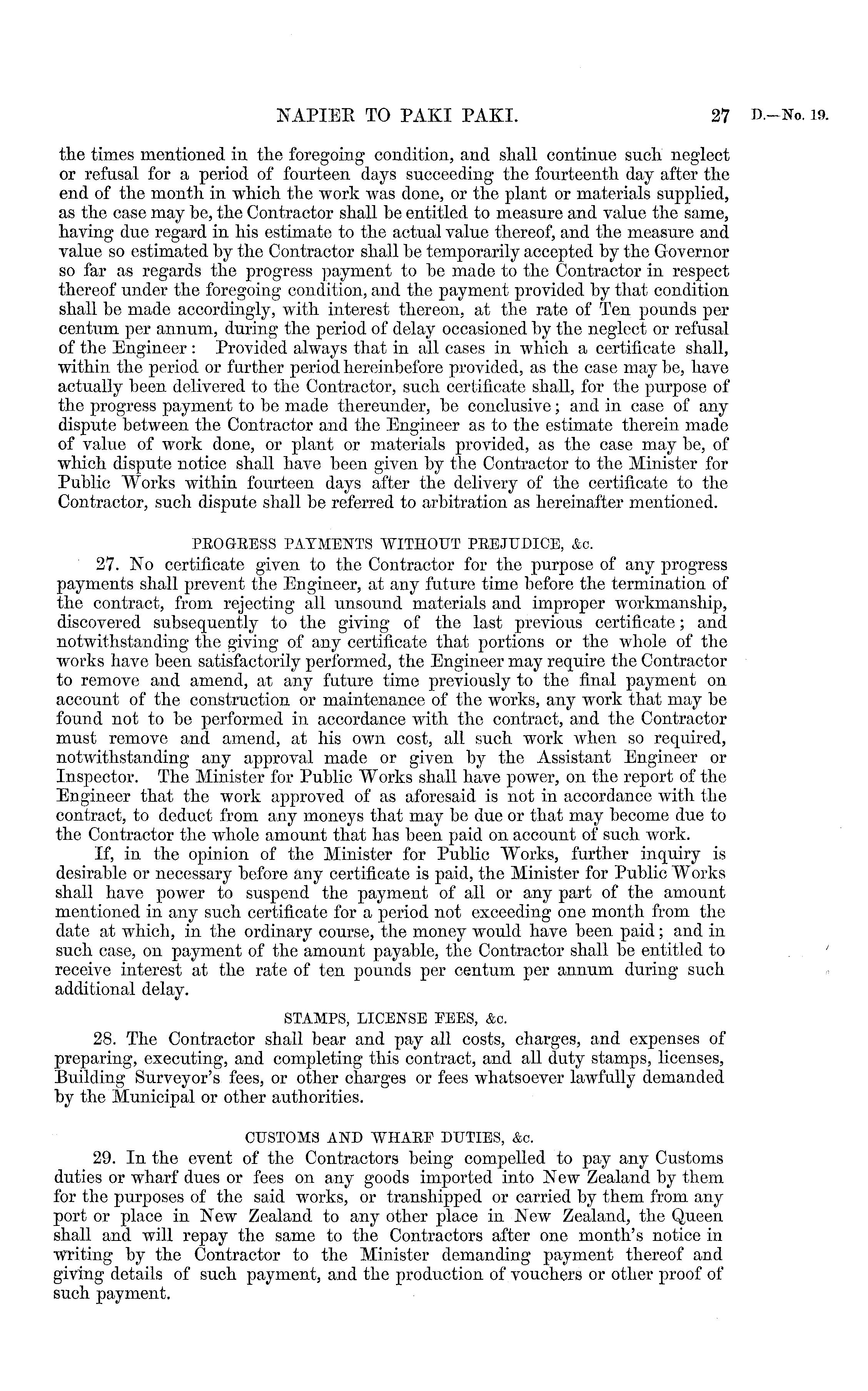 the times mentioned in the foregoing condition, and shall continue such neglect or refusal for a period of fourteen days succeeding the fourteenth day after the end of the month in which the work was done, or the plant or materials supplied, as the case may be, the Contractor shall be entitled to measure and value the same, having due regard in his estimate to the actual value thereof, and the measure and value so estimated by the Contractor shall be temporarily accepted by the Governor so far as regards the progress payment to be made to the Contractor in respect thereof under the foregoing condition, and the payment provided by that condition shall be made accordingly, with interest thereon, at the rate of Ten pounds per centum per annum, during the period of delay occasioned by the neglect or refusal of the Engineer : Provided always that in all cases in which a certificate shall, within the period or further period hereinbefore provided, as the case may be, have actually been delivered to the Contractor, such certificate shall, for the purpose of the progress payment to be made thereunder, be conclusive; and in case of any dispute between the Contractor and the Engineer as to the estimate therein made of value of work done, or plant or materials provided, as the case may be, of which dispute notice shall have been given by the Contractor to the Minister for Public Works within fourteen days after the delivery of the certificate to the Contractor, such dispute shall be referred to arbitration as hereinafter mentioned. PEOGEESS PAYMENTS WITHOUT PEEJUDICE, &o. 27. No certificate given to the Contractor for the purpose of any progress payments shall prevent the Engineer, at any future time before the termination of the contract, from rejecting all unsound materials and improper workmanship, discovered subsequently to the giving of the last previous certificate; and notwithstanding the giving of any certificate that portions or the wdiole of the works have been satisfactorily performed, the Engineer may require the Contractor to remove and amend, at any future time previously to the final payment on account of the construction or maintenance of the works, any work that may be found not to be performed in accordance with the contract, and the Contractor must remove and amend, at his own cost, all such work when so required, notwithstanding any approval made or given by the Assistant Engineer or Inspector. The Minister for Public Works shall have power, on the report of the Engineer that the work approved of as aforesaid is not in accordance with the contract, to deduct from any moneys that may be due or that may become due to the Contractor the whole amount that has been paid on account of such work. If, in the opinion of the Minister for Public Works, further inquiry is desirable or necessary before any certificate is paid, the Minister for Public Works shall have power to suspend the payment of all or any part of the amount mentioned in any such certificate for a period not exceeding one month from the date at which, in the ordinary course, the money would have been paid; and in such case, on payment of the amount payable, the Contractor shall be entitled to receive interest at the rate of ten pounds per centum per annum during such additional delay. STAMPS, LICENSE FEES, &c. 28. The Contractor shall bear and pay all costs, charges, and expenses of preparing, executing, and completing this contract, and all duty stamps, licenses, Building Surveyor's fees, or other charges or fees whatsoever lawfully demanded by the Municipal or other authorities. CUSTOMS AND WHAEF DUTIES, &c. 29. In the event of the Contractors being compelled to pay any Customs duties or wharf dues or fees on any goods imported into New Zealand by them for the purposes of the said works, or transhipped or carried by them from any port or place in New Zealand to any other place in New Zealand, the Queen shall and will repay the same to the Contractors after one month's notice in writing by the Contractor to the Minister demanding payment thereof and giving details of such payment, and the production of vouchers or other proof of such payment.