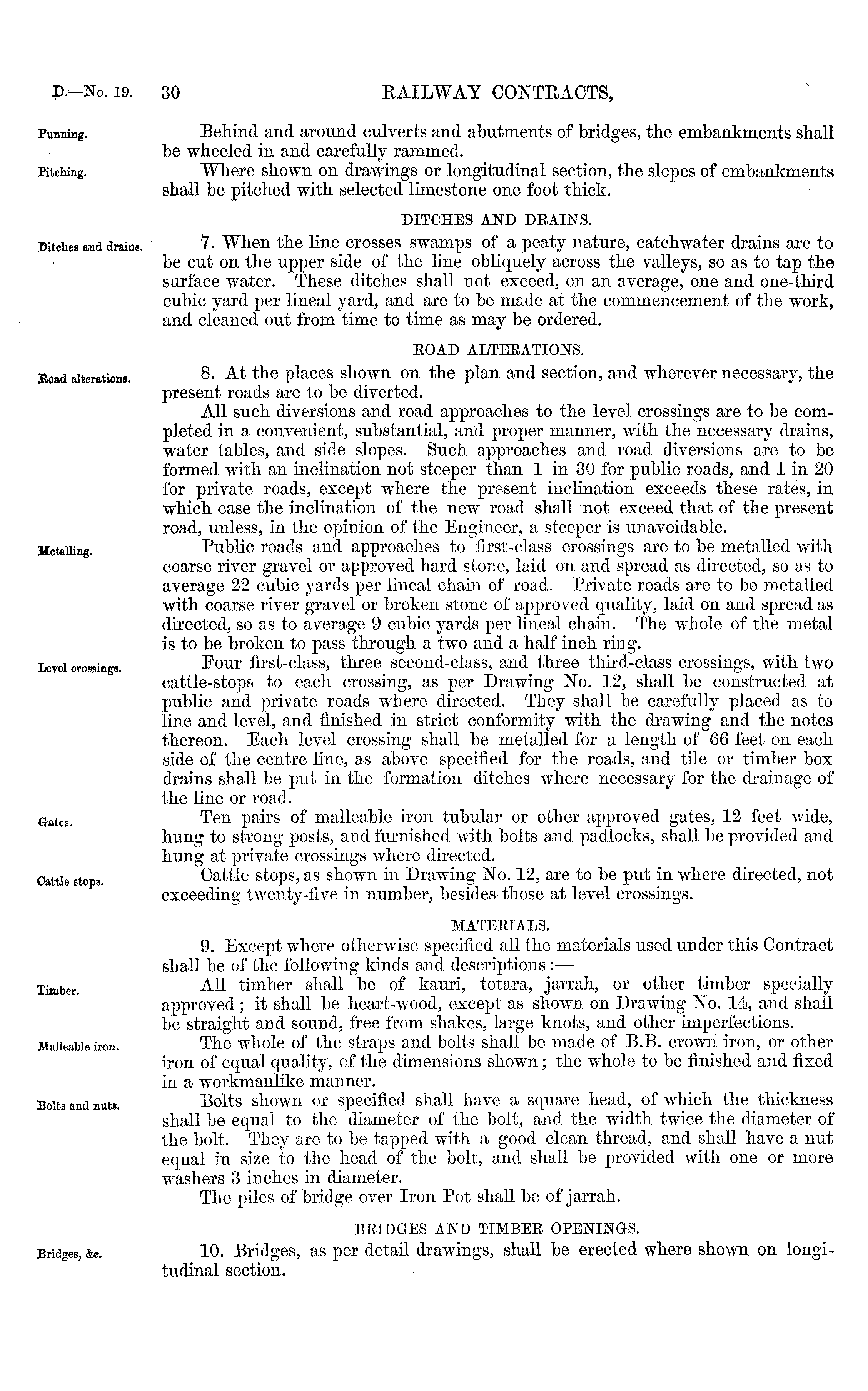 Behind and around culverts and abutments of bridges, the embankments shall be wheeled in and carefully rammed. Where shown on drawings or longitudinal section, the slopes of embankments shall be pitched with selected limestone one foot thick. DITCHES AND DEAINS. 7. When the line crosses swamps of a peaty nature, catchwater drains are to be cut on the upper side of the line obliquely across the valleys, so as to tap the surface water. These ditches shall not exceed, on an average, one and one-third cubic yard per lineal yard, and are to be made at the commencement of the work, and cleaned out from time to time as may be ordered. EOAD ALTEEATIONS. 8. At the places shown on the plan and section, and wherever necessary, the present roads are to be diverted. All such diversions and road approaches to the level crossings are to be completed in a convenient, substantial, and proper manner, with the necessary drains, water tables, and side slopes. Such approaches and road diversions are to be formed with an inclination not steeper than 1 in 30 for public roads, and 1 in 20 for private roads, except where the present inclination exceeds these rates, in which case the inclination of the new road shall not exceed that of the present road, unless, in the opinion of the Engineer, a steeper is unavoidable. Public roads and approaches to first-class crossings are to be metalled with coarse river gravel or approved hard stone, laid on and spread as directed, so as to average 22 cubic yards per lineal chain of road. Private roads are to be metalled with coarse river gravel or broken stone of approved quality, laid on and spread as directed, so as to average 9 cubic yards per lineal chain. The whole of the metal is to be broken to pass through a two and a half inch ring. Eour first-class, three second-class, and three third-class crossings, with two cattle-stops to each crossing, as per Drawing No. 12, shall be constructed at public and private roads where directed. They shall be carefully placed as to line and level, and finished in strict conformity with the drawing and the notes thereon. Each level crossing shall be metalled for a length of 66 feet on each side of the centre line, as above specified for the roads, and tile or timber box drains shall be put in the formation ditches where necessary for the drainage of the line or road. Ten pairs of malleable iron tubular or other approved gates, 12 feet wide, hung to strong posts, and furnished with bolts and padlocks, shall be provided and hung at private crossings where directed. Cattle stops, as shown in Drawing No. 12, are to be put in where directed, not exceeding twenty-five in number, besides those at level crossings. MATEEIALS. 9. Except where otherwise specified all the materials used under this Contract shall be of the following kinds and descriptions :■ — All timber shall be of kauri, totara, jarrah, or other timber specially approved; it shall be heart-wood, except as shown on Drawing No. 14, and shall be straight and sound, free from shakes, large knots, and other imperfections. The whole of the straps and bolts shall be made of 8.8. crown iron, or other iron of equal quality, of the dimensions shown; the whole to be finished and fixed in a workmanlike manner. Bolts shown or specified shall have a square head, of which the thickness shall be equal to the diameter of the bolt, and the width twice the diameter of the bolt. They are to be tapped with a good clean thread, and shall have a nut equal in size to the head of the bolt, and shall be provided with one or more washers 3 inches in diameter. The piles of bridge over Iron Pot shall be of jarrah. BEIDGES AND TIMBEE OPENINGS. 10. Bridges, as per detail drawings, shall be erected where shown on longitudinal section.