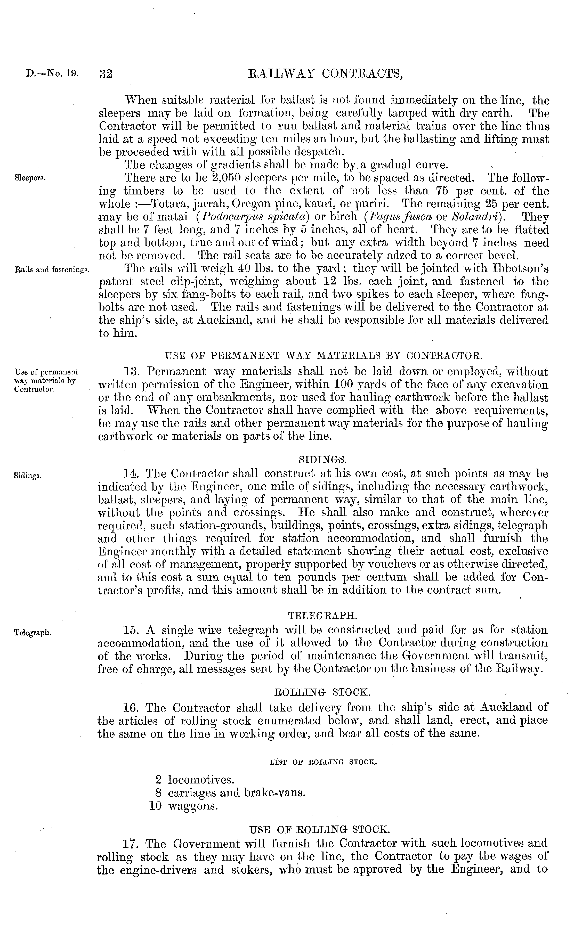 When suitable material for ballast is not found immediately on the line, the sleepers may be laid on formation, being carefully tamped with dry earth. The Contractor will be permitted to run ballast and material trains over the line thus laid at a speed not exceeding ten miles an hour, but the ballasting and lifting must be proceeded with with all possible despatch. The changes of gradients shall be made by a gradual curve. There are to be 2,050 sleepers per mile, to be spaced as directed. The following timbers to be used to the extent of not less than 75 per cent, of the whole : —Totara, jarrah, Oregon pine, kauri, or puriri. The remaining 25 per cent, -may be of matai (Podocarpus spicata) or birch (Fagitsfusca or Solanclri). They shall be 7 feet long, and 7 inches by 5 inches, all of heart. They are to be flatted top and bottom, true and out of wind; but any extra width beyond 7 inches need not be removed. The rail scats are to be accurately adzed to a correct bevel. The rails will weigh 40 lbs. to the yard; they will be jointed Avith Ibbotson's patent steel clip-joint, Aveighing about 12 lbs. each joint, and fastened to the sleepers by six fang-bolts to each rail, and two spikes to each sleeper, Avhere fangbolts are not used. The rails and fastenings will be delivered to the Contractor at the ship's side, at Auckland, and he shall be responsible for all materials delivered to him. USE OF PEEMANENT WAY MATEEIALS BY CONTEACTOE. 13. Permanent way materials shall not be laid dovra or employed, without written permission of the Engineer, within 100 yards of the face of any excaA'ation or the end of any embankments, nor used for hauling earthwork before the ballast is laid. When the Contractor shall have complied with the above requirements, he may use the rails and other permanent way materials for the purpose of hauling earthwork or materials on parts of the line. SIDINGS. 14. The Contractor shall construct at his own cost, at such points as may be indicated by the Engineer, one mile of sidings, including the necessary earthwork, ballast, sleepers, and laying of permanent way, similar to that of the main line, without the points and crossings. He shall also make and construct, wherever required, such station-grounds, buildings, points, crossings, extra sidings, telegraph and other things required for station accommodation, and shall furnish the Engineer monthly with a detailed statement showing their actual cost, exclusive of all cost of management, properly supported by vouchers or as othenvise directed, and to this cost a sum equal to ten pounds per centum shall be added for Contractor's profits, and this amount shall be in addition to the contract sum. TELEGEAPH. 15. A single wire telegraph Avill be constructed and paid for as for station accommodation, and the use of it allowed to the Contractor during construction of the Avorks. During the period of maintenance the Government will transmit, free of charge, all messages sent by the Contractor on the business of the Railway. EOLLING STOCK. 16. The Contractor shall take delivery from the ship's side at Auckland of the articles of rolling stock enumerated below, and shall land, erect, and place the same on the line in Avorking order, and bear all costs of the same. LIST OT EOlilllfG STOCK. 2 locomotives. 8 carriages and brake-vans. 10 Avaggons. USE OF EOLLING STOCK. 17. The Government will furnish the Contractor with such locomotives and rolling stock as they may have on the line, the Contractor to pay the wages of the engine-drivers and stokers, who must be approved by the Engineer, and to