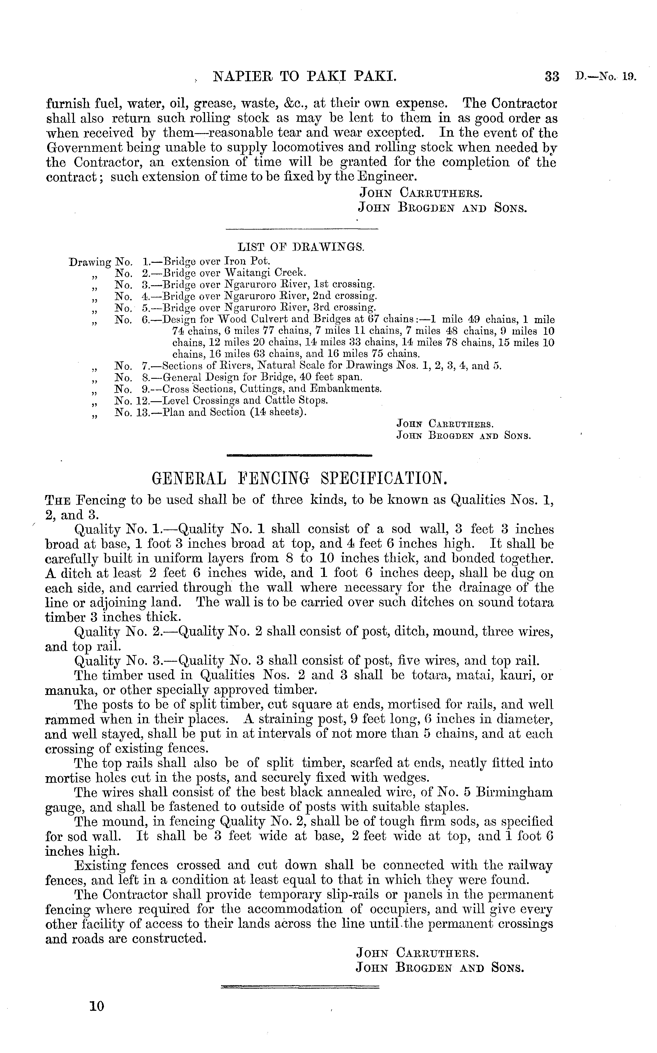 GENERAL FENCING SPECIFICATION. The Eencing to be used shall be of three kinds, to be known as Qualities Nos. 1, 2, and 3. Quality No. 1. —Quality No. 1 shall consist of a sod Avail, 3 feet 3 inches broad at base, 1 foot 3 inches broad at top, and 4 feet 6 inches high. It shall be carefully built in uniform layers from 8 to 10 inches thick, and bonded together. A ditch at least 2 feet 6 inches wide, and 1 foot 6 inches deep, shall be dug on each side, and carried through the wall where necessary for the drainage of the line or adjoining land. The wall is to be carried over such ditches on sound totara timber 3 inches thick. Quality No. 2.- —Quality No. 2 shall consist of post, ditch, mound, three wires, and top rail. Quality No. 3. —Quality No. 3 shall consist of post, five wires, and top rail. The timber used in Qualities Nos. 2 and 3 shall be totara, matai, kauri, or manuka, or other specially approved timber. The posts to be of split timber, cut square at ends, mortised for rails, and Avell rammed Avhen in their places. A straining post, 9 feet long, 6 inches in diameter, and well stayed, shall be put in at intervals of not more than 5 chains, and at each crossing of existing fences. The top rails shall also be of split timber, scarfed at ends, neatly fitted into mortise holes cut in the posts, and securely fixed with Avedges. The wires shall consist of the best black annealed Avire, of No. 5 Birmingham gauge, and shall be fastened to outside of posts with suitable staples. The mound, in fencing Quality No. 2, shall be of tough firm sods, as specified for sod wall. It shall be 3 feet wide at base, 2 feet Avide at top, and 1 foot 6 inches high. Existing fences crossed and cut down shall be connected with the railway fences, and left in a condition at least equal to that in which they were found. The Contractor shall provide temporary slip-rails or panels in the permanent fencing where required for the accommodation of occupiers, and will give every other facility of access to their lands across the line until.the permanent crossings and roads are constructed. John Cabbuthebs. John Bbogden and Sons. 10