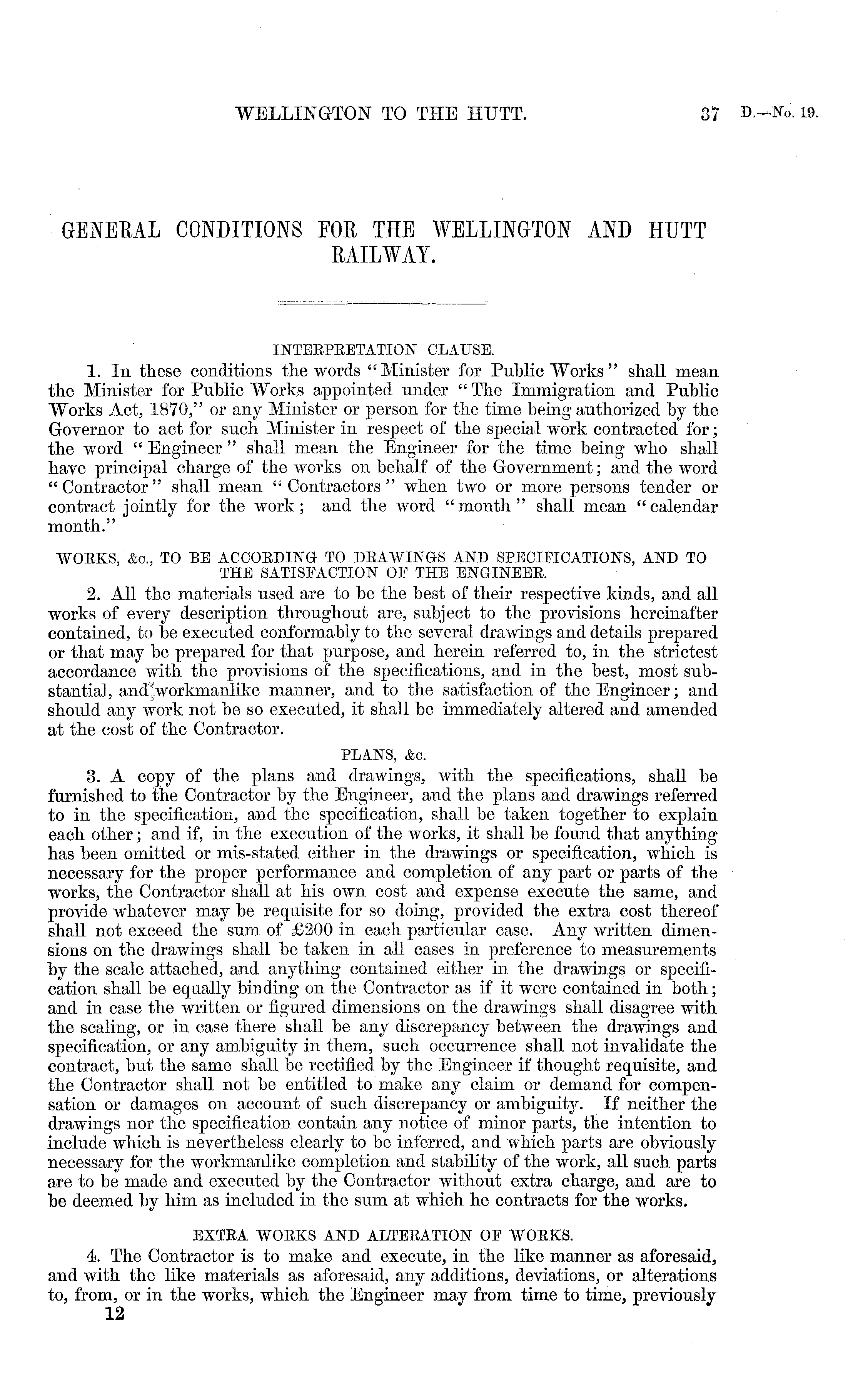 INTEEPEETATION CLAUSE. 1. In these conditions the words "Minister for Public Works " shall mean the Minister for Public Works appointed under " The Immigration and Public Works Act, 1870," or any Minister or person for the time being authorized by the Governor to act for such Minister in respect of the special work contracted for; the word " Engineer " shall mean the Engineer for the time being who shall have principal charge of the works on behalf of the Government; and the word "Contractor" shall mean "Contractors" when tAVO or more persons tender or contract jointly for the work; and the word "month" shall mean "calendar month." WOEKS, &c, TO BE ACCOEDING TO DEAWINGS AND SPECIFICATIONS, AND TO THE SATISFACTION OF THE ENGINEEE. 2. All the materials used are to be the best of their respective kinds, and all works of every description throughout are, subject to the provisions hereinafter contained, to be executed conformably to the several drawings and details prepared or that may be prepared for that purpose, and herein referred to, in the strictest accordance with the provisions of the specifications, and in the best, most substantial, and "workmanlike manner, and to the satisfaction of the Engineer; and should any work not be so executed, it shall be immediately altered and amended at the cost of the Contractor. PLANS, &c. 3. A copy of the plans and drawings, with the specifications, shall be furnished to the Contractor by the Engineer, and the plans and drawings referred to in the specification, and the specification, shall be taken together to explain each other; and if, in the execution of the works, it shall be found that anything has been omitted or mis-stated either in the draAvings or specification, which is necessary for the proper performance and completion of any part or parts of the works, the Contractor shall at his oAvn cost and expense execute the same, and provide whatever may be requisite for so doing, provided the extra cost thereof shall not exceed the sum of £200 in each particular case. Any Avritten dimensions on the drawings shall be taken in all cases in preference to measurements by the scale attached, and anything contained either in the drawings or specification shall be equally binding on the Contractor as if it were contained in both; and in case the written or figured dimensions on the drawings shall disagree with the scaling, or in case there shall be any discrepancy between the drawings and specification, or any ambiguity in them, such occurrence shall not invalidate the contract, but the same shall be rectified by the Engineer if thought requisite, and the Contractor shall not be entitled to make any claim or demand for compensation or damages on account of such discrepancy or ambiguity. If neither the drawings nor the specification contain any notice of minor parts, the intention to include which is nevertheless clearly to be inferred, and which parts are obviously necessary for the workmanlike completion and stability of the work, all such parts are to be made and executed by the Contractor without extra charge, and are to be deemed by him as included in the sum at which he contracts for the works. EXTEA WOEKS AND ALTEEATION OF WOEKS. 4. The Contractor is to make and execute, in the like manner as aforesaid, and Avith the like materials as aforesaid, any additions, deviations, or alterations to, from, or in the works, which the Engineer may from time to time, previously 12