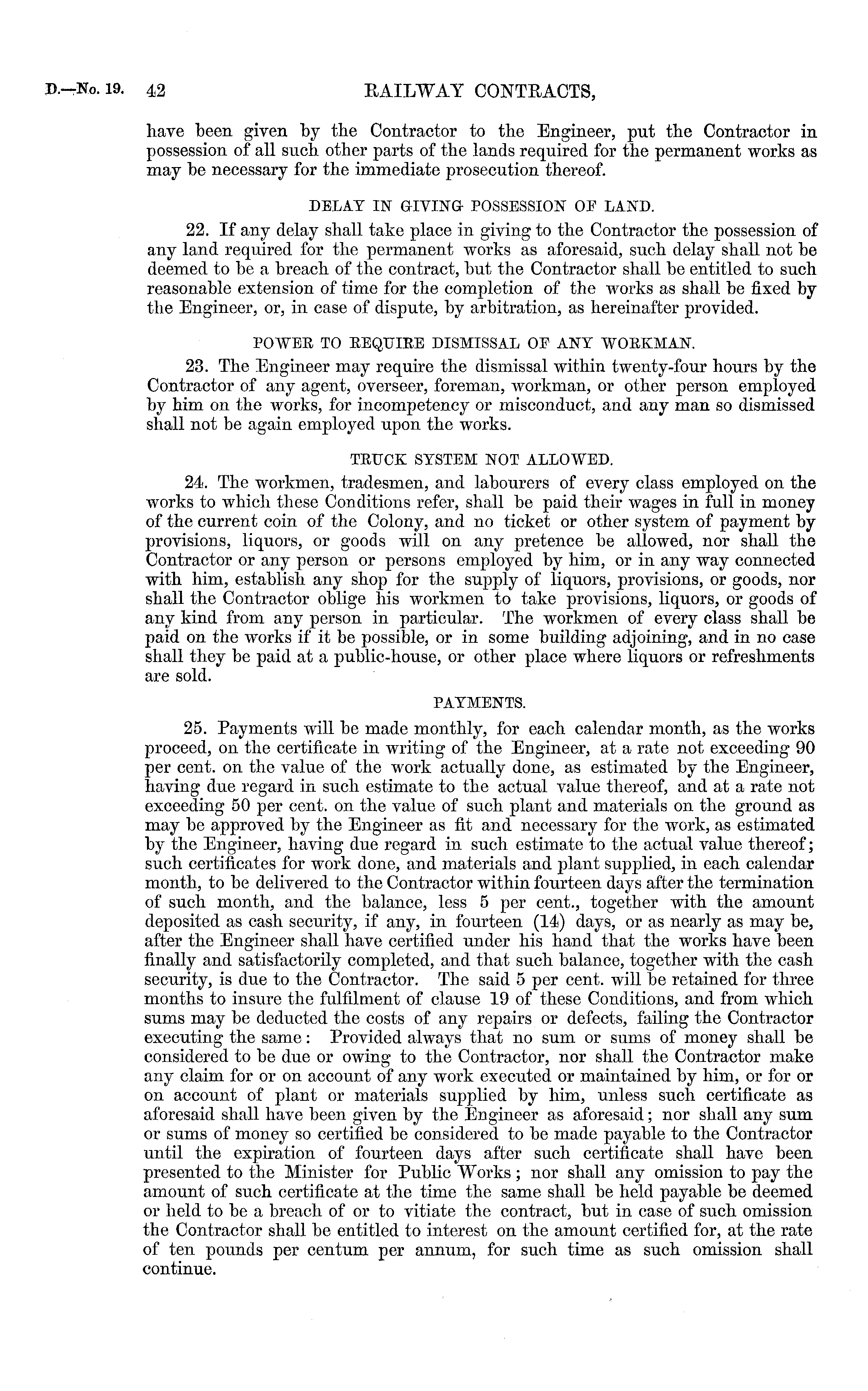 have been given by the Contractor to the Engineer, put the Contractor in possession of all such other parts of the lands required for the permanent works as may be necessary for the immediate prosecution thereof. DELAY IN GIVING POSSESSION OF LAND. 22. If any delay shall take place in giving to the Contractor the possession of any land required for the permanent works as aforesaid, such delay shall not be deemed to be a breach of the contract, but the Contractor shall be entitled to such reasonable extension of time for the completion of the w rorks as shall be fixed by the Engineer, or, in case of dispute, by arbitration, as hereinafter provided. POWEE TO EEQUIEE DISMISSAL OF ANY WOEKMAN. 23. The Engineer may require the dismissal within twenty-four hours by the Contractor of any agent, overseer, foreman, workman, or other person employed by him on the works, for incompetency or misconduct, and any man so dismissed shall not be again employed upon the works. TEUCK SYSTEM NOT ALLOWED. 24. The workmen, tradesmen, and labourers of every class employed on the works to which these Conditions refer, shall be paid their wages in full in money of the current coin of the Colony, and no ticket or other system of payment by provisions, liquors, or goods will on any pretence be allowed, nor shall the Contractor or any person or persons employed by him, or in any way connected with him, establish any shop for the supply of liquors, provisions, or goods, nor shall the Contractor oblige his workmen to take provisions, liquors, or goods of any kind from any person in particular. The workmen of every class shall be paid on the Avorks if it be possible, or in some building adjoining, and in no case shall they be paid at a public-house, or other place where liquors or refreshments are sold. PAYMENTS. 25. Payments will be made monthly, for each calendar month, as the works proceed, on the certificate in writing of the Engineer, at a rate not exceeding 90 per cent, on the value of the work actually done, as estimated by the Engineer, having due regard in such estimate to the actual value thereof, and at a rate not exceeding 50 per cent, on the value of such plant and materials on the ground as may be approved by the Engineer as fit and necessary for the Avork, as estimated by the Engineer, having due regard in such estimate to the actual value thereof; such certificates for work done, and materials and plant supplied, in each calendar month, to be delivered to the Contractor within fourteen days after the termination of such month, and the balance, less 5 per cent., together with the amount deposited as cash security, if any, in fourteen (14) days, or as nearly as may be, after the Engineer shall have certified under his hand that the works have been finally and satisfactorily completed, and that such balance, together with the cash security, is due to the Contractor. The said 5 per cent, will be retained for three months to insure the fulfilment of clause 19 of these Conditions, and from which sums may be deducted the costs of any repairs or defects, failing the Contractor executing the same: Provided always that no sum or sums of money shall be considered to be due or owing to the Contractor, nor shall the Contractor make any claim for or on account of any work executed or maintained by him, or for or on account of plant or materials supplied by him, unless such certificate as aforesaid shall have been given by the Engineer as aforesaid; nor shall any sum or sums of money so certified be considered to be made payable to the Contractor until the expiration of fourteen days after such certificate shall have been presented to the Minister for Public Works; nor shall any omission to pay the amount of such certificate at the time the same shall be held payable be deemed or held to be a breach of or to vitiate the contract, but in case of such omission the Contractor shall be entitled to interest on the amount certified for, at the rate of ten pounds per centum per annum, for such time as such omission shall continue.