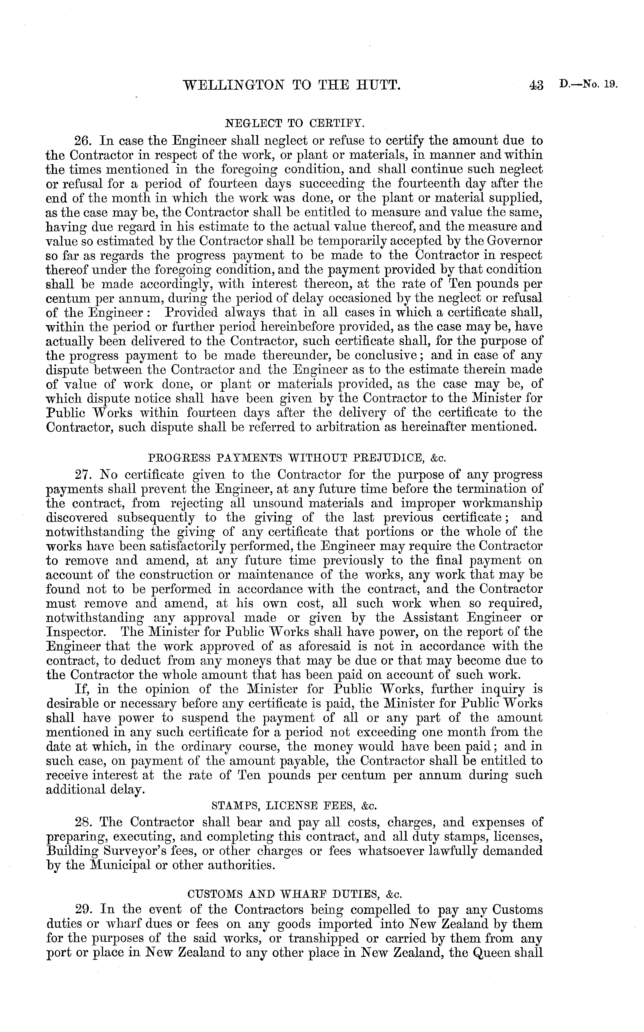 NEGLECT TO CEETIFY. 26. In case the Engineer shall neglect or refuse to certify the amount due to the Contractor in respect of the work, or plant or materials, in manner and within the times mentioned in the foregoing condition, and shall continue such neglect or refusal for a period of fourteen days succeeding the fourteenth day after the end of the month in which the work was done, or the plant or material supplied, as the case may be, the Contractor shall be entitled to measure and value the same, having due regard in his estimate to the actual value thereof, and the measure and value so estimated by the Contractor shall be temporarily accepted by the Governor so far as regards the progress payment to be made to the Contractor in respect thereof under the foregoing condition, and the payment provided by that condition shall be made accordingly, with interest thereon, at the rate of Ten pounds per centum per annum, during the period of delay occasioned by the neglect or refusal of the Engineer : Provided always that in all cases in which a certificate shall, within the period or further period hereinbefore provided, as the case may be, have actually been delivered to the Contractor, such certificate shall, for the purpose of the progress payment to be made thereunder, be conclusive; and in case of any dispute between the Contractor and the Engineer as to the estimate therein made of value of work done, or plant or materials provided, as the case may be, of which dispute notice shall have been given by the Contractor to the Minister for Public Works wdthin fourteen days after the delivery of the certificate to the Contractor, such dispute shall be referred to arbitration as hereinafter mentioned. PEOGEESS PAYMENTS WITHOUT PEEJUDICE, &c. 27. No certificate given to the Contractor for the purpose of any progress payments shall prevent the Engineer, at any future time before the termination of the contract, from rejecting all unsound materials and improper workmanship discovered subsequently to the giving of the last previous certificate; and notwithstanding the giving of any certificate that portions or the whole of the works have been satisfactorily performed, the Engineer may require the Contractor to remove and amend, at any future time previously to the final payment on account of the construction or maintenance of the works, any work that may be found not to be performed in accordance with the contract, and the Contractor must remove and amend, at his own cost, all such work when so required, notwithstanding any approval made or given by the Assistant Engineer or Inspector. The Minister for Public Works shall have power, on the report of the Engineer that the work approved of as aforesaid is not in accordance with the contract, to deduct from any moneys that may be due or that may become due to the Contractor the Avhole amount that has been paid on account of such work. If, in the opinion of the Minister for Public Works, further inquiry is desirable or necessary before any certificate is paid, the Minister for Public Works shall have power to suspend the payment of all or any part of the amount mentioned in any such certificate for a period not exceeding one month from the date at which, in the ordinary course, the money would have been paid; and in such case, on payment of the amount payable, the Contractor shall be entitled to receive interest at the rate of Ten pounds per centum per annum during such additional delay. STAMPS, LICENSE FEES, &c. 28. The Contractor shall bear and pay all costs, charges, and expenses of preparing, executing, and completing this contract, and all duty stamps, licenses, Building Surveyor's fees, or other charges or fees whatsoever lawfully demanded by the Municipal or other authorities. CUSTOMS AND WHAEF DUTIES, &o. 29. In the event of the Contractors being compelled to pay any Customs duties or Avharf dues or fees on any goods imported into New Zealand by them for the purposes of the said works, or transhipped or carried by them from any port or place in New Zealand to any other place in New Zealand, the Queen shall