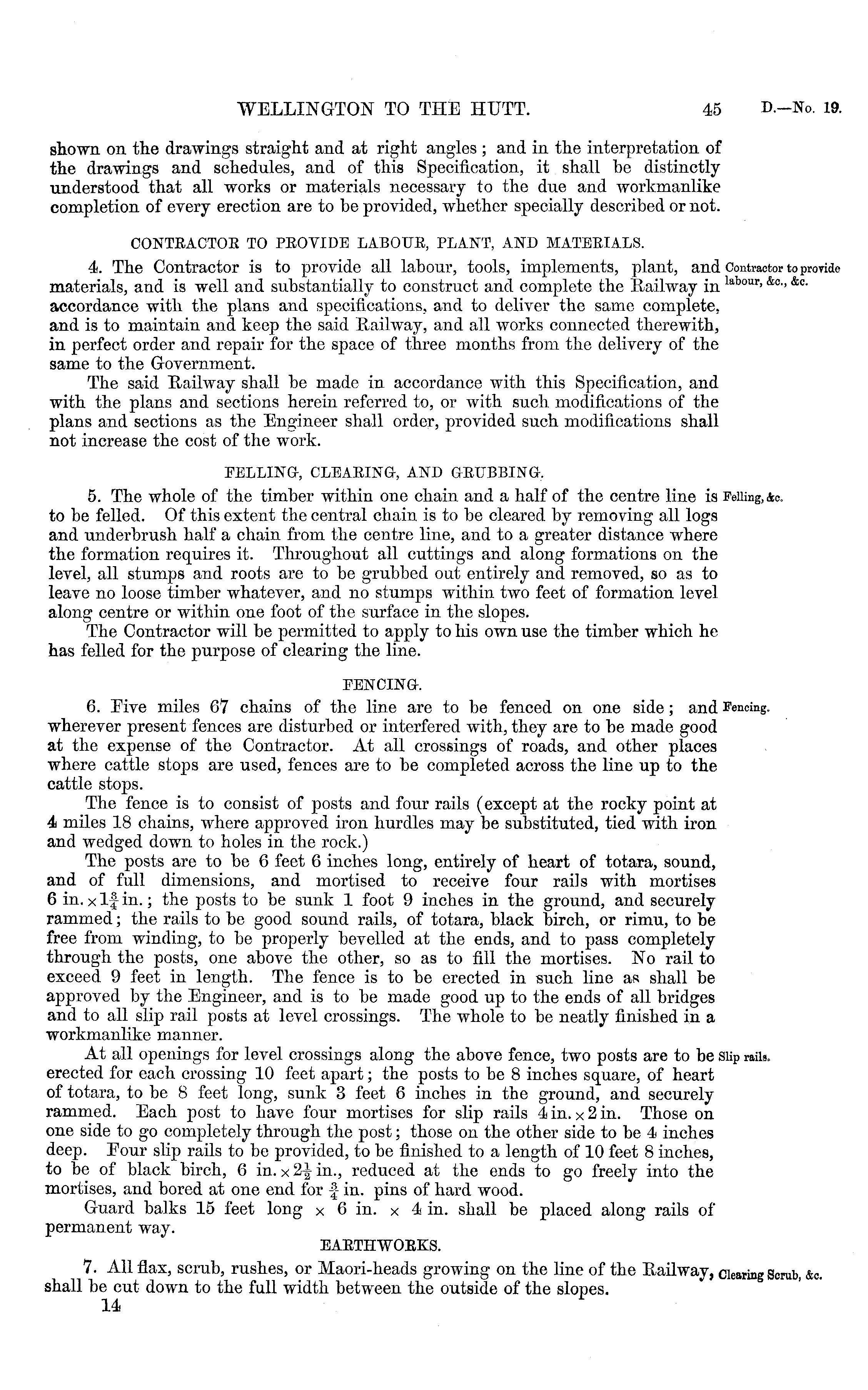 shown on the drawings straight and at right angles ; and in the interpretation of the drawings and schedules, and of this Specification, it shall be distinctly understood that all works or materials necessary to the due and workmanlike completion of every erection are to be provided, whether specially described or not. CONTEACTOE TO PEOVIDE LABOUE, PLANT, AND MATEEIALS. 4. The Contractor is to provide all labour, tools, implements, plant, and materials, and is well and substantially to construct and complete the Railway in accordance with the plans and specifications, and to deliver the same complete, and is to maintain and keep the said Railway, and all Avorks connected therewith, in perfect order and repair for the space of three months from the delivery of the same to the Government. The said Railway shall be made in accordance Avith this Specification, and with the plans and sections herein referred to, or with such modifications of the plans and sections as the Engineer shall order, provided such modifications shall not increase the cost of the work. FELLING, CLEAEING, AND GEUBBING. 5. The whole of the timber within one chain and a half of the centre line is to be felled. Of this extent the central chain is to be cleared by removing all logs and underbrush half a chain from the centre line, and to a greater distance where the formation requires it. Throughout all cuttings and along formations on the level, all stumps and roots are to be grubbed out entirely and removed, so as to leave no loose timber whatever, and no stumps within two feet of formation level along centre or within one foot of the surface in the slopes. The Contractor will be permitted to apply to his own use the timber which he has felled for the purpose of clearing the line. FENCING. 6. Pive miles 67 chains of the line are to be fenced on one side; and wherever present fences are disturbed or interfered with, they are to be made good at the expense of the Contractor. At all crossings of roads, and other places where cattle stops are used, fences are to be completed across the line up to the cattle stops. The fence is to consist of posts and four rails (except at the rocky point at 4 miles 18 chains, wdiere approved iron hurdles may be substituted, tied with iron and wedged down to holes in the rock.) The posts are to be 6 feet 6 inches long, entirely of heart of totara, sound, and of full dimensions, and mortised to receive four rails with mortises 6 in. xlf in.; the posts to be sunk 1 foot 9 inches in the ground, and securely rammed; the rails to be good sound rails, of totara, black birch, or rimu, to be free from winding, to be properly bevelled at the ends, and to pass completely through the posts, one above the other, so as to fill the mortises. No rail to exceed 9 feet in length. The fence is to be erected in such line as shall be approved by the Engineer, and is to be made good up to the ends of all bridges and to all slip rail posts at level crossings. The whole to be neatly finished in a workmanlike manner. At all openings for level crossings along the above fence, two posts are to be i erected for each crossing 10 feet apart; the posts to be 8 inches square, of heart of totara, to be 8 feet long, sunk 3 feet 6 inches in the ground, and securely rammed. Each post to have four mortises for slip rails 4 in. x 2 in. Those on one side to go completely through the post; those on the other side to be 4 inches deep. Pour slip rails to be provided, to be finished to a length of 10 feet 8 inches, to be of black birch, 6 in. x2|-in., reduced at the ends to go freely into the mortises, and bored at one end for f in. pins of hard wood. Guard balks 15 feet long x 6 in. x 4 in. shall be placed along rails of permanent way. EAETHWOEKS. 7. All flax, scrub, rushes, or Maori-heads growing on the line of the Railway, < shall be cut down to the full width between the outside of the slopes. 14