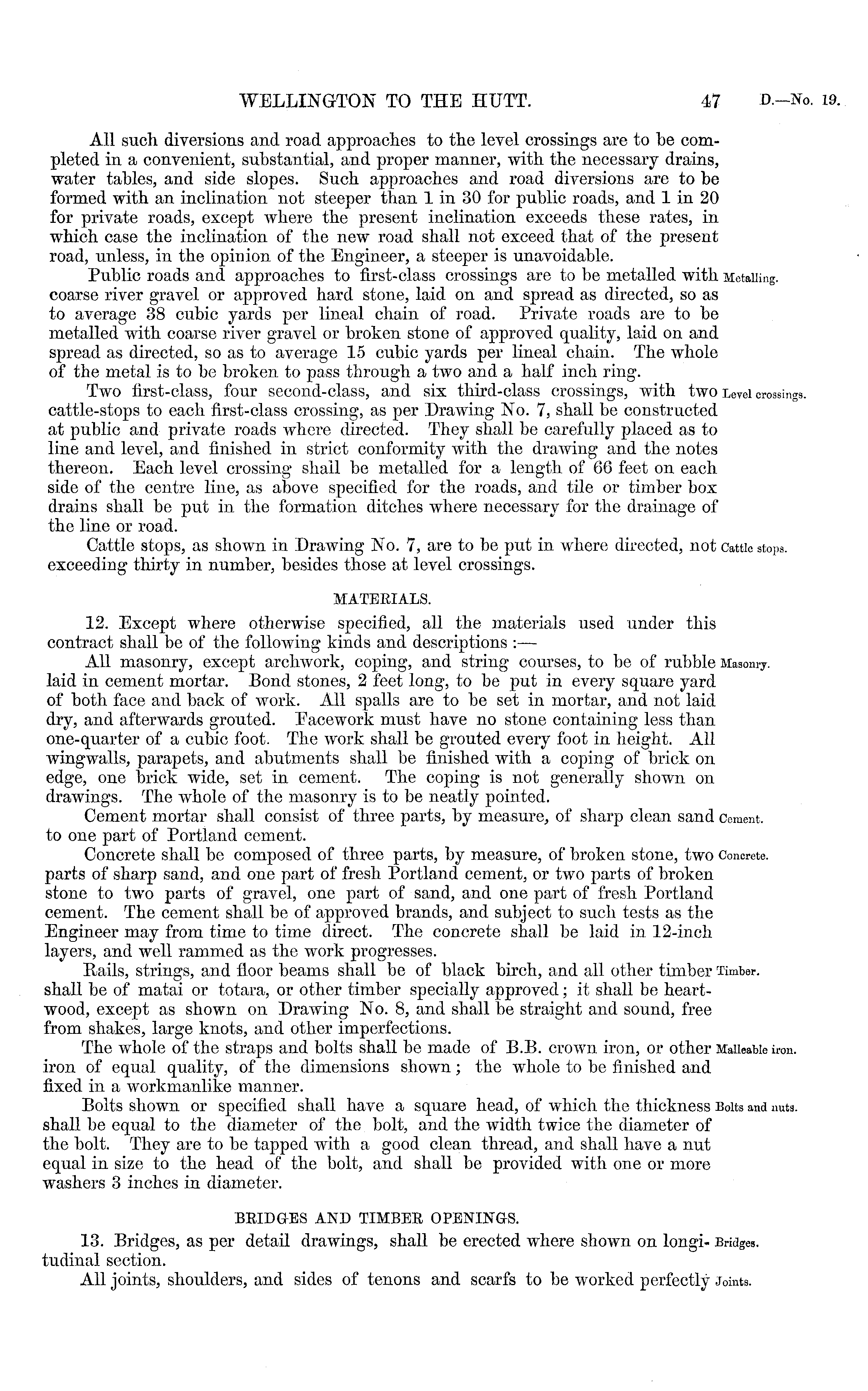 All such diversions and road approaches to the level crossings are to be completed in a convenient, substantial, and proper manner, Avith the necessary drains, water tables, and side slopes. Such approaches and road diversions are to be formed with an inclination not steeper than 1 in 30 for public roads, and 1 in 20 for private roads, except where the present inclination exceeds these rates, in which case the inclination of the new road shall not exceed that of the present road, unless, in the opinion of the Engineer, a steeper is unavoidable. Public roads and approaches to first-class crossings are to be metalled with coarse river gravel or approved hard stone, laid on and spread as directed, so as to average 38 cubic yards per lineal chain of road. Private roads are to be metalled with coarse river gravel or broken stone of approved quality, laid on and spread as directed, so as to average 15 cubic yards per lineal chain. The whole of the metal is to be broken to pass through a two and a half inch ring. Tavo first-class, four second-class, and six third-class crossings, Avith two cattle-stops to each first-class crossing, as per Drawing No. 7, shall be constructed at public and private roads where directed. They shall be carefully placed as to line and level, and finished in strict conformity with the drawing and the notes thereon. Each level crossing shall be metalled for a length of 66 feet on each side of the centre line, as above specified for the roads, and tile or timber box drains shall be put in the formation ditches Avhere necessary for the drainage of the line or road. Cattle stops, as shown in Drawing No. 7, are to be put in where directed, not i exceeding thirty in number, besides those at level crossings. MATEEIALS. 12. Except where otherwise specified, all the materials used under this contract shall be of the folloAving kinds and descriptions : — All masonry, except archwork, coping, and string courses, to be of rubble ] laid in cement mortar. Bond stones, 2 feet long, to be put in every square yard of both face and back of work. All spalls are to be set in mortar, and not laid dry, and afterwards grouted. Pacework must have no stone containing less than one-quarter of a cubic foot. The work shall be grouted every foot in height. All Avingwalls, parapets, and abutments shall be finished with a coping of brick on edge, one brick wide, set in cement. The coping is not generally shown on draAvings. The whole of the masonry is to be neatly pointed. Cement mortar shall consist of three parts, by measure, of sharp clean sand ( to one part of Portland cement. Concrete shall be composed of three parts, by measure, of broken stone, two ( parts of sharp sand, and one part of fresh Portland cement, or two parts of broken stone to two parts of gravel, one part of sand, and one part of fresh Portland cement. The cement shall be of approved brands, and subject to such tests as the Engineer may from time to time direct. The concrete shall be laid in 12-inch layers, and well rammed as the Avork progresses. Rails, strings, and floor beams shall be of black birch, and all other timber 'i shall be of matai or totara, or other timber specially approved; it shall be heartwood, except as shown on Drawing No. 8, and shall be straight and sound, free from shakes, large knots, and other imperfections. The whole of the straps and bolts shall be made of 8.8. crown iron, or other \ iron of equal quality, of the dimensions shown; the whole to be finished and fixed in a workmanlike manner. Bolts shown or specified shall have a square head, of which the thickness b shall be equal to the diameter of the bolt, and the width twice the diameter of the bolt. They are to be tapped with a good clean thread, and shall have a nut equal in size to the head of the bolt, and shall be provided with one or more washers 3 inches in diameter. BEIDGES AND TIMBEE OPENINGS. 13. Bridges, as per detail drawings, shall be erected Avhere shoAvn on longi- b tudinal section. All joints, shoulders, and sides of tenons and scarfs to be worked perfectly j