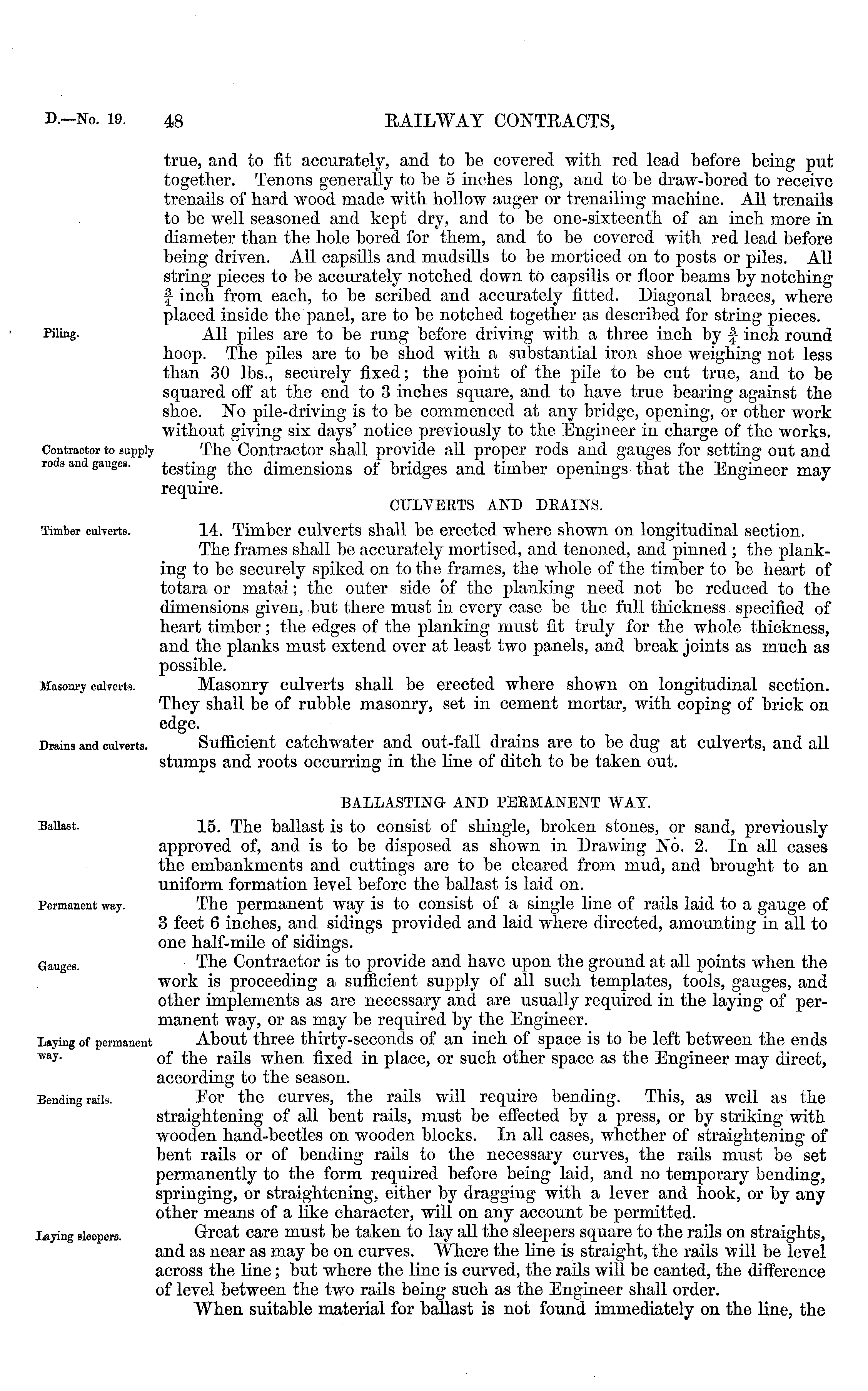 true, and to fit accurately, and to be covered with red lead before being put together. Tenons generally to be 5 inches long, and to be draw-bored to receive trenails of hard wood made with hollow auger or trenailing machine. All trenails to be w rell seasoned and kept dry, and to be one-sixteenth of an inch more in diameter than the hole bored for them, and to be covered with red lead before being driven. All capsills and mudsills to be morticed on to posts or piles. All string pieces to be accurately notched down to capsills or floor beams by notching f inch from each, to be scribed and accurately fitted. Diagonal braces, where placed inside the panel, are to be notched together as described for string pieces. All piles are to be rung before driving with a three inch by f inch round hoop. The piles are to be shod with a substantial iron shoe weighing not less than 30 lbs., securely fixed; the point of the pile to be cut true, and to be squared off at the end. to 3 inches square, and to have true bearing against the shoe. No pile-driving is to be commenced at any bridge, opening, or other work without giving six days' notice previously to the Engineer in charge of the works. The Contractor shall provide all proper rods and gauges for setting out and testing the dimensions of bridges and timber openings that the Engineer may require. CULVEETS AND DEAINS. 14. Timber culverts shall be erected where shown on longitudinal section. The frames shall be accurately mortised, and tenoned, and pinned ; the planking to be securely spiked on to the frames, the whole of the timber to be heart of totara or matai; the outer side of the planking need not be reduced to the dimensions given, but there must in every case be the full thickness specified of heart timber; the edges of the planking must fit truly for the whole thickness, and the planks must extend over at least two panels, and break joints as much as possible. Masonry culverts shall be erected where shown on longitudinal section. They shall be of rubble masonry, set in cement mortar, with coping of brick on edge. Sufficient catchwater and out-fall drains are to be dug at culverts, and all stumps and roots occurring in the line of ditch to be taken out. BALLASTING AND PEEMANENT WAY. 15. The ballast is to consist of shingle, broken stones, or sand, previously approved of, and is to be disposed as shown in Drawing No. 2. In all cases the embankments and cuttings are to be cleared from mud, and brought to an uniform formation level before the ballast is laid on. The permanent way is to consist of a single line of rails laid to a gauge of 3 feet 6 inches, and sidings provided and laid where directed, amounting in all to one half-mile of sidings. The Contractor is to provide and have upon the ground at all points when the work is proceeding a sufficient supply of all such templates, tools, gauges, and other implements as are necessary and are usually required in the laying of permanent way, or as may be required by the Engineer. About three thirty-seconds of an inch of space is to be left between the ends of the rails when fixed in place, or such other space as the Engineer may direct, according to the season. Por the curves, the rails will require bending. This, as well as the straightening of all bent rails, must be effected by a press, or by striking with wooden hand-beetles on wooden blocks. In all cases, whether of straightening of bent rails or of bending rails to the necessary curves, the rails must be set permanently to the form required before being laid, and no temporary bending, springing, or straightening, either by dragging with a lever and nook, or by any other means of a like character, will on any account be permitted. Great care must be taken to lay all the sleepers square to the rails on straights, and as near as may be on curves. Where the line is straight, the rails will be level across the line; but where the line is curved, the rails will be canted, the difference of level between the two rails being such as the Engineer shall order. When suitable material for ballast is not found immediately on the line, the