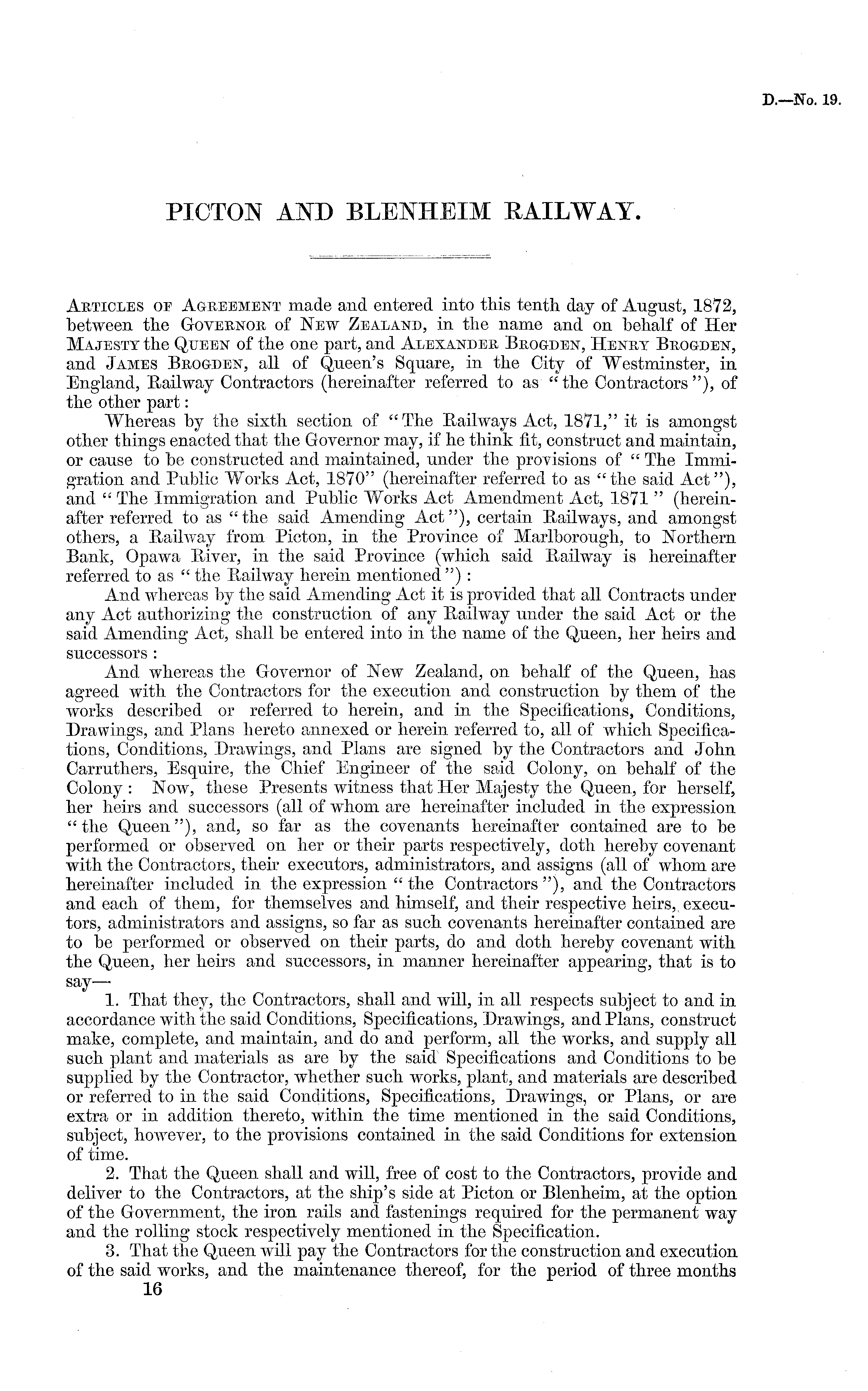 Abticles oe Agbeement made and entered into this tenth day of August, 1872, between the Govebnob of New Zealand, in the name and on behalf of Her Majesty the Queen of the one part, and Alexandeb Bbogden, Henbt Bbogden, and James Bbogden, all of Queen's Square, in the City of Westminster, in England, Railway Contractors (hereinafter referred to as " the Contractors "), of the other part: Whereas by the sixth section of "The Railways Act, 1871," it is amongst other things enacted that the Governor may, if he think fit, construct and maintain, or cause to be constructed and maintained, under the provisions of " The Immigration and Public Works Act, 1870" (hereinafter referred to as "the said Act"), and " The Immigration and Public Works Act Amendment Act, 1871 " (hereinafter referred to as "the said Amending Act"), certain Railways, and amongst others, a Railway from Picton, in the Province of Marlborough, to Northern Bank, Opawa River, in the said Province (Avhich said Railway is hereinafter referred to as " the Railway herein mentioned") : And Avhercas by the said Amending Act it is provided that all Contracts under any Act authorizing the construction of any Railway under the said Act or the said Amending Act, shall be entered into in the name of the Queen, her heirs and successors : And Avhereas the Governor of New Zealand, on behalf of the Queen, has agreed with the Contractors for the execution and construction by them of the works described or referred to herein, and in the Specifications, Conditions, Drawings, and Plans hereto annexed or herein referred to, all of which Specifications, Conditions, Drawings, and Plans are signed by the Contractors and John Carruthers, Esquire, the Chief Engineer of the said Colony, on behalf of the Colony : Noav, these Presents witness that Her Majesty the Queen, for herself, her heirs and successors (all of whom are hereinafter included in the expression "the Queen"), and, so far as the covenants hereinafter contained are to be performed or observed on her or their parts respectively, doth hereby covenant with the Contractors, their executors, administrators, and assigns (all of whom are hereinafter included in the expression " the Contractors "), and the Contractors and each of them, for themselves and himself, and their respective heirs,, executors, administrators and assigns, so far as such covenants hereinafter contained are to be performed or observed on their parts, do and doth hereby covenant with the Queen, her heirs and successors, in manner hereinafter appearing, that is to say— 1. That they, the Contractors, shall and will, in all respects subject to and in accordance Avith the said Conditions, Specifications, DraAvings, and Plans, construct make, complete, and maintain, and do and perform, all the works, and supply all such plant and materials as are by the said Specifications and Conditions to be supplied by the Contractor, Avhether such works, plant, and materials are described or referred to in the said Conditions, Specifications, DraAvings, or Plans, or are extra or in addition thereto, within the time mentioned in the said Conditions, subject, hoAvever, to the provisions contained in the said Conditions for extension of time. 2. That the Queen shall and will, free of cost to the Contractors, provide and deliver to the Contractors, at the ship's side at Picton or Blenheim, at the option of the Government, the iron rails and fastenings required for the permanent way and the rolling stock respectively mentioned in the Specification. 3. That the Queen Avill pay the Contractors for the construction and execution of the said works, and the maintenance thereof, for the period of three months 16