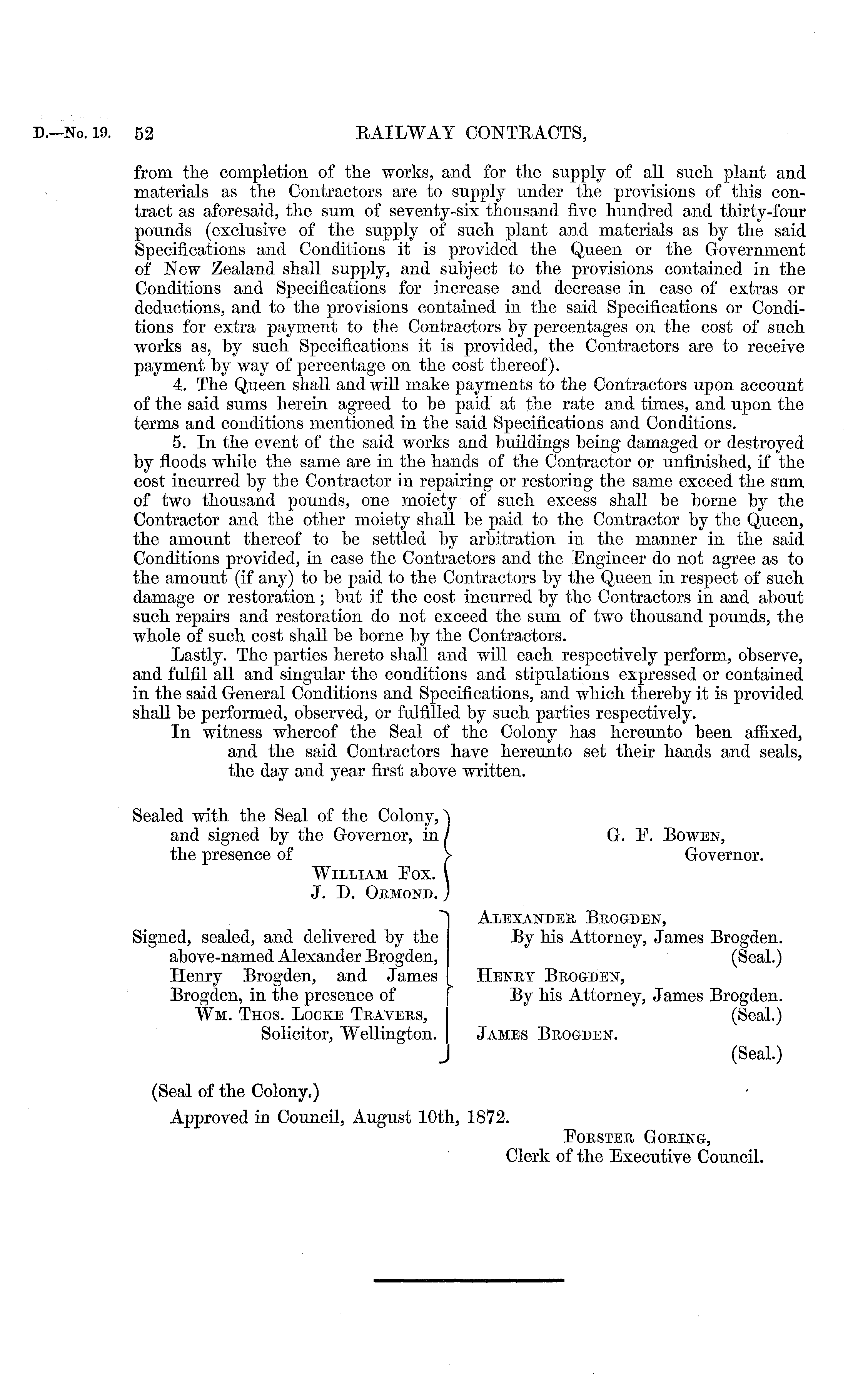 from the completion of the works, and for the supply of all such plant and materials as the Contractors are to supply under the provisions of this contract as aforesaid, the sum of seventy-six thousand five hundred and thirty-four pounds (exclusive of the supply of such plant and materials as by the said Specifications and Conditions it is provided the Queen or the Government of New Zealand shall supply, and subject to the provisions contained in the Conditions and Specifications for increase and decrease in case of extras or deductions, and to the provisions contained in the said Specifications or Conditions for extra payment to the Contractors by percentages on the cost of such works as, by such Specifications it is provided, the Contractors are to receive payment by way of percentage on the cost thereof). 4. The Queen shall and will make payments to the Contractors upon account of the said sums herein agreed to be paid at the rate and times, and upon the terms and conditions mentioned in the said Specifications and Conditions. 5. In the event of the said works and buildings being damaged or destroyed by floods while the same are in the hands of the Contractor or unfinished, if the cost incurred by the Contractor in repairing or restoring the same exceed the sum of two thousand pounds, one moiety of such excess shall be borne by the Contractor and the other moiety shall be paid to the Contractor by the Queen, the amount thereof to be settled by arbitration in the manner in the said Conditions provided, in case the Contractors and the Engineer do not agree as to the amount (if any) to be paid to the Contractors by the Queen in respect of such damage or restoration; but if the cost incurred by the Contractors in and about such repairs and restoration do not exceed the sum of two thousand pounds, the whole of such cost shall be borne by the Contractors. Lastly. The parties hereto shall and will each respectively perform, observe, and fulfil all and singular the conditions and stipulations expressed or contained in the said General Conditions and Specifications, and which thereby it is provided shall be performed, observed, or fulfilled by such parties respectively. In witness whereof the Seal of the Colony has hereunto been affixed, and the said Contractors have hereunto set their hands and seals, the day and year first above written. Sealed with the Seal of the Colony, "\ and signed by the Governor, in / G. P. Bowen, the presence of > Governor. William Pox. I J. D. Obmond. J Alexandeb Bbogden, Signed, sealed, and delivered by the By his Attorney, James Brogden. above-named Alexander Brogden, (Seal.) Henry Brogden, and James I Henbt Bbogden, Brogden, in the presence of By his Attorney, James Brogden. Wm. Thos. Locke Tbavebs, (Seal.) Solicitor, Wellington. James Bbogden. (Seal.) (Seal of the Colony,) Approved in Council, August 10th, 1872. POBSTEB GOBING, Clerk of the Executive Council.