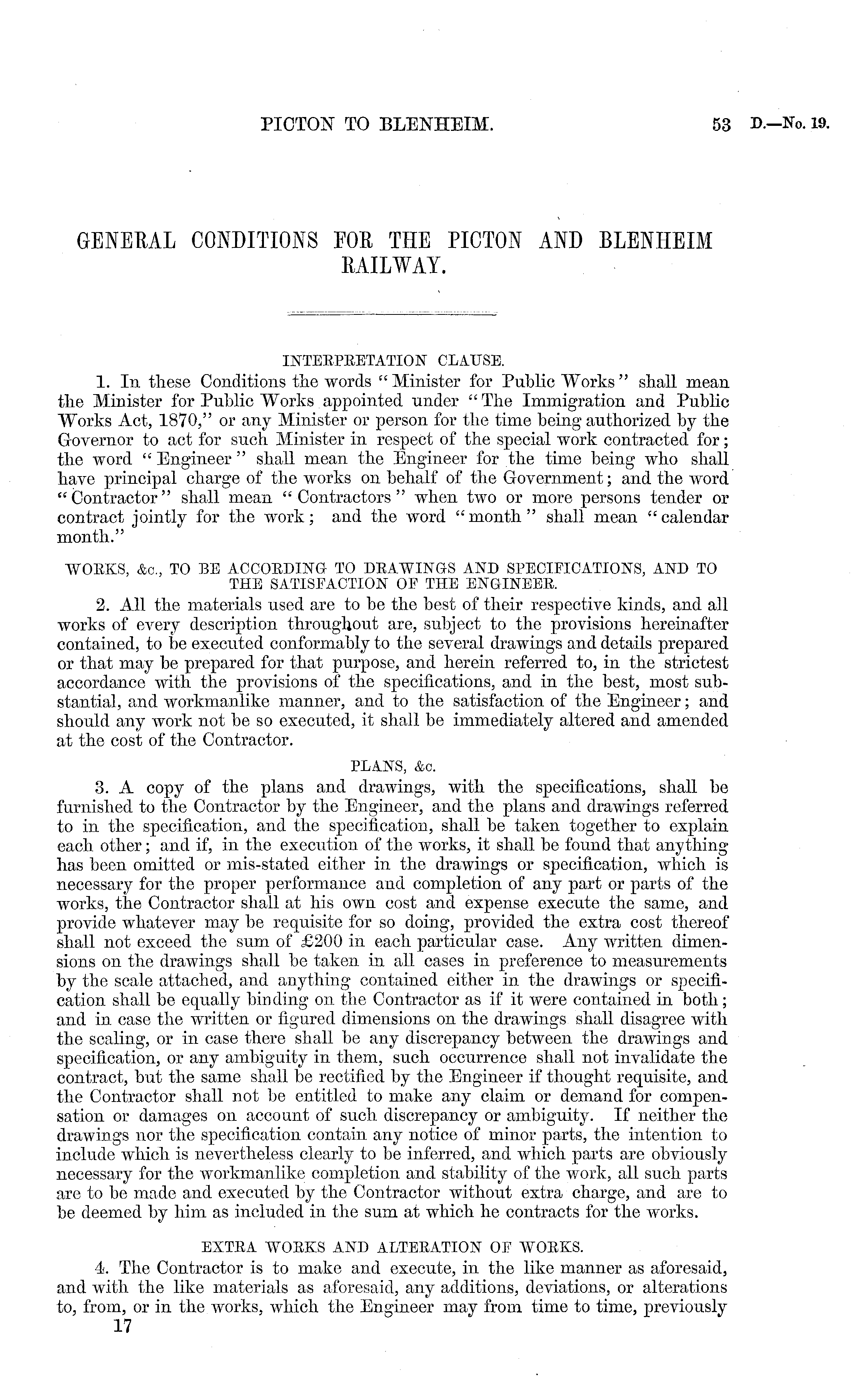 INTEEPEETATION CLAUSE. 1. In these Conditions the words "Minister for Public Works" shall mean the Minister for Public Works appointed under " The Immigration and Public Works Act, 1870," or any Minister or person for the time being authorized by the Governor to act for such Minister in respect of the special work contracted for; the word " Engineer " shall mean the Engineer for the time being who shall have principal charge of the works on behalf of the Government; and the word "Contractor" shall mean "Contractors" wdien two or more persons tender or contract jointly for the AA rork; and the word "month" shall mean "calendar month." WOEKS, &c, TO BE ACCOEDING TO DEAWINGS AND SPECIFICATIONS, AND TO THE SATISFACTION OF THE ENGINEEE. 2. All the materials used are to be the best of their respective kinds, and all works of every description throughout are, subject to the provisions hereinafter contained, to be executed conformably to the several drawings and details prepared or that may be prepared for that purpose, and herein referred to, in the strictest accordance with the provisions of the specifications, and in the best, most substantial, and workmanlike manner, and to the satisfaction of the Engineer; and should any Avork not be so executed, it shall be immediately altered and amended at the cost of the Contractor. PLANS, &c. 3. A copy of the plans and drawings, with the specifications, shall be furnished to the Contractor by the Engineer, and the plans and drawings referred to in the specification, and the specification, shall be taken together to explain each other; and if, in the execution of the works, it shall be found that anything has been omitted or mis-stated either in the draAvings or specification, which is necessary for the proper performance and completion of any part or parts of the works, the Contractor shall at his oavii cost and expense execute the same, and provide whatever may be requisite for so doing, provided the extra cost thereof shall not exceed the sum of £200 in each particular case. Any written dimensions on the drawings shall be taken in all cases in preference to measurements by the scale attached, and anything contained either in the drawings or specification shall be equally binding on the Contractor as if it Avere contained in both; and in case the written or figured dimensions on the drawings shall disagree with the scaling, or in case there shall be any discrepancy between the draAvings and specification, or any ambiguity in them, such occurrence shall not invalidate the contract, but the same shall be rectified by the Engineer if thought requisite, and the Contractor shall not be entitled to make any claim or demand for compensation or damages on account of such discrepancy or ambiguity. If neither the drawings nor the specification contain any notice of minor parts, the intention to include which is nevertheless clearly to be inferred, and which parts are obviously necessary for the workmanlike completion and stability of the work, all such parts are to be made and executed by the Contractor Avithout extra charge, and are to be deemed by him as included in the sum at Avhich he contracts for the works. ENTEA WOEKS AND ALTEEATION OF WOEKS. 4. The Contractor is to make and execute, in the like manner as aforesaid, and with the like materials as aforesaid, any additions, deviations, or alterations to, from, or in the works, which the Engineer may from time to time, previously 17