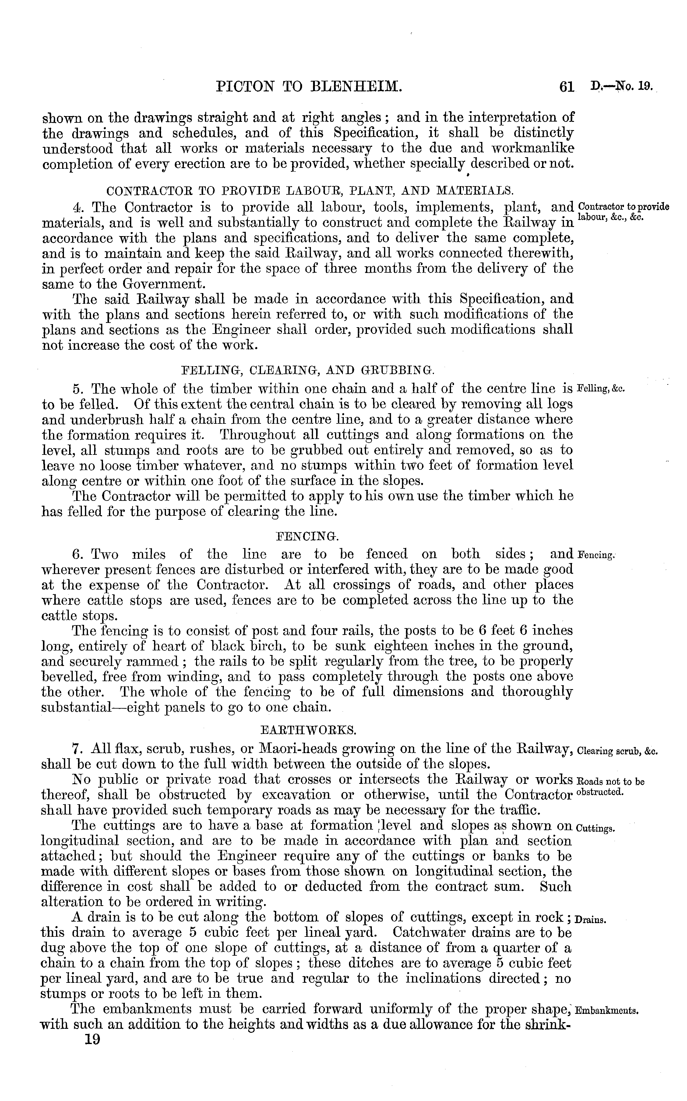 shoAvn on the drawings straight and at right angles ; and in the interpretation of the drawings and schedules, and of this Specification, it shall be distinctly understood that all works or materials necessary to the due and workmanlike completion of every erection are to be provided, whether specially described or not. CONTEACTOE TO PEOVIDE LABOUE, PLANT, AND MATEEIALS. 4. The Contractor is to provide all labour, tools, implements, plant, and materials, and is well and substantially to construct and complete the Railway in accordance with the plans and specifications, and to deliver the same complete, and is to maintain and keep the said Railway, and all works connected therewith, in perfect order and repair for the space of three months from the delivery of the same to the Government. The said Railway shall be made in accordance with this Specification, and with the plans and sections herein referred to, or with such modifications of the plans and sections as the Engineer shall order, provided such modifications shall not increase the cost of the work. FELLING, CLEAEING, AND GEUBBING. 5. The whole of the timber within one chain and a half of the centre line is to be felled. Of this extent the central chain is to be cleared by removing all logs and underbrush half a chain from the centre line, and to a greater distance where the formation requires it. Throughout all cuttings and along formations on the level, all stumps and roots are to be grubbed out entirely and removed, so as to leave no loose timber whatever, and no stumps within two feet of formation level along centre or within one foot of the surface in the slopes. The Contractor will be permitted to apply to his OAvn use the timber which he has felled for the purpose of clearing the line. FENCING. 6. Two miles of the line are to be fenced on both sides; and Avherever present fences are disturbed or interfered with, they are to be made good at the expense of the Contractor. At all crossings of roads, and other places where cattle stops are used, fences are to be completed across the line up to the cattle stops. The fencing is to consist of post and four rails, the posts to be 6 feet 6 inches long, entirely of heart of black birch, to be sunk eighteen inches in the ground, and securely rammed ; the rails to be split regularly from the tree, to be properly bevelled, free from winding, and to pass completely through the posts one above the other. The whole of the fencing to be of full dimensions and thoroughly substantial —eight panels to go to one chain. EAETHWOEKS. 7. All flax, scrub, rushes, or Maori-heads growing on the line of the Railway, shall be cut down to the full Avidth between the outside of the slopes. No public or private road that crosses or intersects the Railway or works thereof, shall be obstructed by excavation or otherwise, until the Contractor shall have provided such temporary roads as may be necessary for the traffic. The cuttings are to have a base at formation [ level and slopes as shown on longitudinal section, and are to be made in accordance with plan and section attached; but should the Engineer require any of the cuttings or banks to be made with different slopes or bases from those shown on longitudinal section, the difference in cost shall be added to or deducted from the contract sum. Such alteration to be ordered in writing. A drain is to be cut along the bottom of slopes of cuttings, except in rock;; this drain to average 5 cubic feet per lineal yard. Catchwater drains are to be dug above the top of one slope of cuttings, at a distance of from a quarter of a chain to a chain from the top of slopes ; these ditches are to average 5 cubic feet per lineal yard, and are to be true and regular to the inclinations directed; no stumps or roots to be left in them. The embankments must be carried forward uniformly of the proper shape, with such an addition to the heights and widths as a due allowance for the shrink--19
