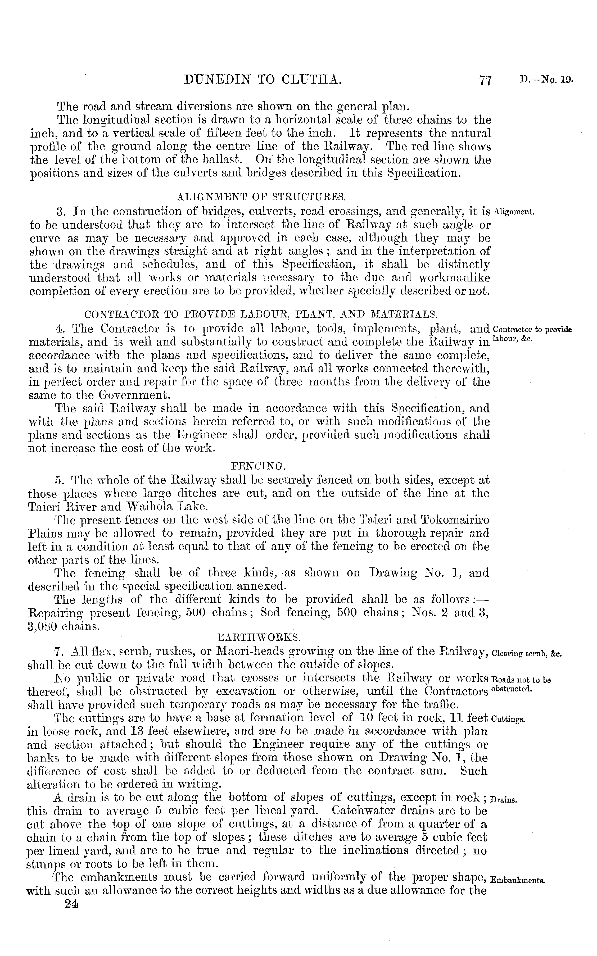 The road and stream diversions are shown on the general plan. The longitudinal section is drawn to a horizontal scale of three chains to the inch, and to a vertical scale of fifteen feet to the inch. It represents the natural profile of the ground along the centre line of the Raihvay. The red line shows the level of the bottom of the ballast. On the longitudinal section are shown the positions and sizes of the culverts and bridges described in this Specification. ALIGNMENT OF STRUCTURES. 3. In the construction of bridges, culverts, road crossings, and generally, it is to be understood that they are to intersect the line of Raihvay at such angle or curve as may be necessary and approved in each case, although they may be shown on the draAvings straight and at right angles ; and in the interpretation of the draAvings and schedules, and of this Specification, it shall be distinctly understood that all works or materials necessary to the clue and workmanlike completion of every erection are to be provided, whether specially described or not. CONTRACTOR TO PROVIDE LABOUR, PLANT, AND MATEEIALS. 4. The Contractor is to provide all labour, tools, implements, plant, and materials, and is well and substantially to construct and complete the Railway in accordance with the plans and specifications, and to deliver the same complete, and is to maintain and keep the said Raihvay, and all works connected therewith, in perfect order and repair for the space of three months from the delivery of the same to the Government. The said Raihvay shall be made in accordance with this Specification, and with the plans and sections herein referred to, or with such modifications of the plans and sections as the Engineer shall order, provided such modifications shall not increase the cost of the work. FENCING. 5. The Avhole of the Raihvay shall be securely fenced on both sides, except at those places where large ditches are cut, and on the outside of the line at the Taieri River and Waihola Lake. The present fences on the Avest side of the line on the Taieri and Tokomairiro Plains may be alloAved to remain, provided they are put in thorough repair and left in a condition at least equal to that of any of the fencing to be erected on the other parts of the lines. The fencing shall be of three kinds, as shown on Drawing No. 1, and described in the special specification annexed. The lengths of the different kinds to be provided shall be as follows:—■ Repairing present fencing, 500 chains; Sod fencing, 500 chains; Nos. 2 and 3, 3,080 chains. EAETHWORKS. 7. All flax, scrub, rushes, or Maori-heads growing on the line of the Raihvay, shall be cut down to the full width between the outside of slopes. No public or private road that crosses or intersects the Raihvay or works thereof, shall be obstructed by excavation or otherwise, until the Contractors' shall have provided such temporary roads as may be necessary for the traffic. The cuttings are to have a base at formation level of 10 feet in rock, 11 feet < in loose rock, and 13 feet elseAvhere, and are to be made in accordance with plan and section attached; but should the Engineer require any of the cuttings or banks to be made with different slopes from those shown on Drawing No. 1, the difference of cost shall be added to or deducted from the contract sum. Such alteration to be ordered in writing. A drain is to be cut along the bottom of slopes of cuttings, except in rock ; ] this drain to average 5 cubic feet per lineal yard. Catchwater drains are to be cut above the top of one slope of cuttings, at a distance of from a quarter of a chain to a chain from the top of slopes ; these ditches are to average 5 cubic feet per lineal yard, and are to be true and regular to the inclinations directed; no stumps or roots to be left in them. The embankments must be carried forward uniformly of the proper shape, ] with such an allowance to the correct heights and widths as a due alloAvance for the 24