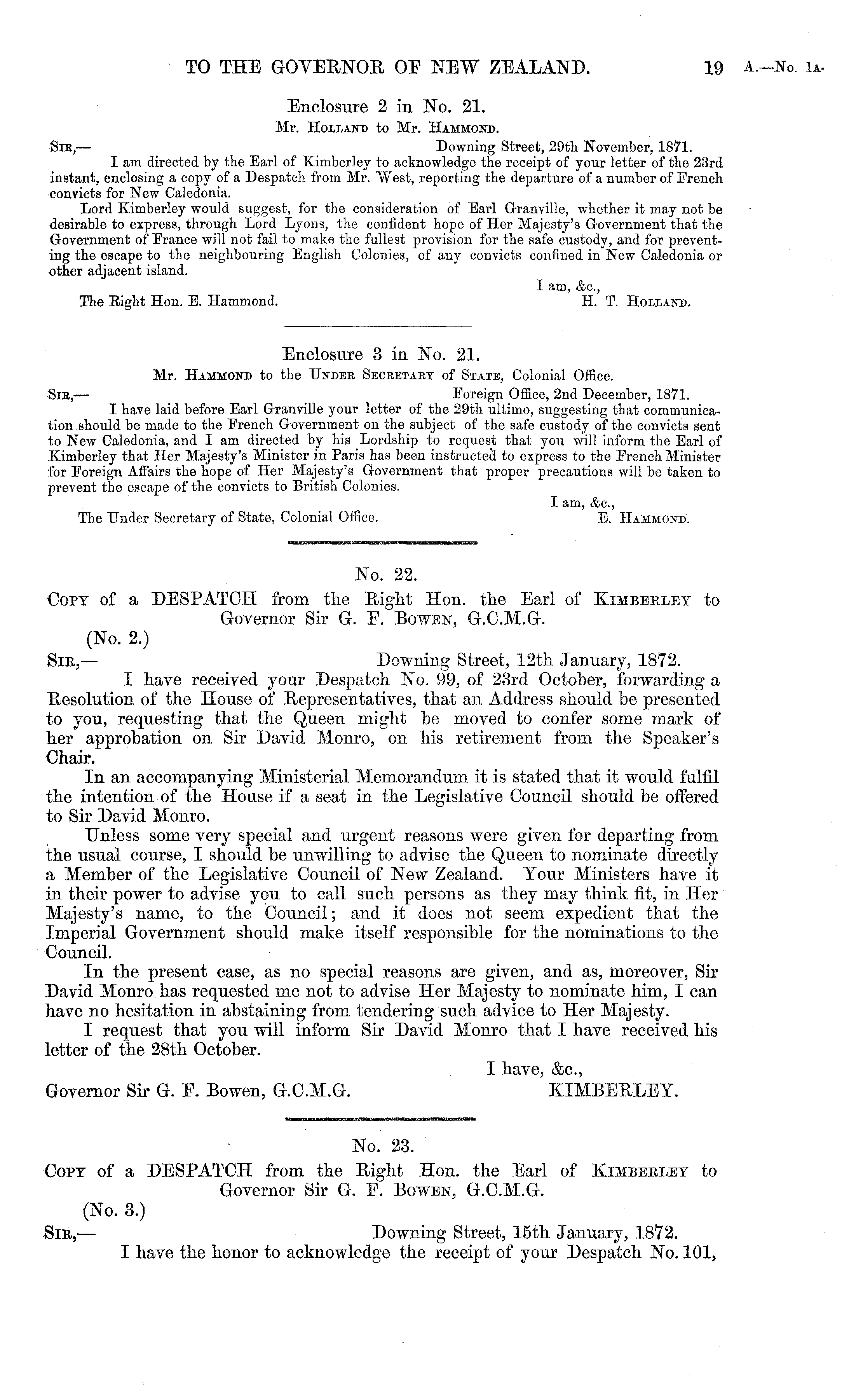 Enclosure 3 in No. 21. Mr. Hammond to the Under Secretaey of State, Colonial Office. Sib,— Foreign Office, 2nd December, 1871. I have laid before Earl Granville your letter of the 29th ultimo, suggesting that communication should be made to the French Government on the subject of the safe custody of the convicts sent to New Caledonia, and I am directed by his Lordship to request that you will inform tho Earl of Kimberley that Her Majesty's Minister in Paris has been instructed to express to the French Minister for Foreign Affairs the hope of Her Majesty's Government that proper precautions will be taken to prevent the escape of the convicts to British Colonies. I am, &c, The Under Secretary of State, Colonial Office. E. Hammond'. No. 22. Copy of a DESPATCH from the Right Hon. the Earl of Kimberley to Governor Sir G. E. Bowen, G.C.M.G. (No. 2.) Sir, — Downing Street, 12th January, 1872. I have received your Despatch No. 99, of 23rd October, forwarding a Resolution of the House of Representatives, that an Address should be presented to you, requesting that the Queen might he moved to confer some mark of her approbation on Sir David Monro, on his retirement from the Speaker's Chair. In an accompanying Ministerial Memorandum it is stated that it would fulfil the intention of the House if a seat in the Legislative Council should be offered to Sir David Monro. Unless some very special and urgent reasons were given for departing from the usual course, I should be unwilling to advise the Queen to nominate directly a Member of the Legislative Council of New Zealand. Your Ministers have it in their power to advise you to call such persons as they may think fit, in Her Majesty's name, to the Council; and it docs not seem expedient that the Imperial Government should make itself responsible for the nominations to the Council. In the present case, as no special reasons are given, and as, moreover, Sir David Monro has requested me not to advise Her Majesty to nominate him, I can have no hesitation in abstaining from tendering such advice to Her Majesty. I request that you will inform Sir David Monro that I have received his letter of the 28th October. I have, &c, Governor Sir G. E. Bowen, G.C.M.G. KIMBERLEY.