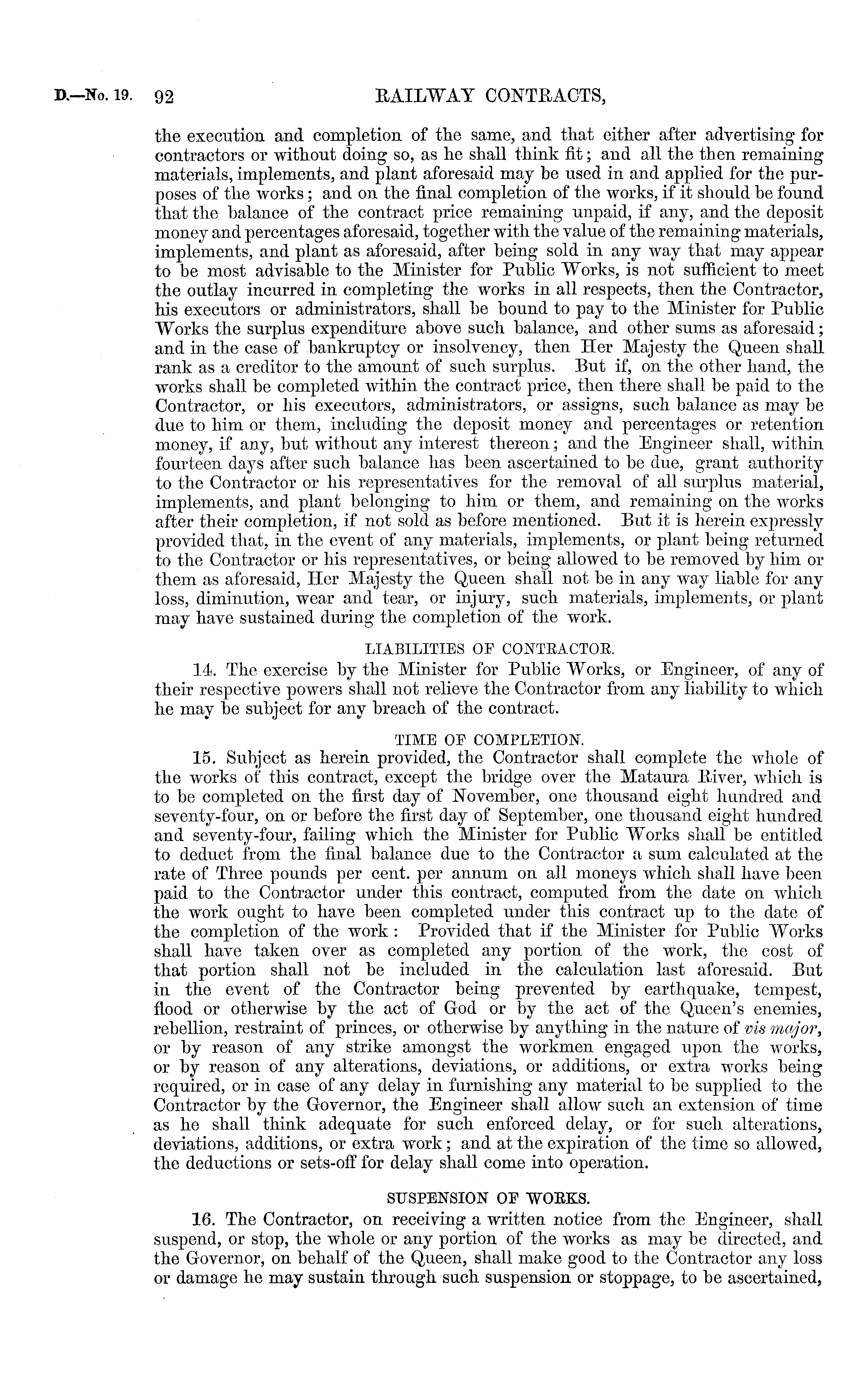 the execution and completion of the same, and that either after advertising for contractors or without doing so, as he shall think fit; and all the then remaining materials, implements, and plant aforesaid may be used in and applied for the purposes of the works; and on the final completion of the works, if it should be found that the balance of the contract price remaining unpaid, if any, and the deposit money and percentages aforesaid, together with the value of the remaining materials, implements, and plant as aforesaid, after being sold in any way that may appear to be most advisable to the Minister for Public Works, is not sufficient to meet the outlay incurred in completing the works in all respects, then the Contractor, his executors or administrators, shall be bound to pay to the Minister for Public Works the surplus expenditure above such balance, and other sums as aforesaid; and in the case of bankruptcy or insolvency, then Her Majesty the Queen shall rank as a creditor to the amount of such surplus. But if, on the other hand, the works shall be completed Avithin the contract price, then there shall be paid to the Contractor, or his executors, administrators, or assigns, such balance as may be due to him or them, including the deposit money and percentages or retention money, if any, but without any interest thereon; and the Engineer shall, Avithin fourteen days after such balance has been ascertained to be due, grant authority to the Contractor or his representatives for the removal of all surplus material, implements, and plant belonging to him or them, and remaining on the Avorks after their completion, if not sold as before mentioned. But it is herein expressly provided that, in the event of any materials, implements, or plant being returned to the Contractor or his representatives, or being allowed to be removed by him or them as aforesaid, Her Majesty the Queen shall not be in any way liable for any loss, diminution, wear and tear, or injury, such materials, implements, or plant may have sustained during the completion of the work. LIABILITIES OF CONTEACTOE. 14. The exercise by the Minister for Public Works, or Engineer, of any of their respective powers shall not relieve the Contractor from any liability to which he may be subject for any breach of the contract. TIME OF COMPLETION. 15. Subject as herein provided, the Contractor shall complete the Avhole of the works of this contract, except the bridge over the Mataura River, AA'hich is to be completed on the first day of November, one thousand eight hundred and seventy-four, on or before the first day of September, one thousand eight hundred and seventy-four, failing which the Minister for Public Works shall be entitled to deduct from the final balance due to the Contractor a sum calculated at the rate of Three pounds per cent, per annum on all moneys AA rhich shall have been paid to the Contractor under this contract, computed from the date on AAliich the work ought to have been completed under this contract up to the date of the completion of the Avork: Provided that if the Minister for Public Works shall have taken over as completed any portion of the work, the cost of that portion shall not be included in the calculation last aforesaid. But in the event of the Contractor being prevented by earthquake, tempest, flood or otherwise by the act of God or by the act of the Queen's enemies, rebellion, restraint of princes, or otherwise by anything in the nature of vis major, or by reason of any strike amongst the workmen engaged upon the Avorks, or by reason of any alterations, deviations, or additions, or extra Avorks being required, or in case of any delay in furnishing any material to be supplied to the Contractor by the Governor, the Engineer shall alloAv such an extension of time as he shall think adequate for such enforced delay, or for such alterations, deviations, additions, or extra work; and at the expiration of the time so allowed, the deductions or sets-off for delay shall come into operation. SUSPENSION OF WOEKS. 16. The Contractor, on receiving a Avritten notice from the Engineer, shall suspend, or stop, the whole or any portion of the works as may be directed, and the Governor, on behalf of the Queen, shall make good to the Contractor any loss or damage he may sustain through such suspension or stoppage, to be ascertained,