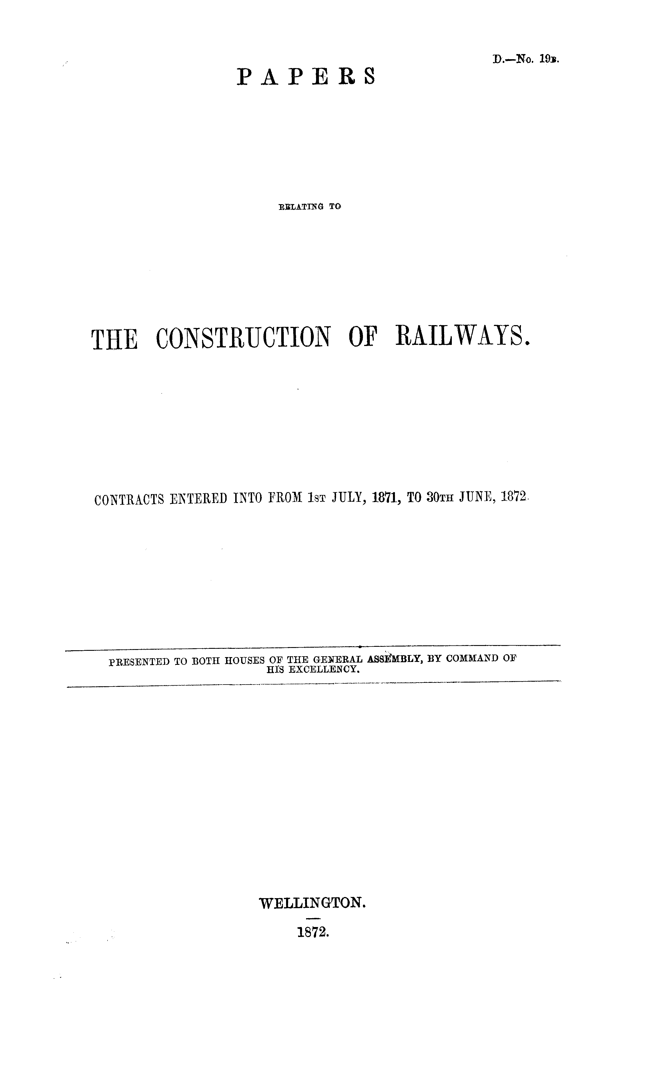 PAPERS RELATING TO THE CONSTRUCTION OF RAILWAYS. CONTRACTS ENTERED INTO FROM 1st JULY, 1871, TO 30TH JUNE, 1872.