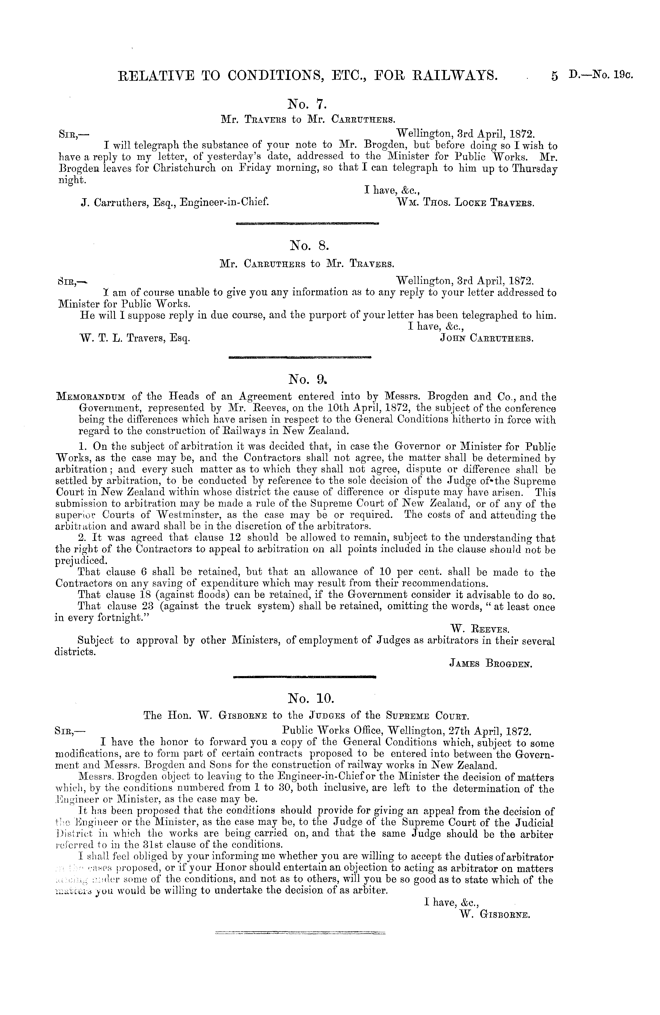 No. 7. Mr. Travers to Mr. Carruthers. Sir,— Wellington, 3rd April, 1872. I will telegraph the substance of your note to Mr. Brogden, but before doing so I wish to have a reply to my letter, of yesterday's date, addressed to the Minister for Public Works. Mr. Brogden leaves for Christchurch on Friday morning, so that I can telegraph to him up to Thursday night. I have, &c, J. Carruthers, Esq., Engineer-in-Chief. Wit Thos. Locke Travers.