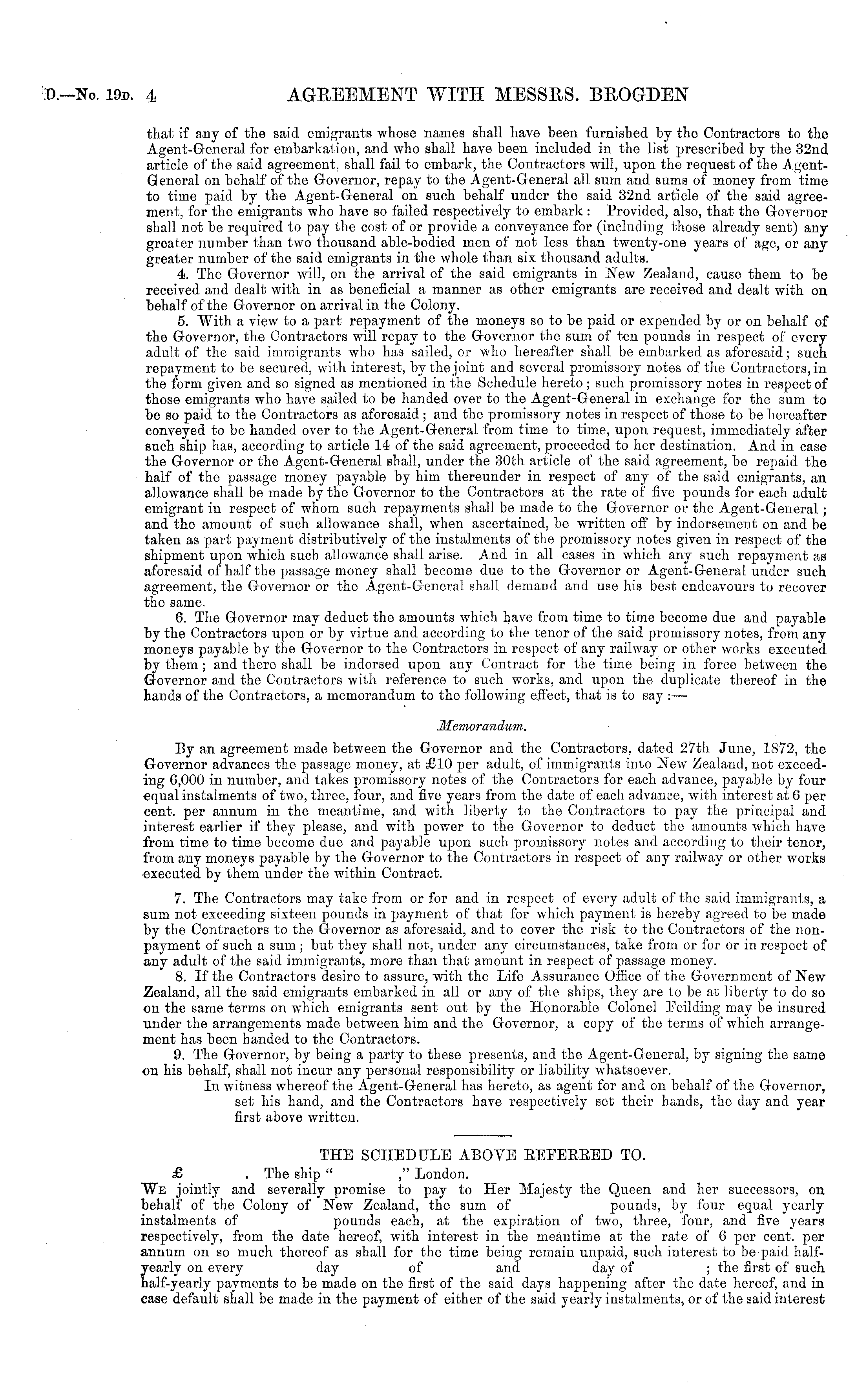 that if any of the said emigrants whose names shall have been furnished by the Contractors to the Agent-General for embarkation, and who shall have been included in the list prescribed by the 32nd article of the said agreement, shall fail to embark, the Contractors will, upon the request of the AgentGenoral on behalf of the Governor, repay to the Agent-General all sum and sums of money from time to time paid by the Agent-General on such behalf under the said 32nd article of the said agreement, for the emigrants who have so failed respectively to embark : Provided, also, that the Governor shall not be required to pay the cost of or provide a conveyance for (including those already sent) any greater number than two thousand able-bodied men of not less than twenty-one years of age, or any greater number of the said emigrants in the whole than six thousand adults. 4. The Governor will, on the arrival of the said emigrants in New Zealand, cause them to be received and dealt with in as beneficial a manner as other emigrants are received and dealt with on behalf of the Governor on arrival in the Colony. 5. With a view to a part repayment of the moneys so to be paid or expended by or on behalf of the Governor, the Contractors will repay to the Governor the sum of ten pounds in respect of every adult of the said immigrants who has sailed, or who hereafter shall be embarked as aforesaid; such repayment to be secured, with interest, by the joint and several promissory notes of the Contractors, in the form given and so signed as mentioned in the Schedule hereto ; such promissory notes in respect of those emigrants who have sailed to be handed over to the Agent-General in exchange for the sum to be so paid to the Contractors as aforesaid ; and the promissory notes in respect of those to be hereafter conveyed to be handed over to the Agent-General from time to time, upon request, immediately after such ship has, according to article 14 of the said agreement, proceeded to her destination. And in case the Governor or the Agent-General shall, under the 30th article of the said agreement, be repaid the half of the passage money payable by him thereunder in respect of any of the said, emigrants, an allowance shall be made by the Governor to the Contractors at the rate of five pounds for each adult emigrant in respect of whom such repayments shall be made to the Governor or the Agent-General; and the amount of such allowance shall, when ascertained, be written off by indorsement on and be taken as part payment distributively of the instalments of the promissory notes given in respect of the shipment upon which such allowance shall arise. And in all cases in which any such repayment as aforesaid of half the passage money shall become due to the Governor or Agent-General under such agreement, the Governor or the Agent-General shall demand and use his best endeavours to recover the same. 6. The Governor may deduct the amounts which have from time to time become due and payable by the Contractors upon or by virtue and according to the tenor of the said promissory notes, from any moneys payable by the Governor to the Contractors in respect of any railway or other works executed by them ; and there shall be indorsed upon any Contract for the time being in force between the Governor and the Contractors with reference to such works, and upon the duplicate thereof in the hands of the Contractors, a memorandum to the following effect, that is to say :— Memorandum. By an agreement made between the Governor and the Contractors, dated 27th June, 1872, the Governor advances the passage money, at £10 per adult, of immigrants into New Zealand, not exceeding 6,000 in number, and takes promissory notes of the Contractors for each advance, payable by four equal instalments of two, three, four, and five years from tho date of each advance, with interest at 6 per cent, per annum in the meantime, and with liberty to tho Contractors to pay the principal and interest earlier if they please, and with power to the Governor to deduct the amounts which have from time to time become due and payable upon such promissory notes and according to their tenor, from any moneys payable by the Governor to the Contractors in respect of any railway or other works executed by them under the within Contract. 7. The Contractors may take from or for and in respect of every adult of the said immigrants, a sum not exceeding sixteen pounds in payment of that for which payment is hereby agreed to be made by the Contractors to the Governor as aforesaid, and to cover the risk to the Contractors of the nonpayment of such a sum ; but they shall not, under any circumstances, take from or for or in respect of any adult of the said immigrants, more than that amount in respect of passage money. 8. If the Contractors desire to assure, with the Life Assurance Office of the Government of New Zealand, all the said emigrants embarked in all or any of the ships, they are to be at liberty to do so on the same terms on which emigrants sent out by the Honorable Colonel Feilding may be insured under the arrangements made between him and the Governor, a copy of the terms of which arrangement has been handed to the Contractors. 9. The Governor, by being a party to these presents, and the Agent-General, by signing the same on his behalf, shall not incur any personal responsibility or liability whatsoever. In witness whereof the Agent-General has hereto, as agent for and on behalf of the Governor, set his hand, and the Contractors have respectively set their hands, the day and year first above written.