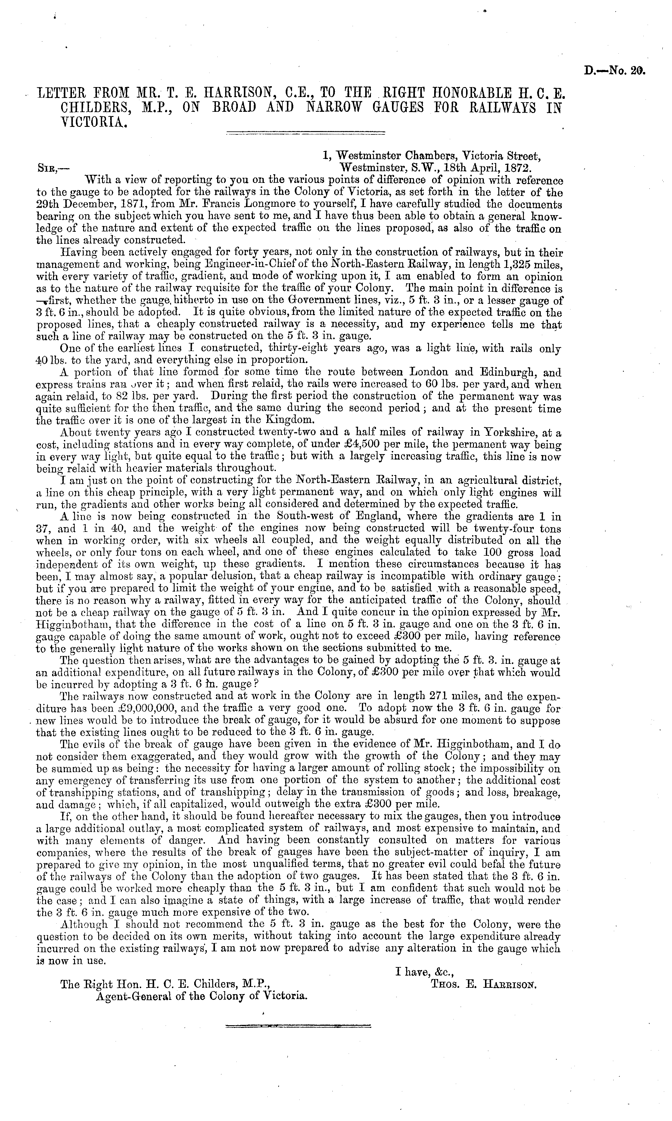LETTER FROM MR. T. E. HARRISON, C.E., TO THE RIGHT HONORABLE H. C. E. GUILDERS, M.P., ON BROAD AND NARROW GAUGES FOR RAILWAYS IN VICTORIA.