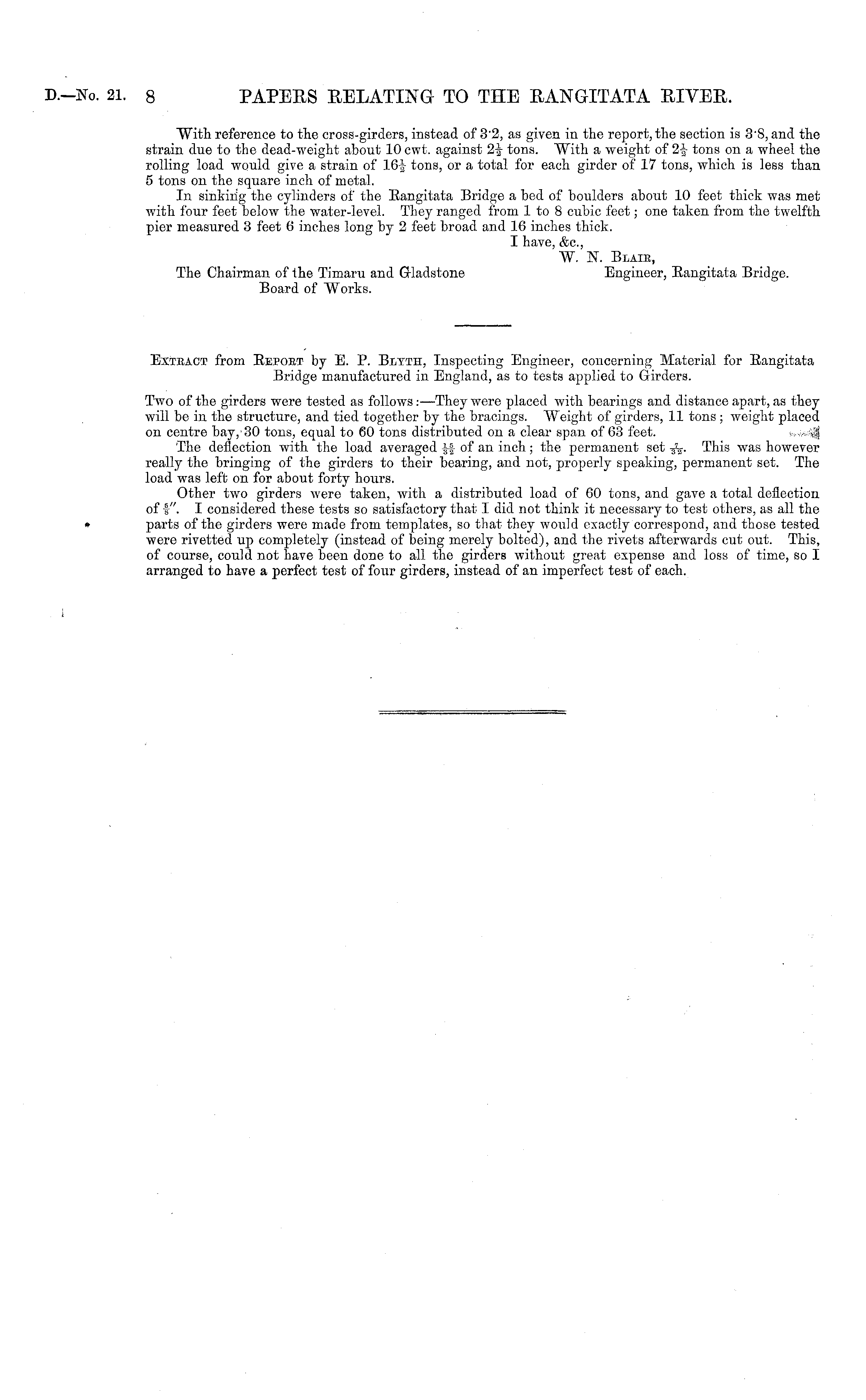 With reference to the cross-girders, instead of 32, as given in the report, the section is 3'B, and the strain due to the dead-weight about 10 cwt. against 2-3- tons. With a weight of 2f tons on a wheel the rolling load would give a strain of 16-J tons, or a total for each girder of 17 tons, which is less than 5 tons on the square inch of metal. In sinkmg the cylinders of the Rangitata Bridge a bed of boulders about 10 feet thick was met with four feet below the water-level. They ranged from Ito 8 cubic feet; one taken from the twelfth pier measured 3 feet 6 inches long by 2 feet broad and 16 inches thick. I have, &c, W. N. Blaie, The Chairman of the Timaru and Gladstone Engineer, Rangitata Bridge. Board of Works.