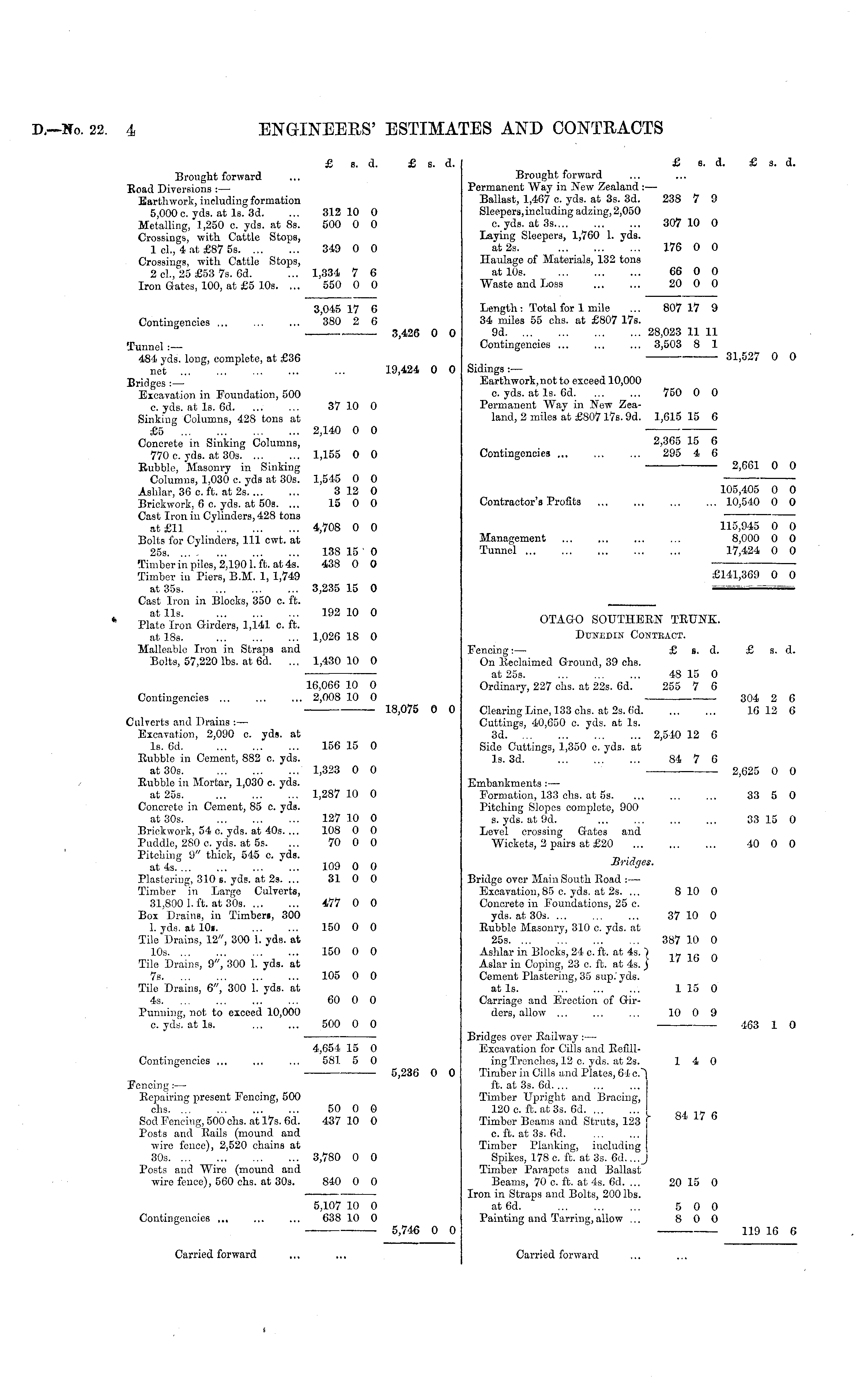 £ s. d. £ s. d. £ s. d. £ s. d. Brought forward ... Brought forward Road Diversions :— Permanent Way in New Zealand : — Earthwork, including formation Ballast, 1,467 c. yds. at 3s. 3d. 238 7 9 5,000 c. yds. at Is. 3d. ... 312 10 0 Sleepers,including adzing,2,oso Metalling, 1,250 c. yds. at Bs. 500 0 0 c. yds. at 3s 307 10 0 Crossings, with Cattle Stops, Laying Sleepers, 1,760 1. yds. 1 cl., 4at £87 5s 349 0 0 at 2s. 176 0 0 Crossings, with Cattle Stops, Haulage of Materials, 132 tons 2 cl., 25 £53 7s. 6d. ... 1,334 7 6 at 10s 66 0 0 Iron Gates, 100, at £5 10s. ... 550 0 0 Waste and Loss 20 0 0 3,045 17 6 Length: Total for 1 mile ... 807 17 9 Contingencies 380 2 6 34 miles 55 chs. at £807 17s. . — 3,426 0 0 9d 28,023 11 11 Tunnel : Contingencies ... ... ... 3,503 8 1 484 yds. long, complete, at £36 31,527 0 0 net ... 19,424 0 0 Sidings:— Bridges : Earthwork,not to exceed 10,000 Excavation in Foundation, 500 c. yds. at Is. 6d 750 0 0 c. yds. at Is. 6d. ... ... 37 10 0 Permanent Way in New ZeaSinkiug Columns, 428 tons at land, 2 miles at £807175. 9d. 1,615 15 6 £5 2,140 0 0 Concrete in Sinking Columns, 2,365 15 6 770 c. yds. at 30s 1,155 0 0 Contingencies 295 4 6 Rubble, Masonry in Sinking 2,661 0 0 Columns, 1,030 c. yds at 30s. 1,545 0 0 Ashlar, 36 c. ft. at 2s 3 12 0 105,405 0 0 Brickwork, 6c. yds. at 50s. ... 15 0 0 Contractor's Profits 10,540 0 0 Cast Iron in Cylinders, 428 tons at £11 4,708 0 0 115,945 0 0 Bolts for Cylinders, 111 cwt. at Management 8,000 0 0 25s 138 15 0 Tunnel 17,424 0 0 Timber in piles, 2,1901. ft. at 4s. 438 0 0 Timber in Piers, B.M. 1, 1,749 £141,369 0 0 at 35s 3,235 15 0 __ Cast Iron in Blocks, 350 c. ft. « Platoon Girders, 1,141 c. ft. ™ '° OTAGO SOUTHERN TRUNK. at 18s 1,026 18 0 Dukgdin Conteact. Malleable Iron in Straps and Fencing:— £ s. d. £ s. d. Bolts, 57,220 lbs. at 6d. ... 1,430 10 0 On Reclaimed Ground, 39 chs. at 255. 48 15 0 16,066 10 0 Ordinary, 227 chs. at 225. 6d. 255 7 6 Contingencies 2,008 10 0 . 304 2 6 18,075 0 0 Clearing Line, 133 chs. at 2s. (id 16 12 6 Culverts and Drains : — Cuttings, 40,650 c. yds. at Is. Excavation, 2,090 c. yds. at 3d 2,540 12 6 Is. 6d 156 15 0 Side Cuttings, 1,350 c. yds. at Rubble in Cement, 882 c. yds. Is. 3d 84 7 6 at 30s 1,323 0 0 2,025 0 0 Rubble in Mortar, 1,030 c. yds. Embankments : — at 25s 1,287 10 0 Formation, 133 chs. at 5s 33 5 0 Concrete in Cement, 85 c. yds. Pitching Slopes complete, 900 at 30s 127 10 0 s . yds. at 9d. 33 15 0 Brickwork, 54 c. yds. at 40s. ... 108 0 0 Level crossing Gates and Puddle, 280 c. yds. at ss. ... 70 0 0 Wickets, 2 pairs at £20 40 0 0 Pitching 9" thick, 545 c. yds. „ ~ at 4s. ... 109 0 0 Bridges. Plastering, 310 s. yds. at 2s. ... 31 0 0 Bridge over Main South Road : — Timber in Large Culverts, Excavation,Bs c. yds. at 2s. ... 810 0 31,800 1. ft. at 30s 477 0 0 Concrete in Foundations, 25 c. Box Drains, in Timbers, 300 yds. at 30s 37 10 0 1. yds. at 10s. 150 0 0 Rubble Masonry, 310 c. yds. at Tile Drains, 12", 300 1. yds. at 25s 387 10 0 10s 150 0 0 Ashlar in Blocks, 24 c. ft. at 45.) ~. ... . Tile Drains, 9", 300 1. yds. at Aslar in Coping, 23 c. ft. at 4s. j J-' J-0 " 7s. ... ... ... ... 105 0 0 Cement Plastering,3s sup.'yds. Tile Drains, 6", 300 1. yds. at at Is. 1 15 0 4s. ... ... ... ... 60 0 0 Carriage and Erection of GirPunning, not to exceed 10,000 ders, allow ... ... ... 10 0 9 c. yds. at Is. 500 0 0 463 1 0 Bridges over Railway : — 4,654 15 0 Excavation for Gills and RefillContingencies ... ... ... 581 5 0 ing Trenches, 12 c. yds. at 2s. 14 0 5,236 0 0 Timber in Oills and Plates, 64 0.7 Fencing: — ft. at 3s. 6d. ... Repairing present Fencing, 500 Timber Upright and Bracing, chs 50 0 0 120 c. ft. at 3s. 6d I . * Sod Fencing, 500 chs. at 17s. 6d. 437 10 0 Timber Beams and Struts, 123 [ b 7 b Posts and Rails (mound and c. ft. at 3s. 6d. wire fence), 2,520 chains at Timber Planking, including 30s 3,780 0 0 Spikes, 178 c. ft. at 3s. 6d.... J Posts and Wire (mound and Timber Parapets and Ballast wire fence), 560 chs. at 30s. 840 0 0 Beams, 70 c. ft. at 4s. 6d. ... 20 15 0 Iron in Straps and Bolts, 200 lbs. 5,107 10 0 at 6d. 5 0 0 Contingencies ... 638 10 0 Painting and Tarring,allow ... 8 0 0 5,746 0 0 119 16 6 Carried forward ... ... Carried forward