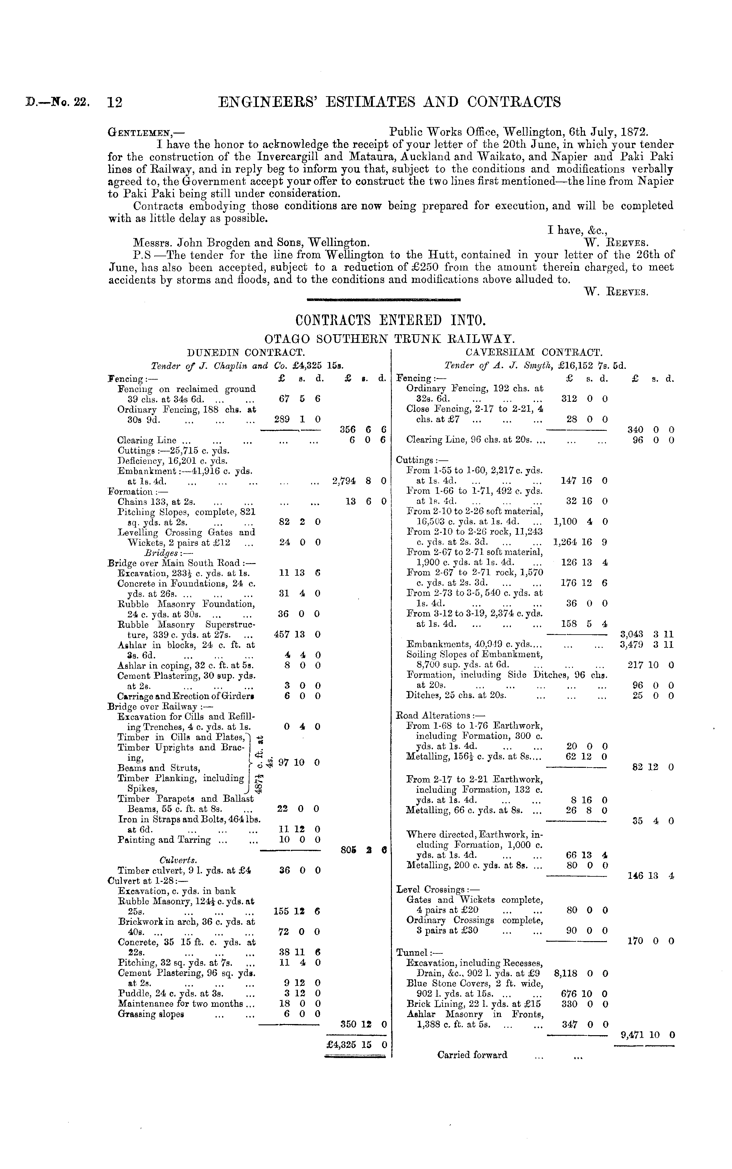 Gentlemen, — Public Works Office, Wellington, 6th July, 1872. I have the honor to acknowledge the receipt of your letter of the 20th June, in which your tender for the construction of the Invercargill and Mataura, Auckland and Waikato, and Napier and Paki Paki lines of Railway, and in reply beg to inform you that, subject to the conditions and modifications verbally agreed to, the Government accept your offer to construct the two lines first mentioned—the line from Napier to Paki Paki being still under consideration. Contracts embodying those conditions are now being prepared for execution, and will be completed with as little delay as possible. I have, Ac, Messrs. John Brogden and Sons, Wellington. W. Reeves. P.S —The tender for the line from Wellington to the Hutt, contained in your letter of the 26th of June, has also been accepted, subject to a reduction of £250 from the amount therein charged, to meet accidents by storms and floods, and to the conditions and modifications above alluded to. W. Reeves.