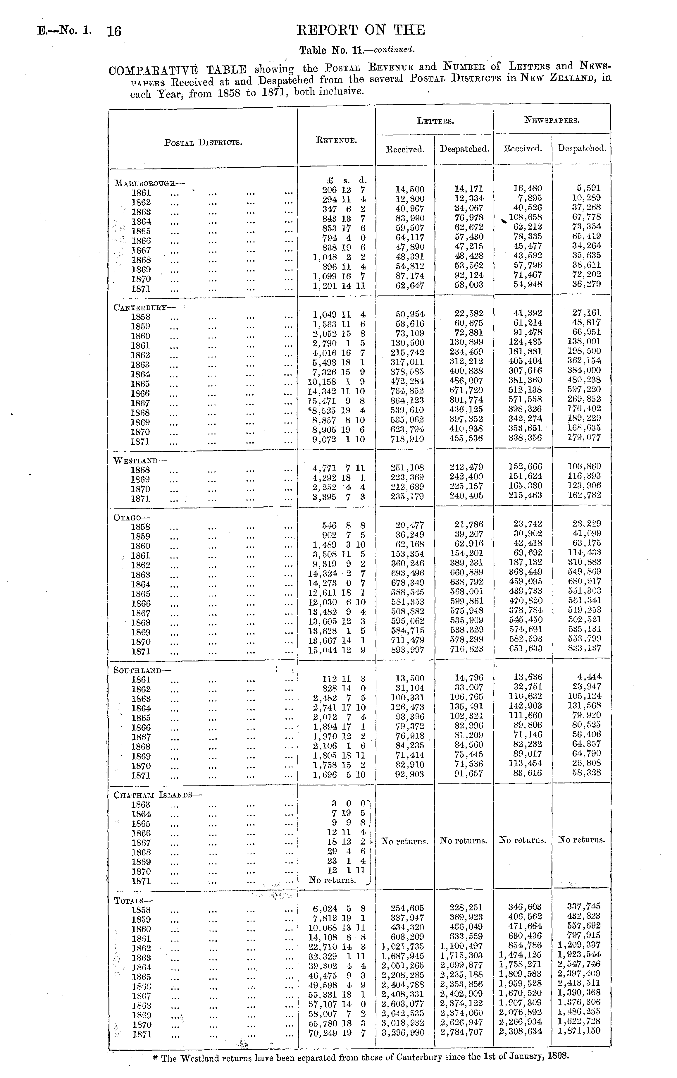 Table No. 11. — continued. COMPARATIVE TABLE showing the POSTAL REVENUE and NUMBER of LETTERS and NEWSPAPERS Received at and Despatched from the several POSTAL DISTRICTS in NEW ZEALAND, in each Year, from 1858 to 1871, both inclusive.