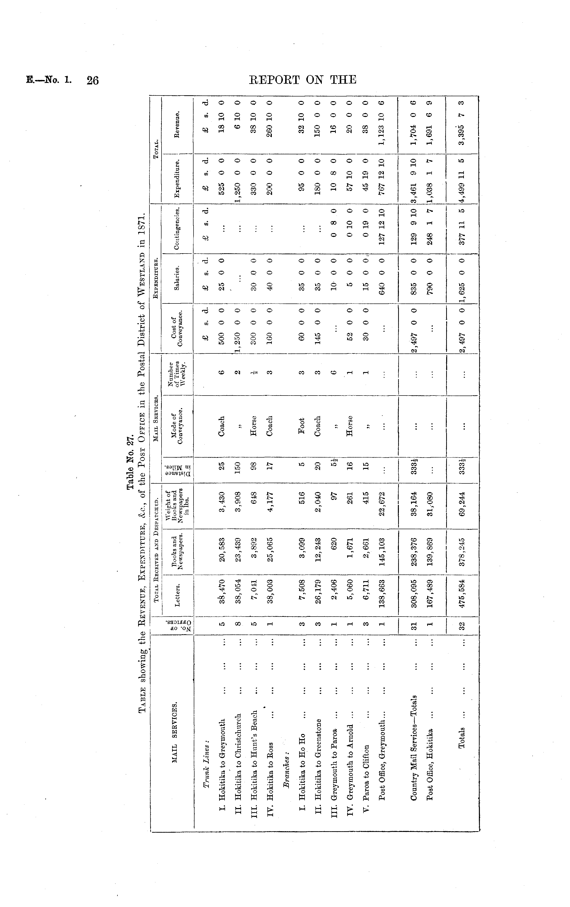 Total Ri iceived and Despatched. Mail Services. Expenditure. Total. MAIL SERVICES. &. ft 6 ft 550 Letters. Hooks and Newspapers. Weight of Hooks and Newspapers in lbs. ® A 5.5 Mode of Conveyance. Number of Times Weekly. Cost of Conveyance. Salaries. Contingencies. Expenditure. Revenue. Trunk Lines : £ s. d. £ s. d. £ s. d. £ s. d. £ s. d. I. Hokitika to Greymouth 5 38,470 20,583 3,430 25 Coach 6 500 0 0 25 0 0 525 0 0 18 10 0 II. Hokitika to Christchurch 8 38,054 j 23,439 I 3,908 150 2 1,250 0 0 1,250 0 0 6 10 0 III. Hokitika to Hunt's Beach 5 7,011 3,892 618 98 Horse ■1 300 0 0 30 0 0 330 0 0 38 10 0 IV. Hokitika to Eoss 1 38,003 25,065 4,177 17 Coach 3 1G0 0 0 40 0 0 200 0 0 260 10 0 Branches : Foot 3 60 0 0 35 0 0 95 0 0 32 10 0 I. Hokitika to Ho Ho 7,508 3,099 516 3 5 II. Hokitika to Greenstone 3 26,179 12,243 2,040 20 Coach 3 145 0 0 35 0 0 180 0 0 150 0 0 III. Greymouth to Paroa 1 2,406 620 97 51 6 10 0 0 0 8 0 10 8 0 16 0 0 IV. Greymouth to Arnold ... 1 5,060 1,671 261 16 Horse 1 52 0 0 5 0 0 0 10 0 57 10 0 20 0 0 V. Paroa to Clifton 3 6,711 j 2,661 415 15 1 30 0 0 15 0 0. 0 19 0 45 19 0 38 0 0 Post Office, Greymouth... 1 138,663 145,103 22,672 ... 640 0 0 127 12 10 7G7 12 10 1,123 10 6 Country Mail Services —Totals 31 308,095 238,376 1,704 0 6 38,164 333| 2,497 0 0 835 0 0 129 9 10 3,461 9 10 Post Office, Hokitika 1 i j 167, 4S9 j j 139,869 31,080 790 0 0 248 1 7 1,038 1 7 1,691 6 9 Totals 32 j 475,584 378,245 69,244 333J i 377 11 5 4,499 11 5 3,395 7 3 12,497 0 0 1,625 0 0